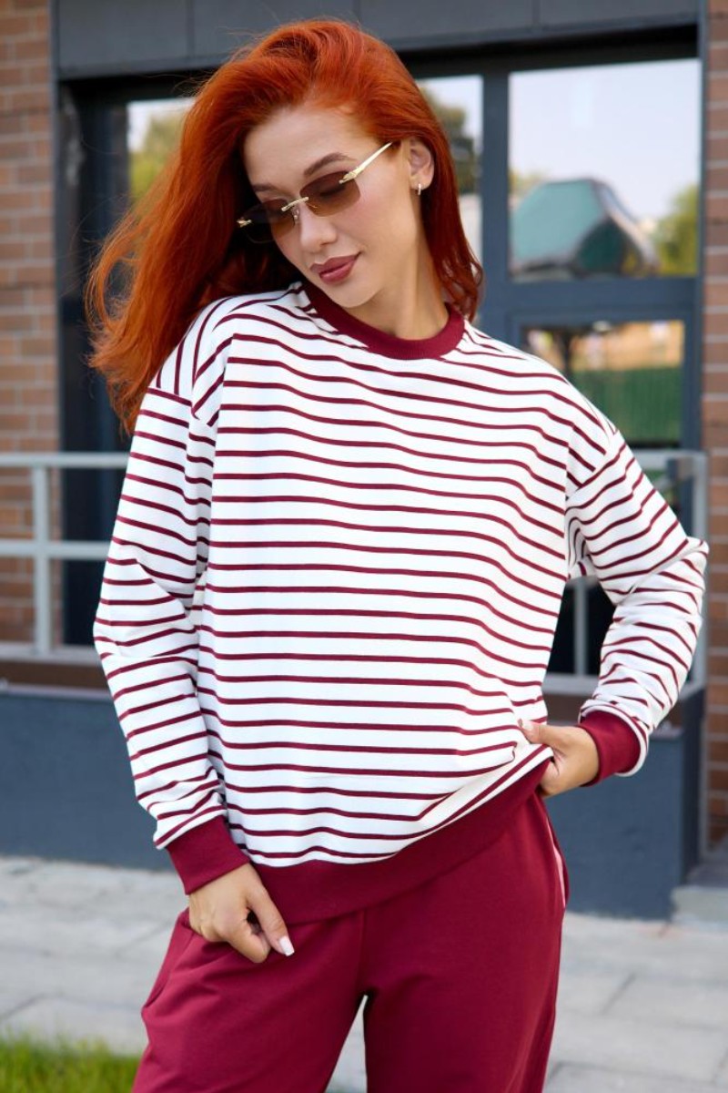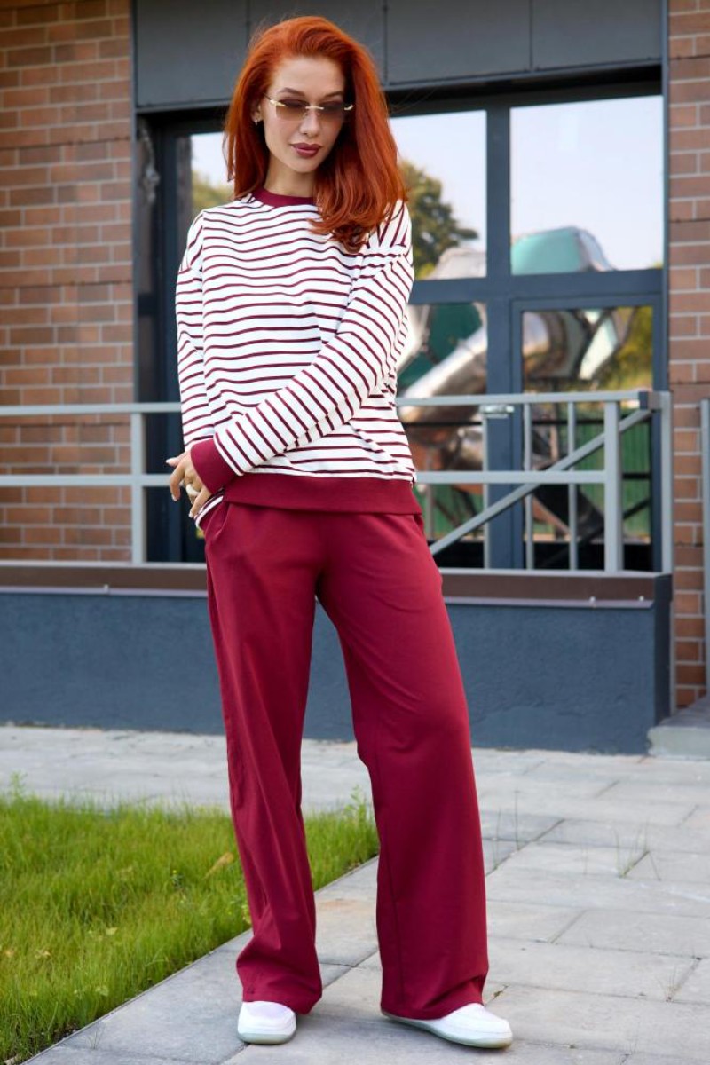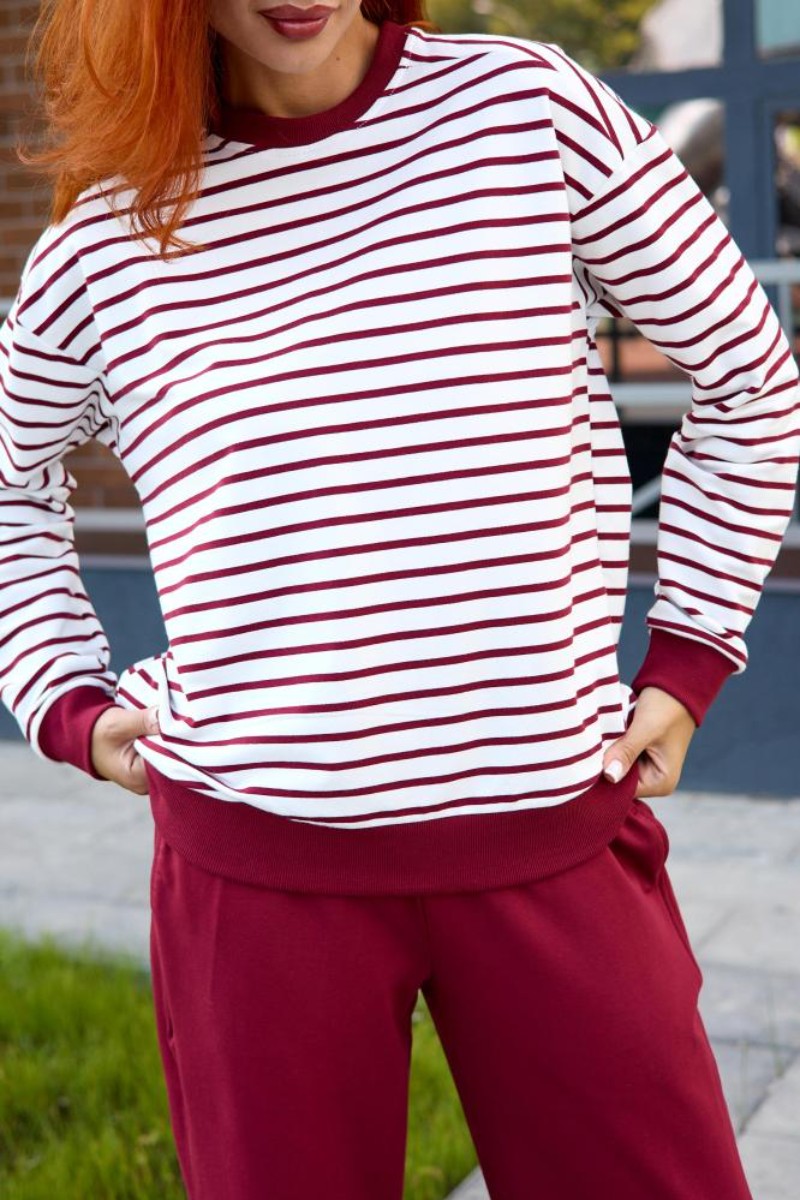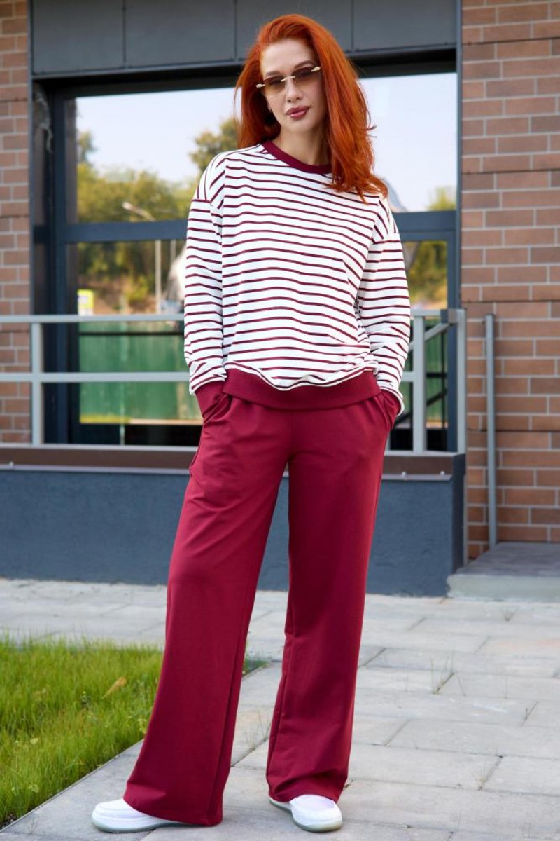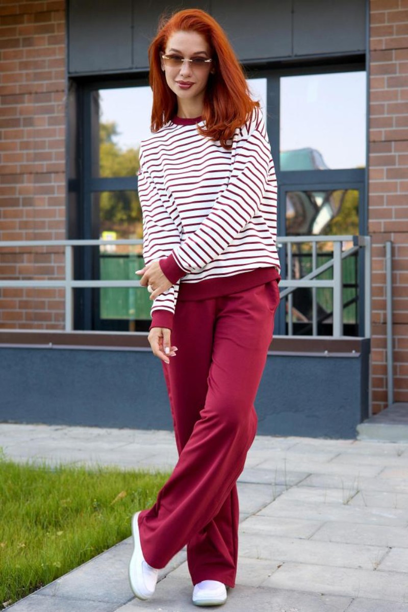 Представляем Вашему вниманию женский костюм двойку, который состоит из однотонных брюк и свитшота в тонкую полоску. Комплект обеспечит полную свободу движений в повседневной носке. В нём Вы будете чувствовать себя комфортно и уверенно.