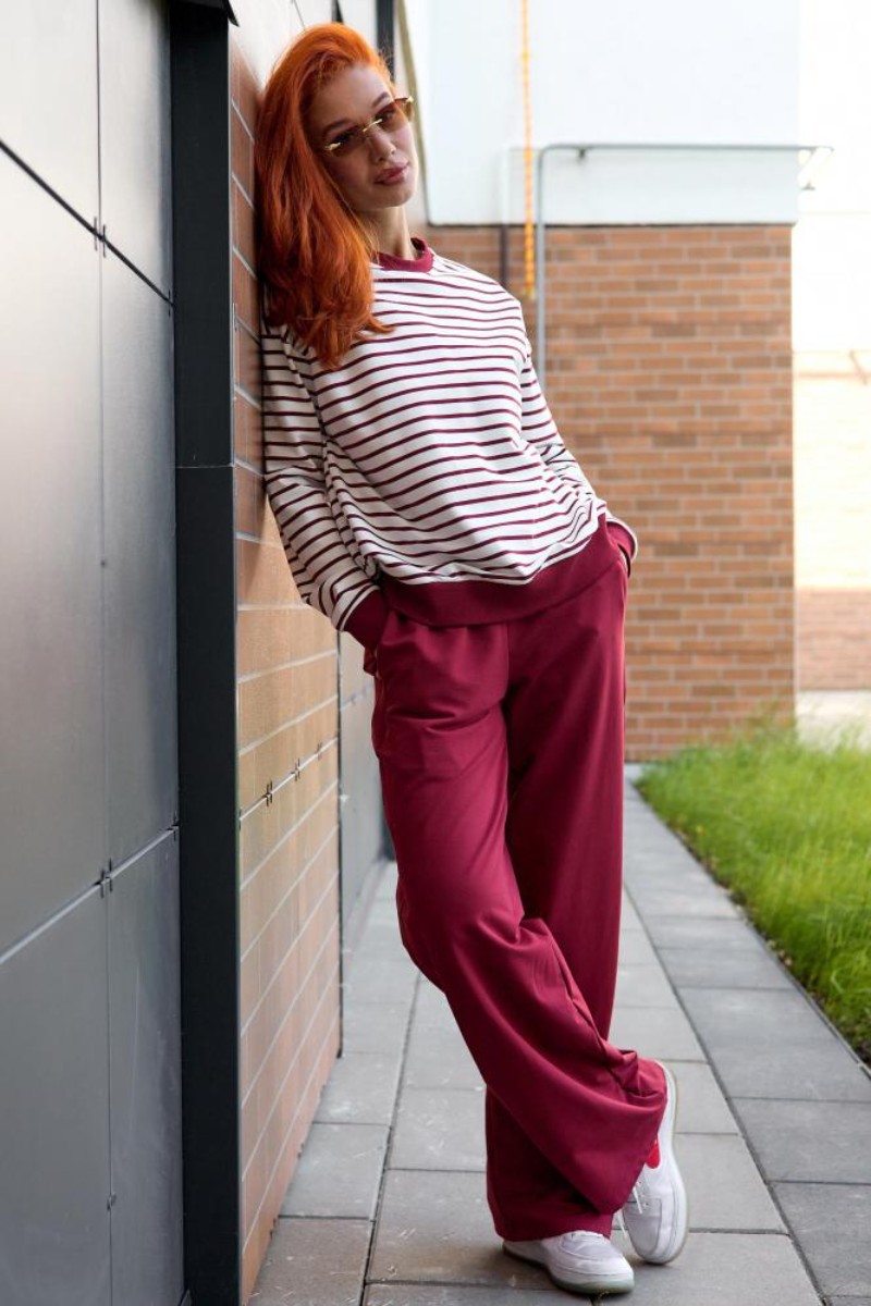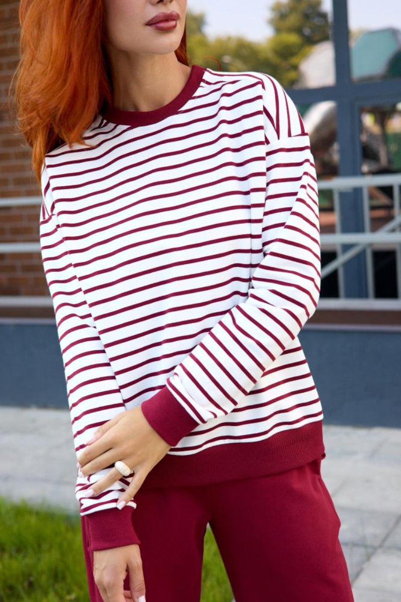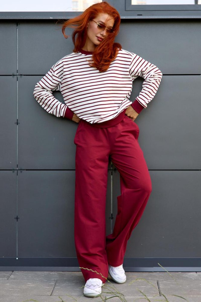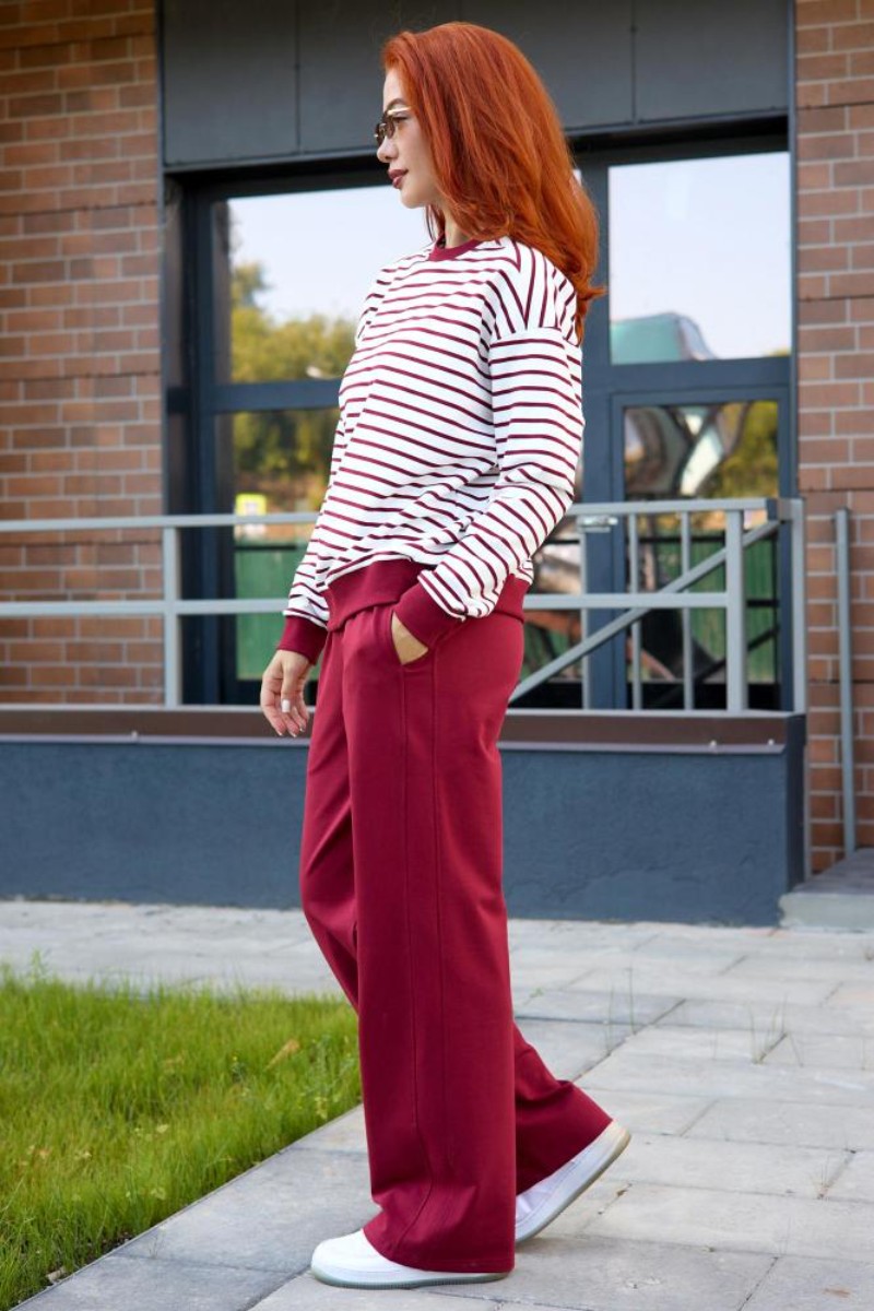 Представляем Вашему вниманию женский костюм двойку, который состоит из однотонных брюк и свитшота в тонкую полоску. Комплект обеспечит полную свободу движений в повседневной носке. В нём Вы будете чувствовать себя комфортно и уверенно.