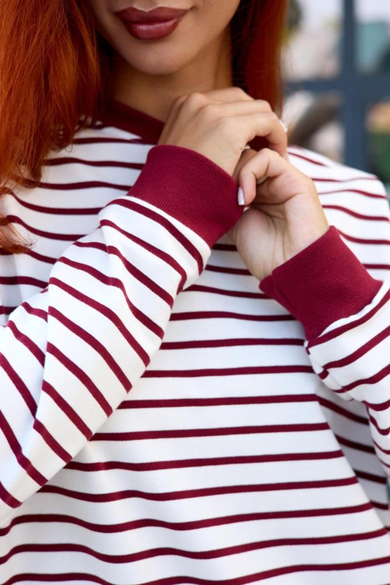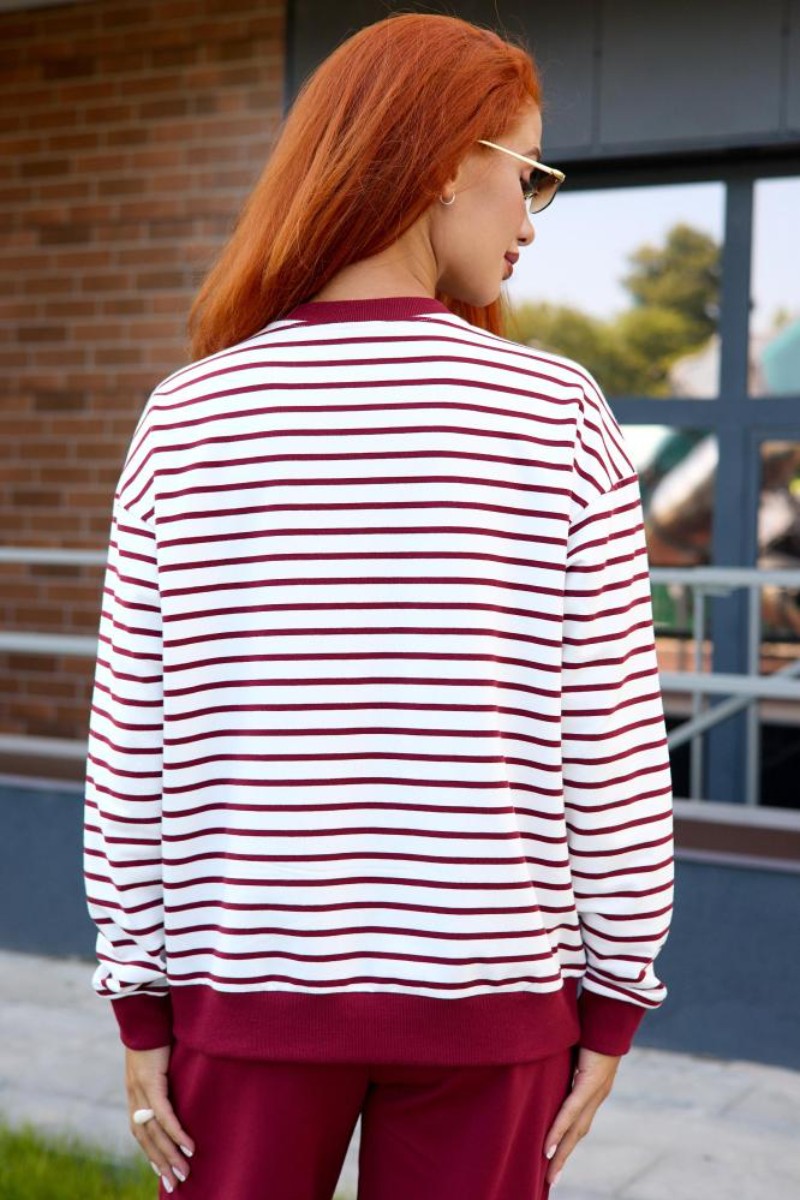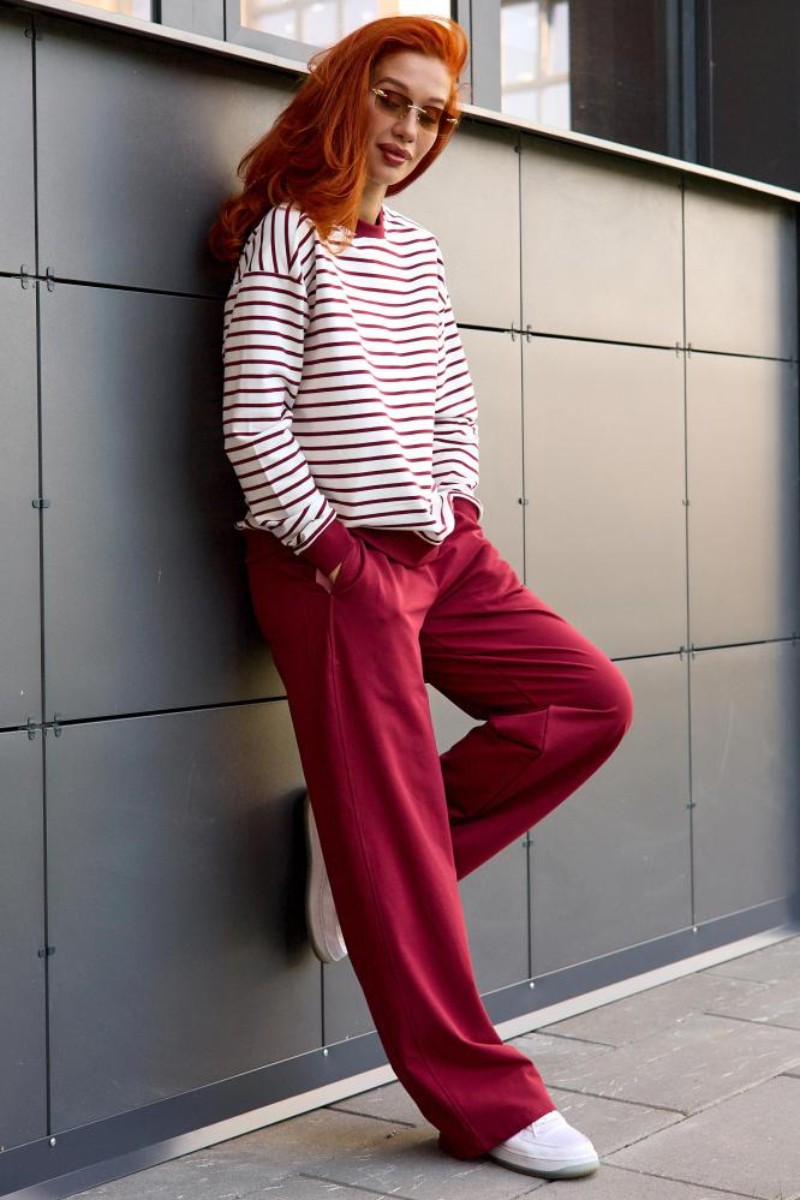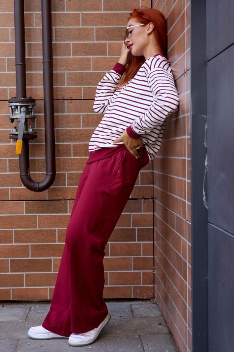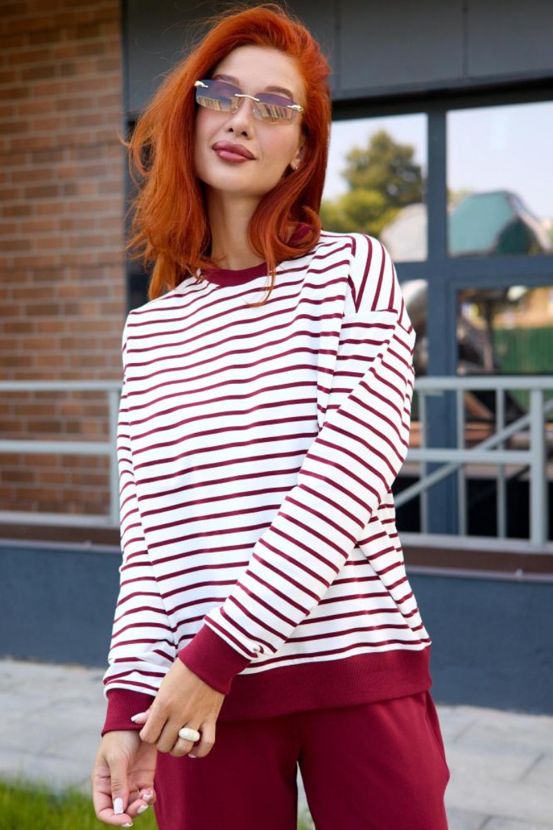 Представляем Вашему вниманию женский костюм двойку, который состоит из однотонных брюк и свитшота в тонкую полоску. Комплект обеспечит полную свободу движений в повседневной носке. В нём Вы будете чувствовать себя комфортно и уверенно.