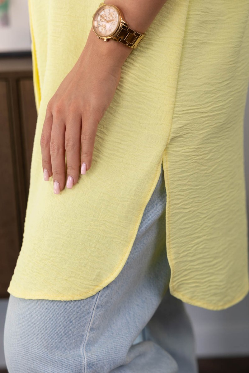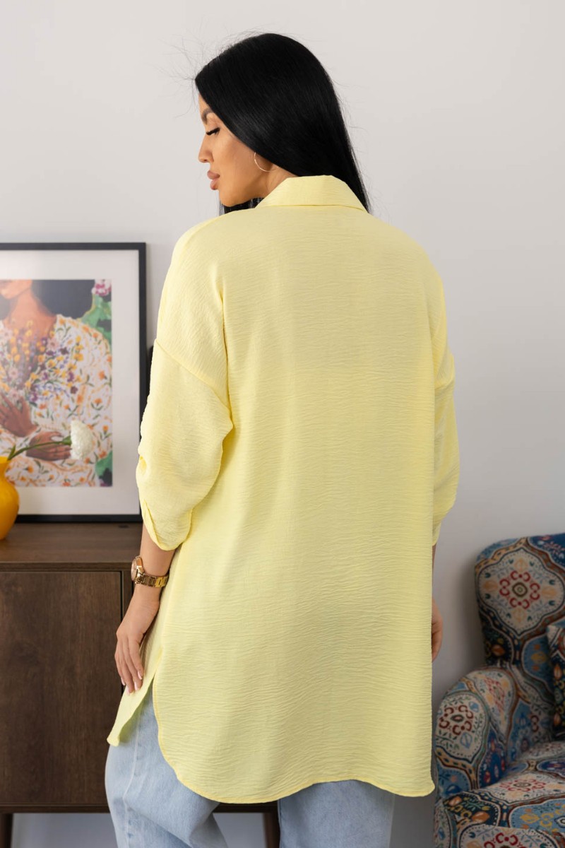 Представляем Вашему вниманию женскую тунику из легкого, воздушного полотна с мятым эффектом. Рубашка с отложным воротником, рукавом 3/4 с патой, разрезами по боковым швам, накладным нагрудным карманом и застежкой на пуговицы.