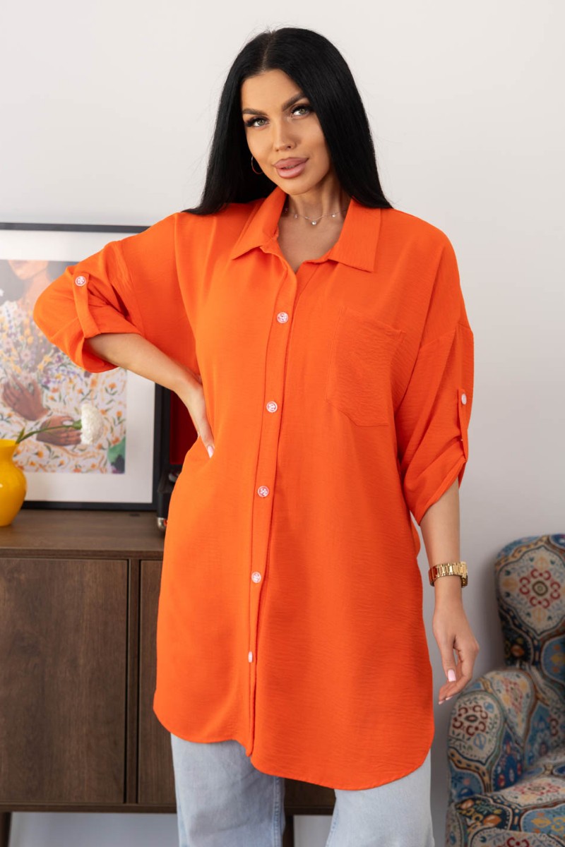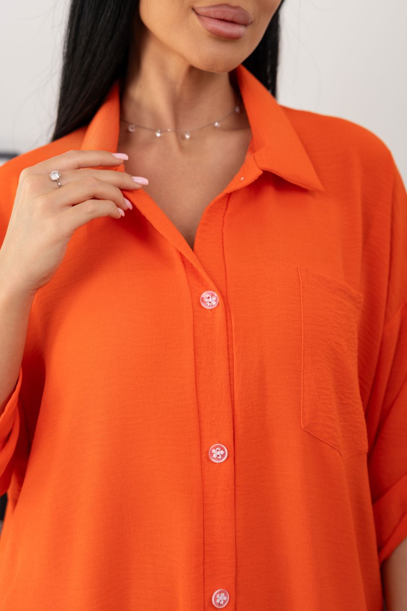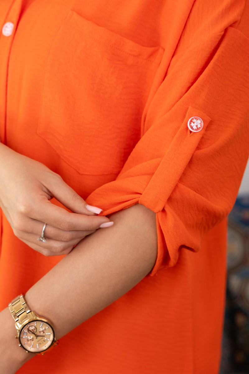 Представляем Вашему вниманию женскую тунику из легкого, воздушного полотна с мятым эффектом. Рубашка с отложным воротником, рукавом 3/4 с патой, разрезами по боковым швам, накладным нагрудным карманом и застежкой на пуговицы.