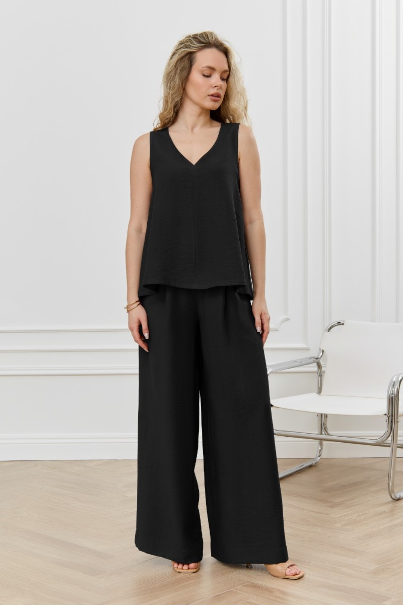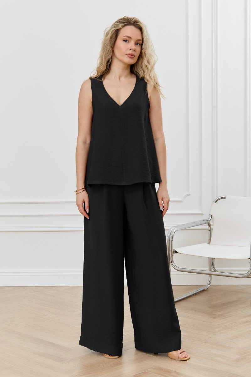 Представляем Вашему вниманию брюки женские из гладкокрашеного фактурного полотна длинные, широкие по всей длине, на притачном поясе с эластичной тесьмой внутри, с карманами в боковых швах. Модным элементом является широкая подгибка нижних срезов.