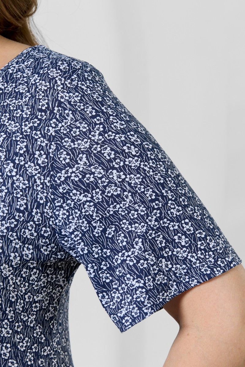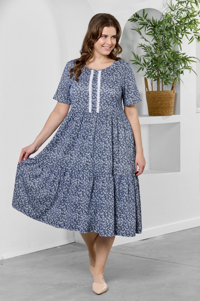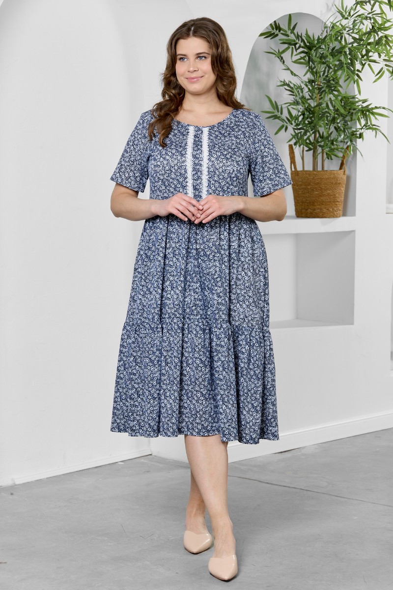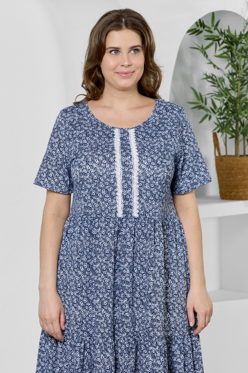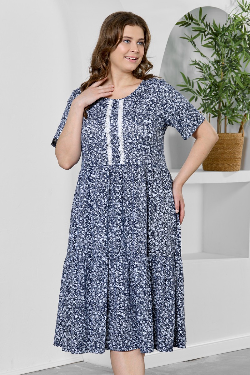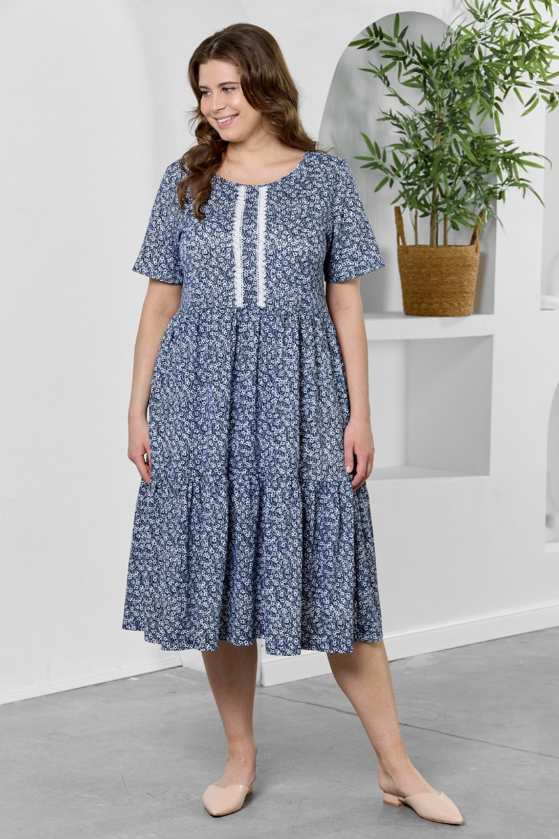 Представляем Вашему вниманию платье женское из трикотажного полотна "кулирка" с набивным рисунком, свободного кроя, отрезное по линии талии, с короткими втачными рукавами, горловиной овальной формы окантованной основным материалом. По центру полочки двумя параллельными линиями настрочено декоративное кружево контрастного цвета. Юбка – из двух ярусов, каждый из которых присборен по шву соединения с верхней деталью.