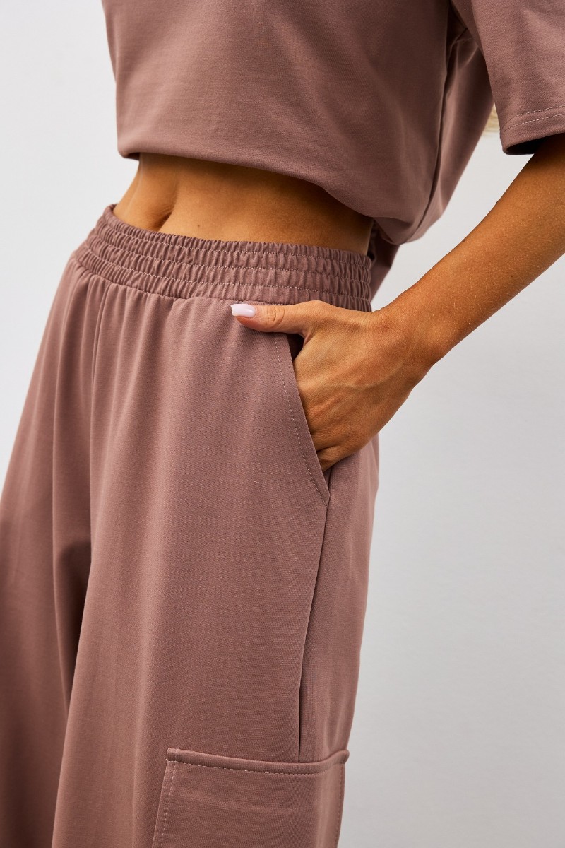 Представляем Вашему вниманию костюм двойку из трикотажного полотна «футер 2-х нитка», состоящий из футболки и брюк. Футболка - с короткими втачными рукавами, горловиной овальной формы, обработанной втачной планкой и принтом на полочке, выполненным в технике «шелкографии». Брюки-карго – длинные, свободные, на притачном поясе с эластичной тесьмой внутри, карманами в боковых швах. Дополнительные накладные карманы со складкой, закрывающиеся клапаном, располагаются по бокам в области бедер. Низ брюк обработан подгибкой с вложением эластичной тесьмы и регулируется по длине с помощью фиксатора.