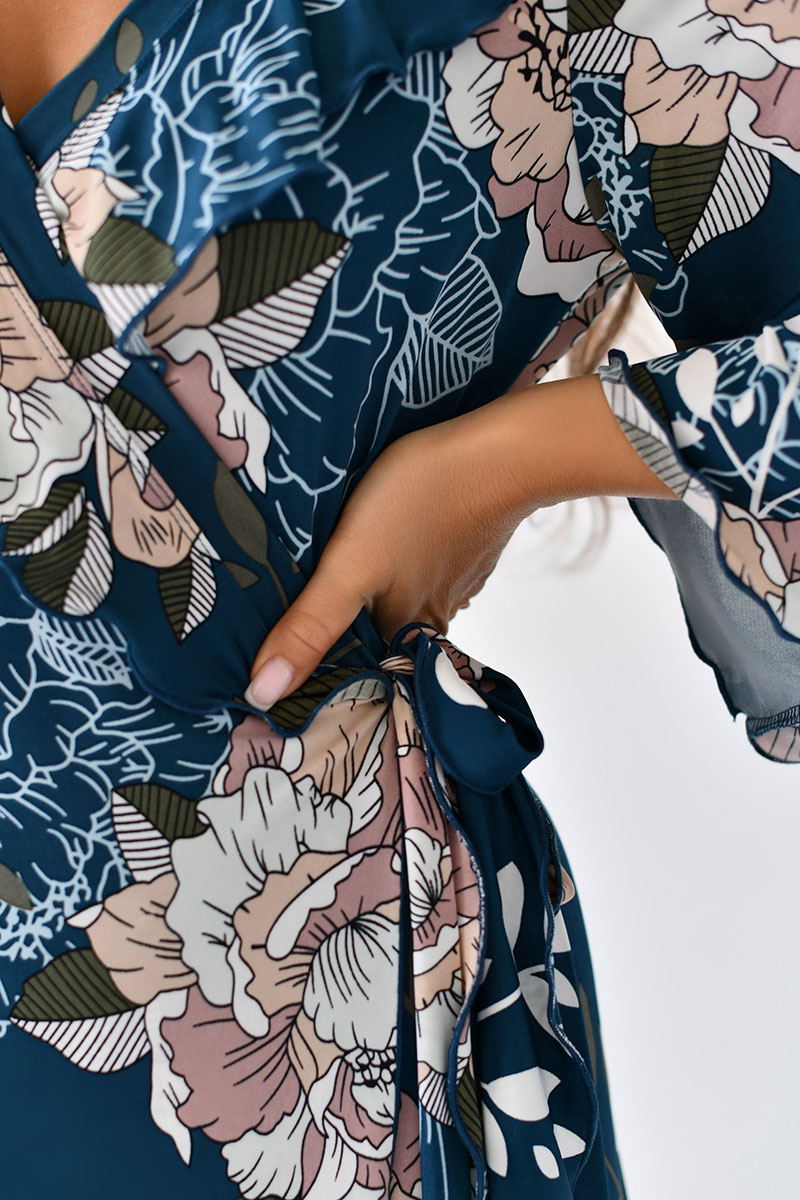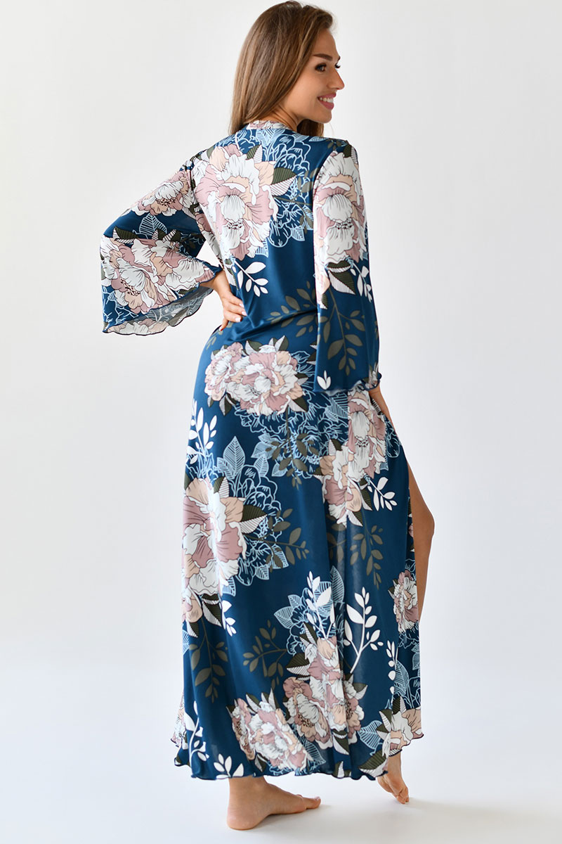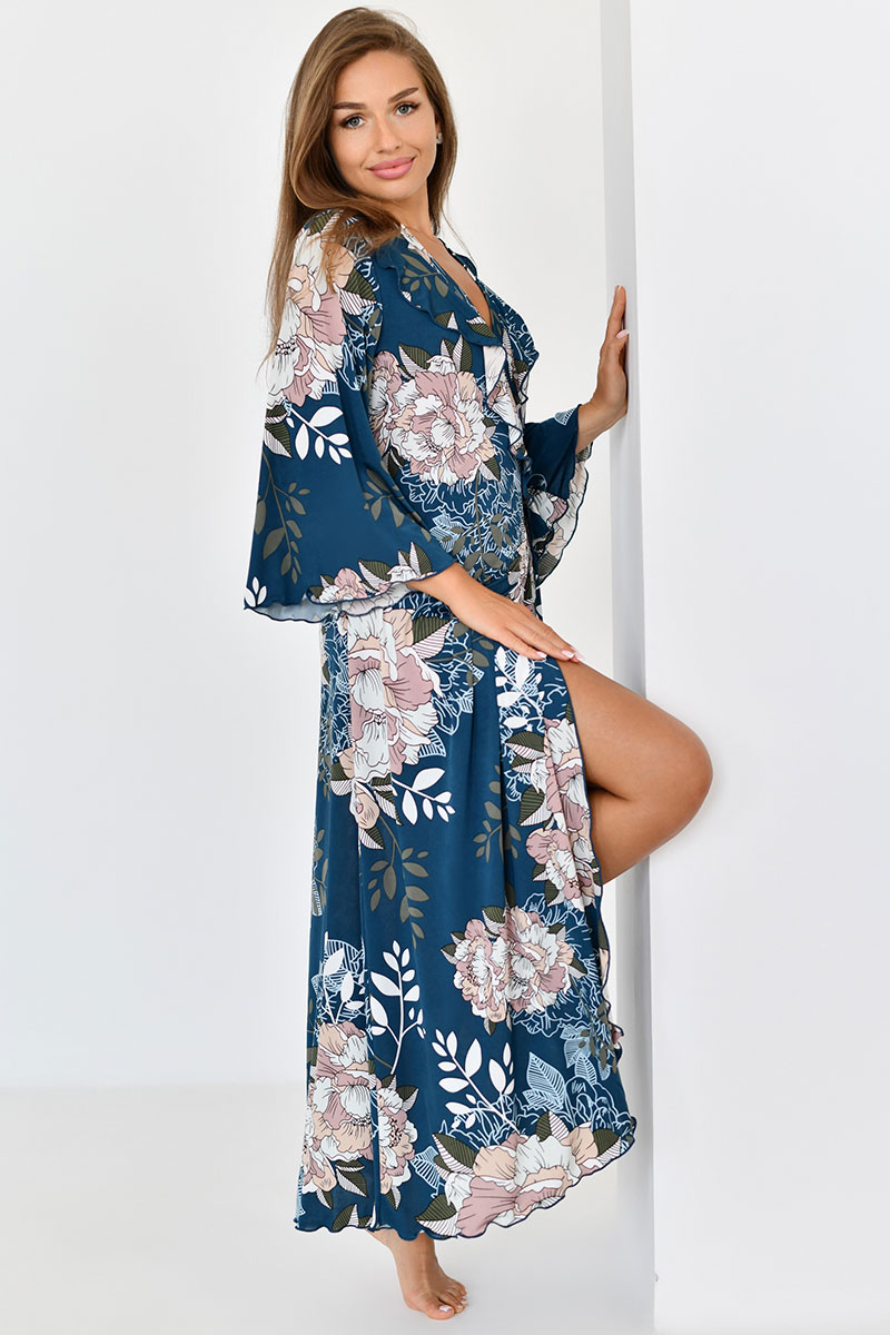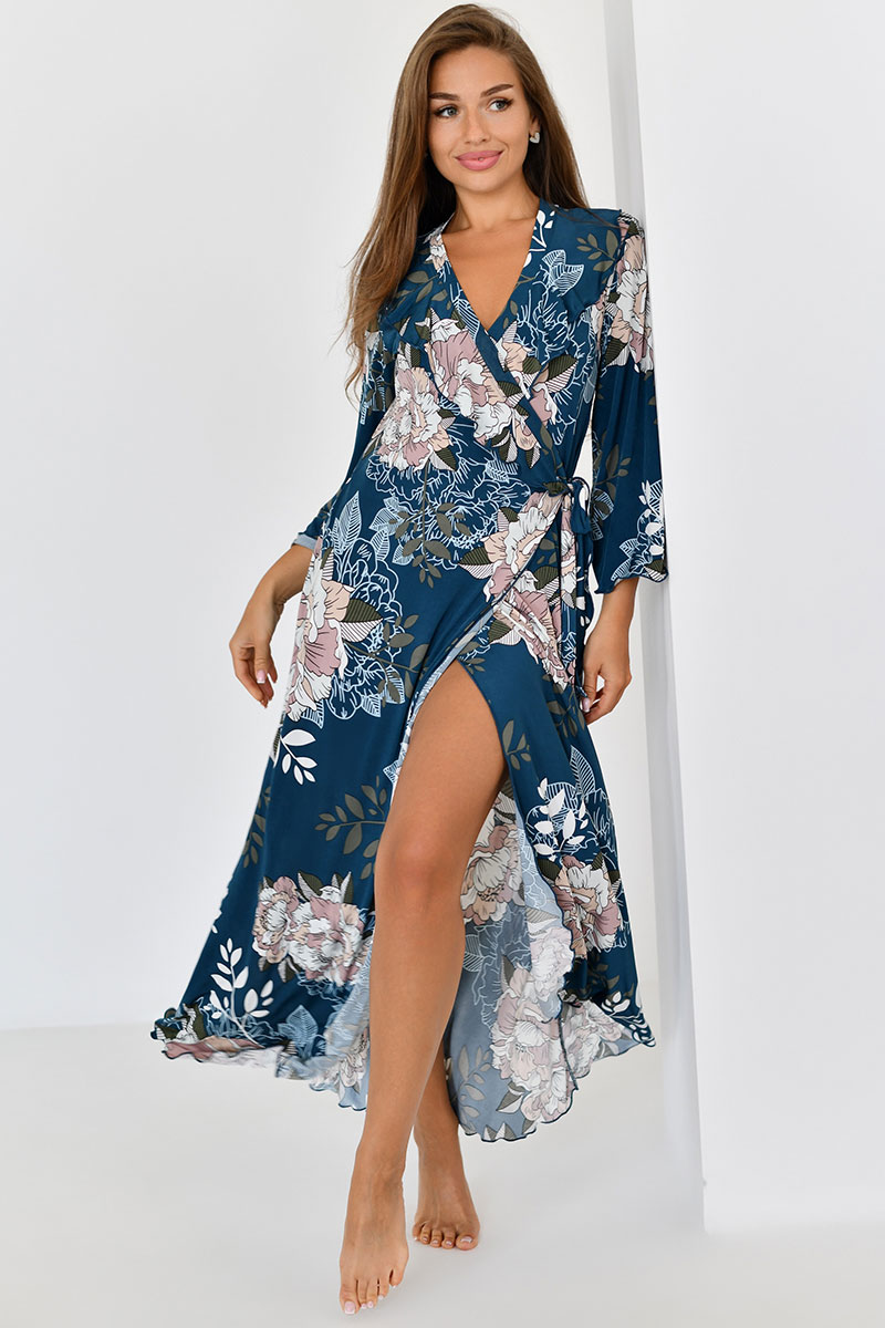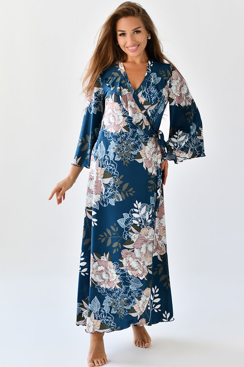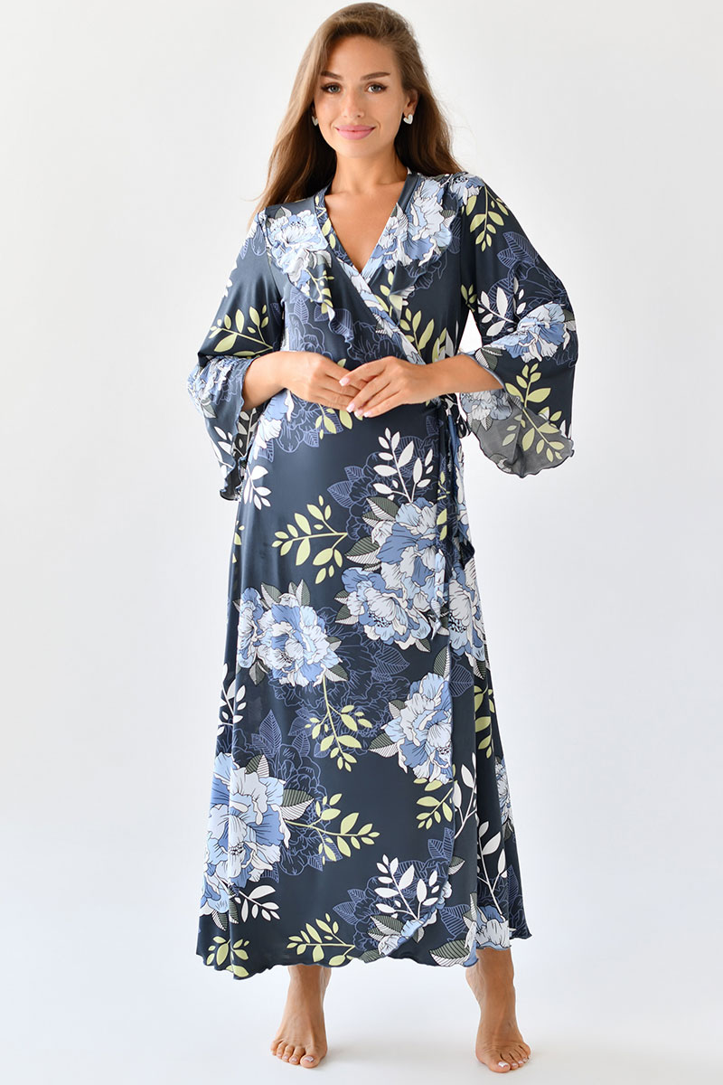 Представляем Вашему вниманию очаровательный женский халат "Матушка". Халат на запах, длинный, полуприлегающего силуэта, расклешенный к низу, длиной до середины икры. Линия талии завышена. На полочках, в области груди воланы. Рукав втачной, длиной 3/4. Части пояса втачные, располагаются на завышенной линии талии.