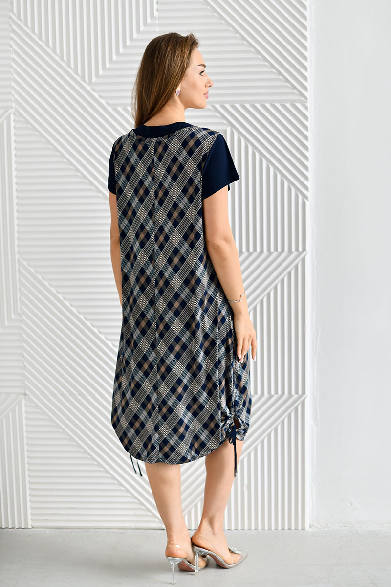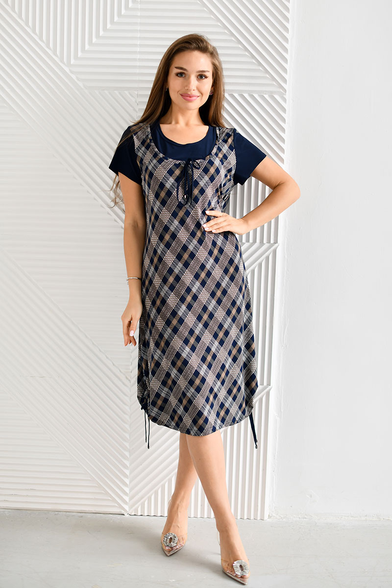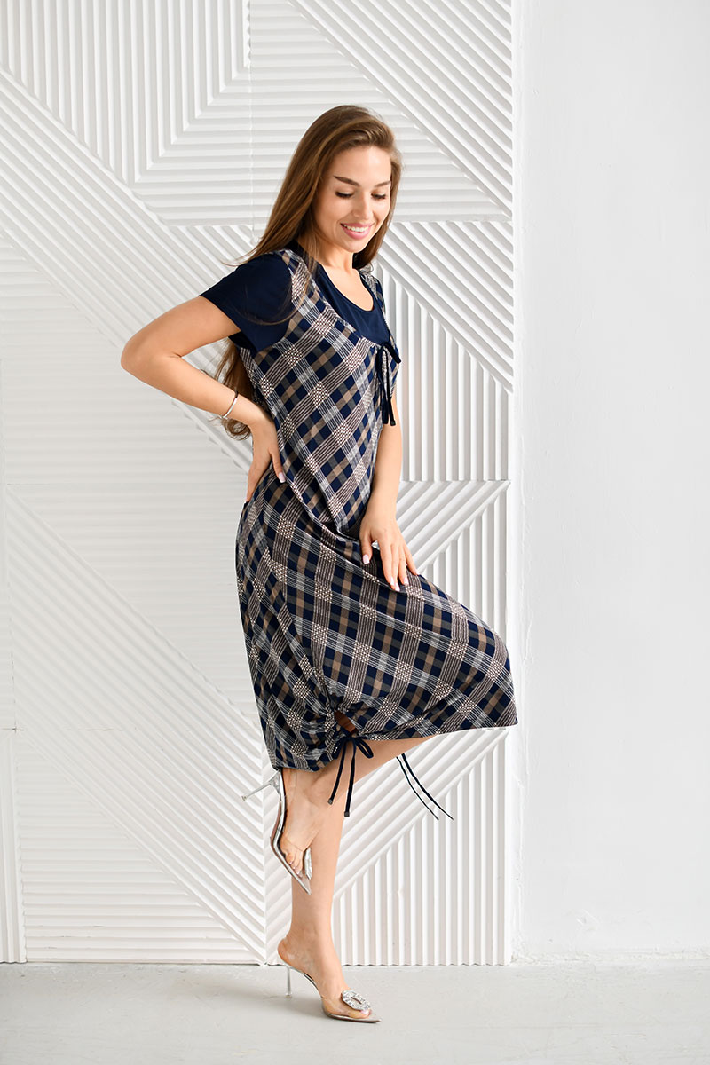 Представляем Вашему вниманию очаровательное платье расширенного к низу силуэта, длиной до середины икры. Плечевой пояс выполнен в виде "обманки" с эффектом сарафана, одетого на футболку. Для поддержания этого эффекта используются два материала - компаньона. Рукав короткий втачной. Вырез горловины круглый. По низу изделия, в области боковых швов - кулиса. Платье отлично сидит на фигуре любого типа и позволит Вам чувствовать себя уверенно и привлекательно.