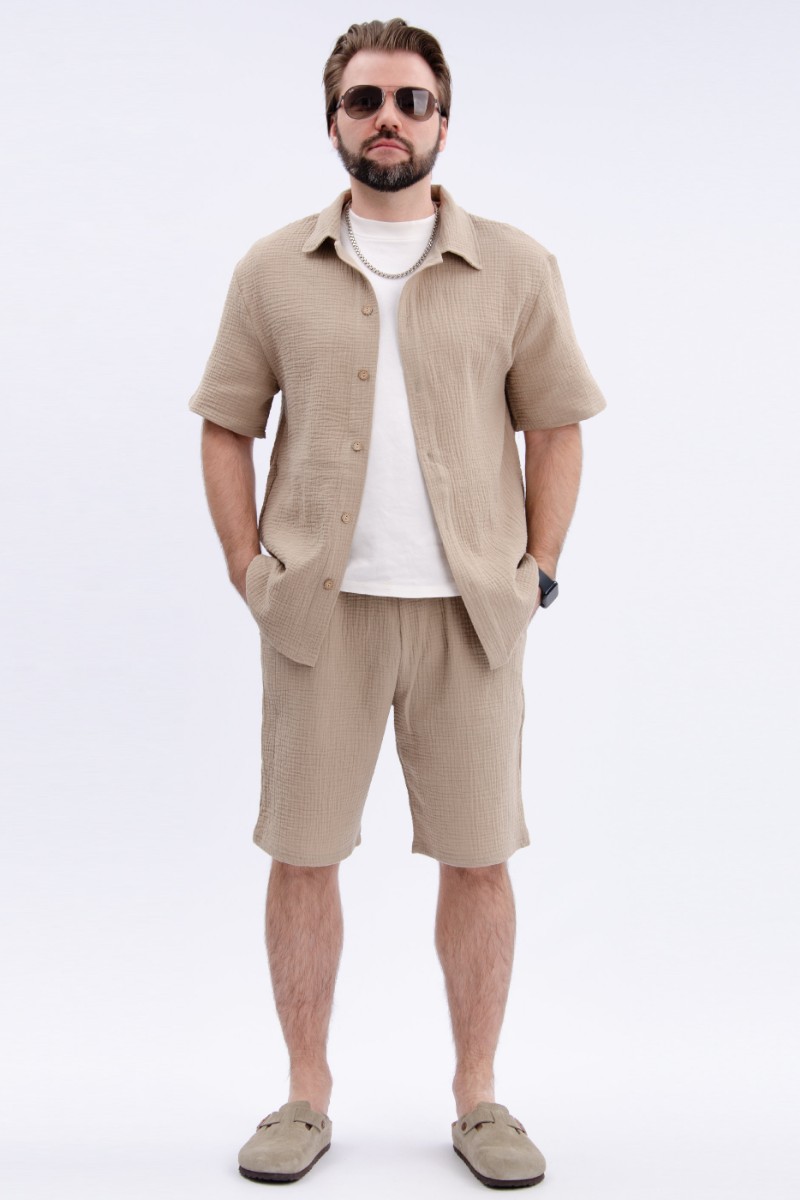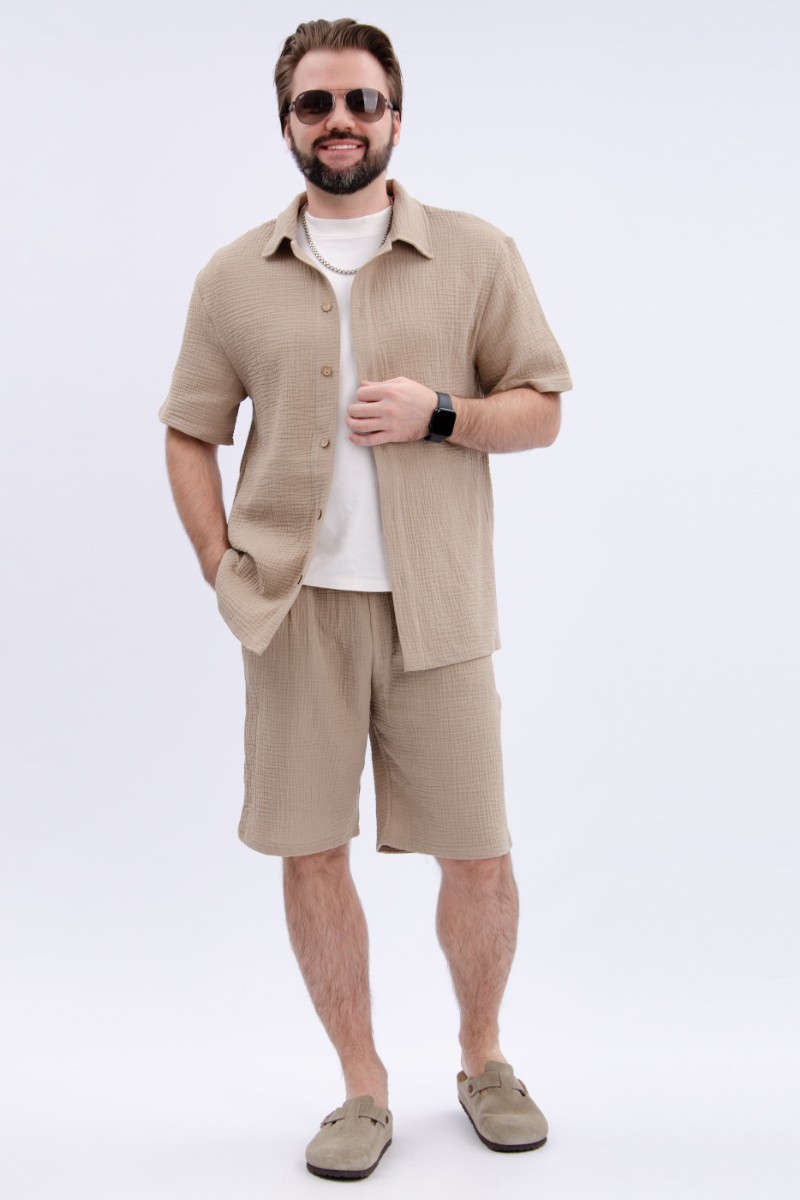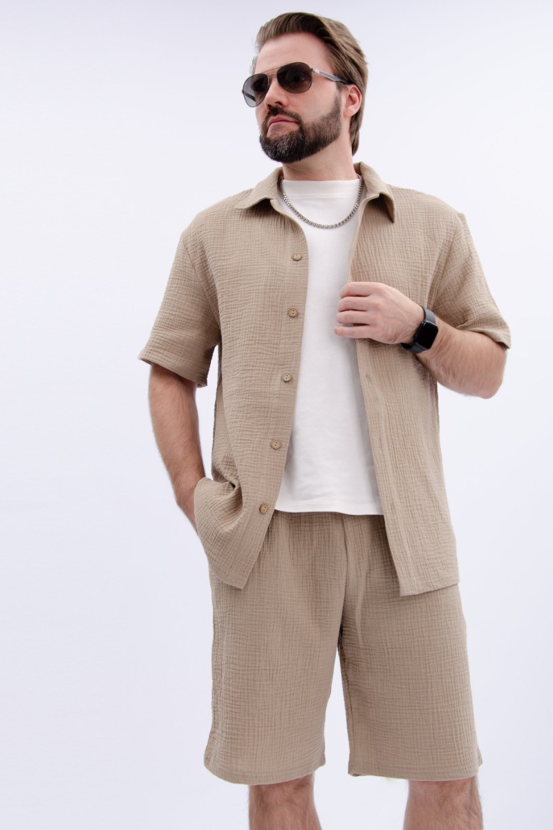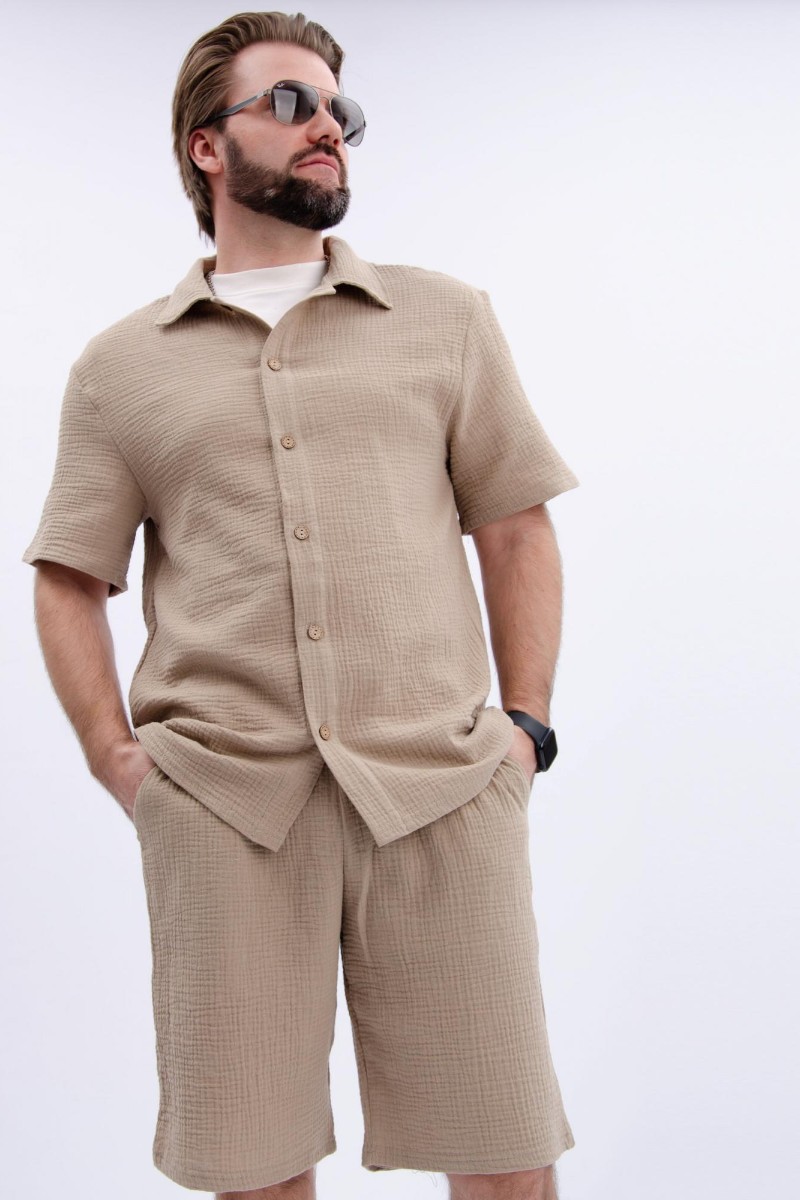 Представляем Вашему вниманию мужской костюм двойку, состоящий из рубашки на пуговицах и шортов. Сшито из высококачественного муслина - 100% хлопок, позволяющий коже дышать. Костюм хорошо сидит на фигуре и подчеркивает её достоинства. Отдых в нём будет максимально комфортным и расслабляющим.