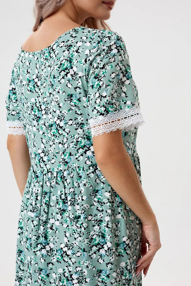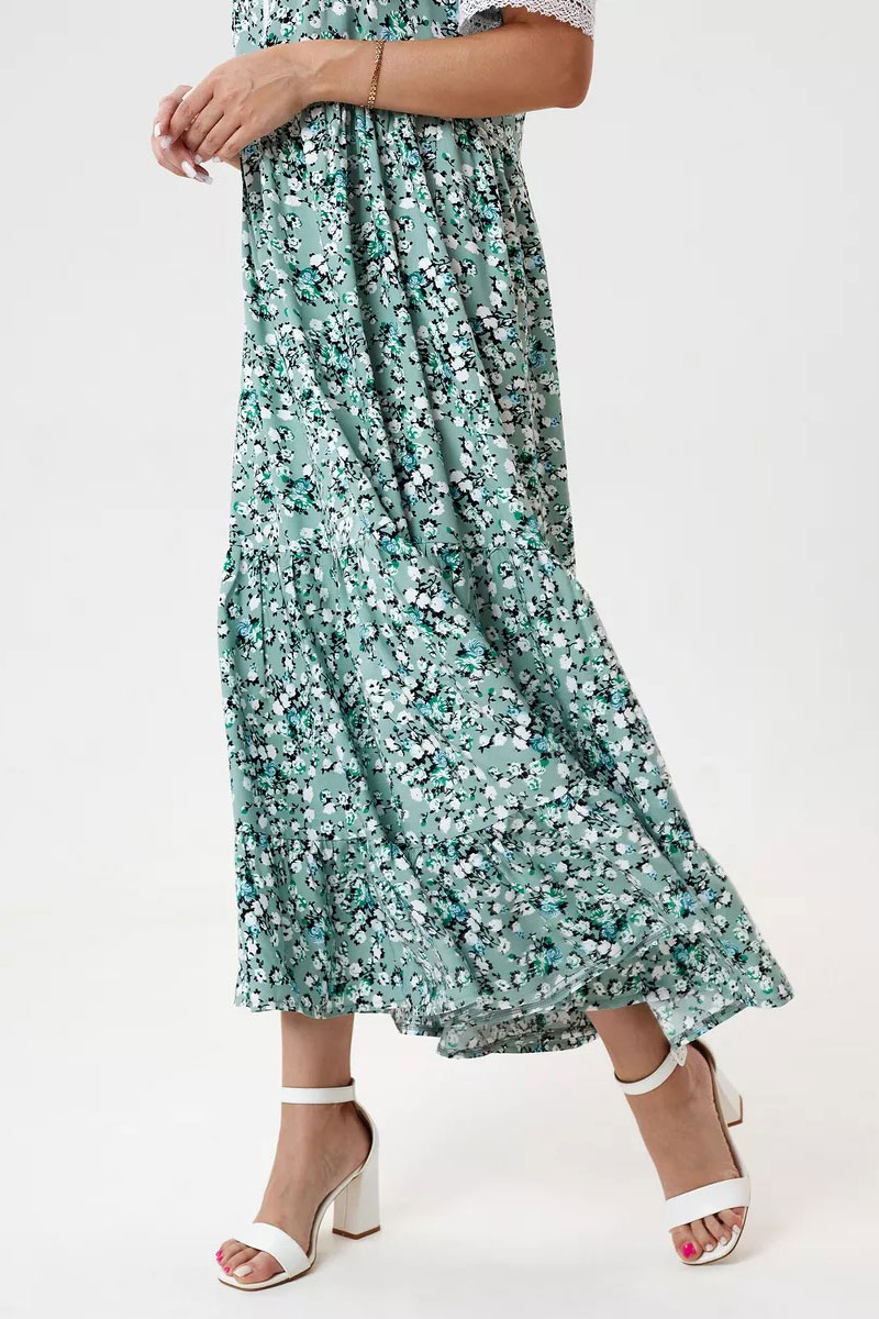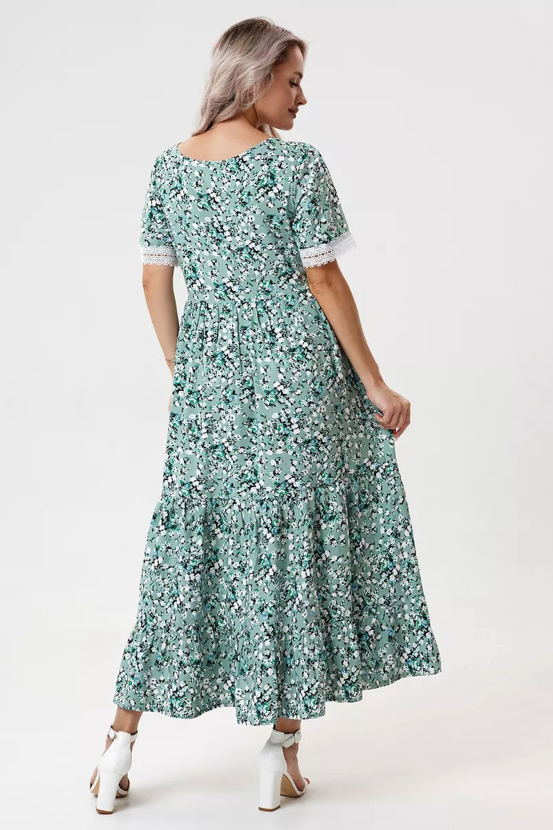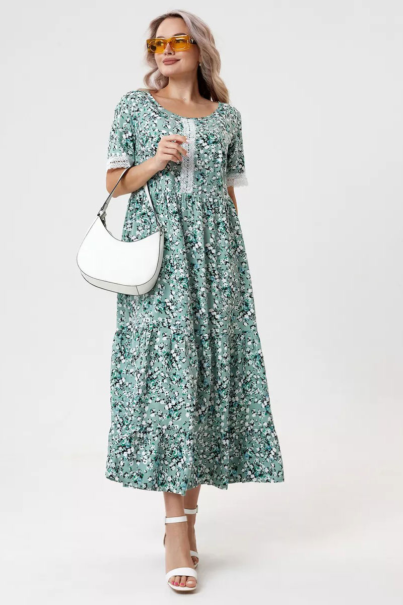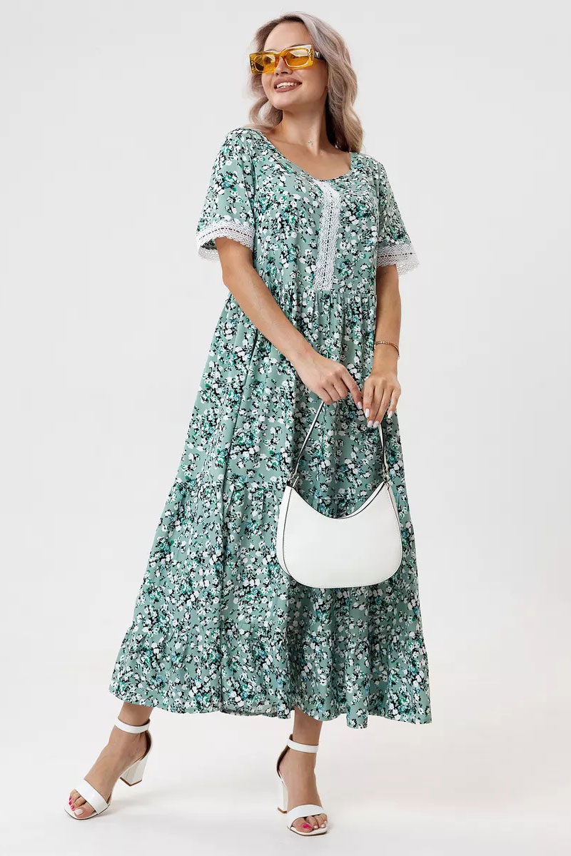 Представляем Вашему вниманию очаровательное платье, изготовленное из качественного материала. Платье свободного силуэта, с коротким рукавом. Платье расклешено с помощью воланов с легкой сборкой. Полочка и низ рукавов декорированы хлопковым кружевом. Платье отлично сидит на фигуре любого типа и позволит Вам чувствовать себя уверенно и привлекательно.