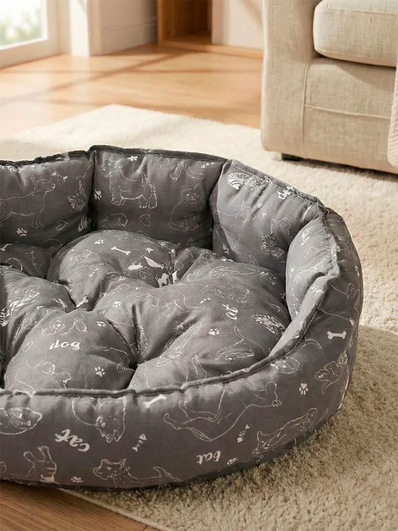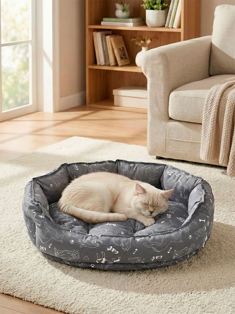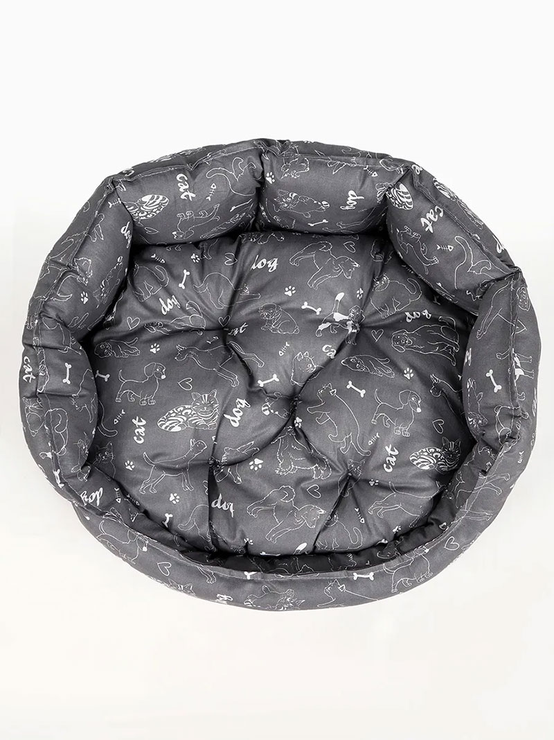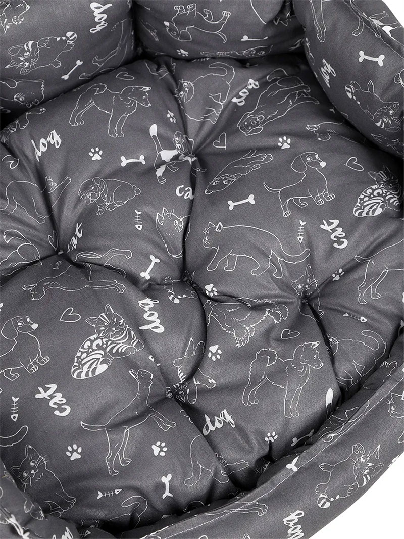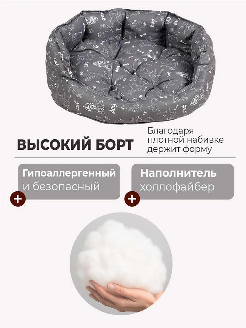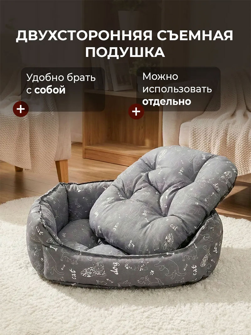 Внутри лежит съёмная подушка, которую легко достать и почистить. Это упрощает уход за лежанкой.