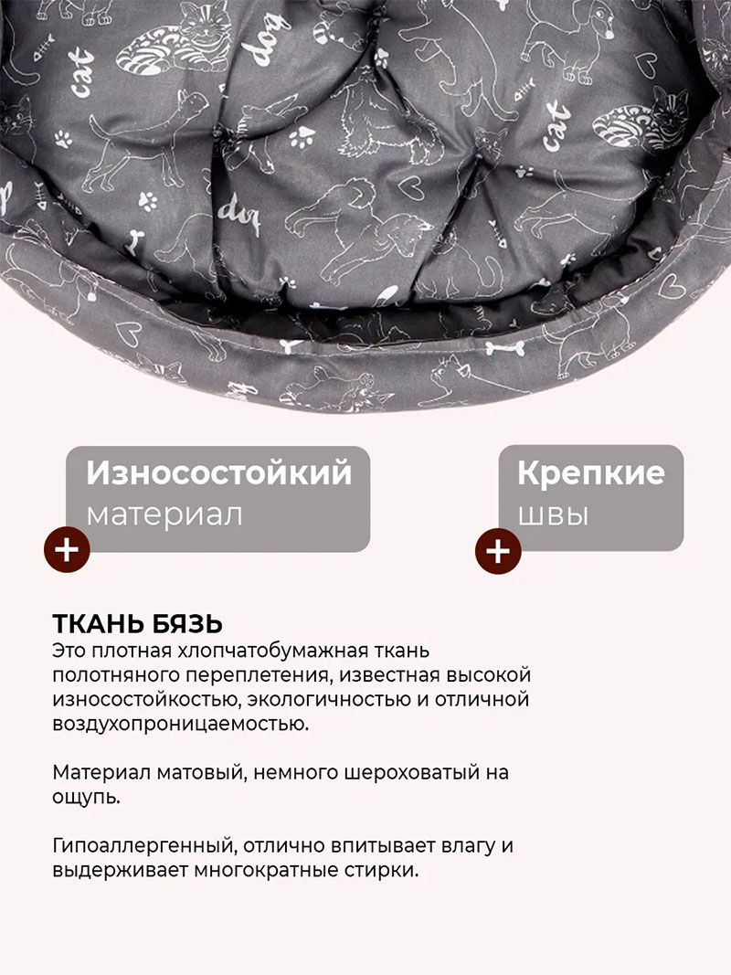 Изготовлена из прочной и приятной на ощупь бязи. Материал износостойкий, поэтому лежанка подходит для ежедневного использования дома, на даче или в квартире.