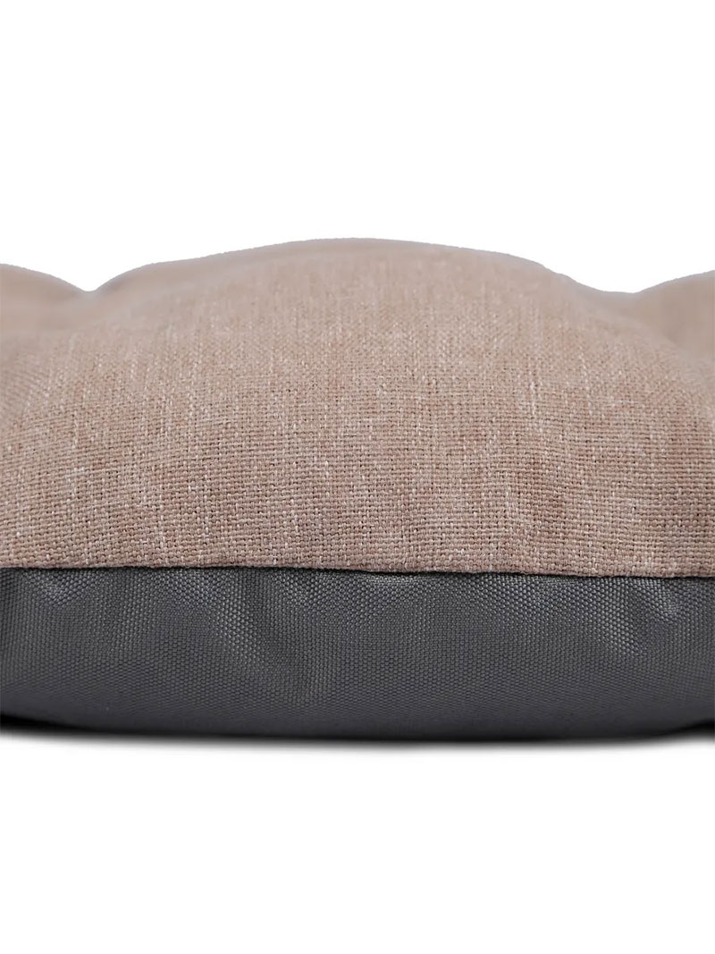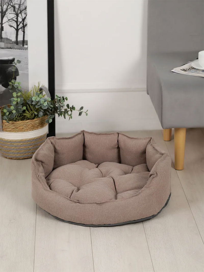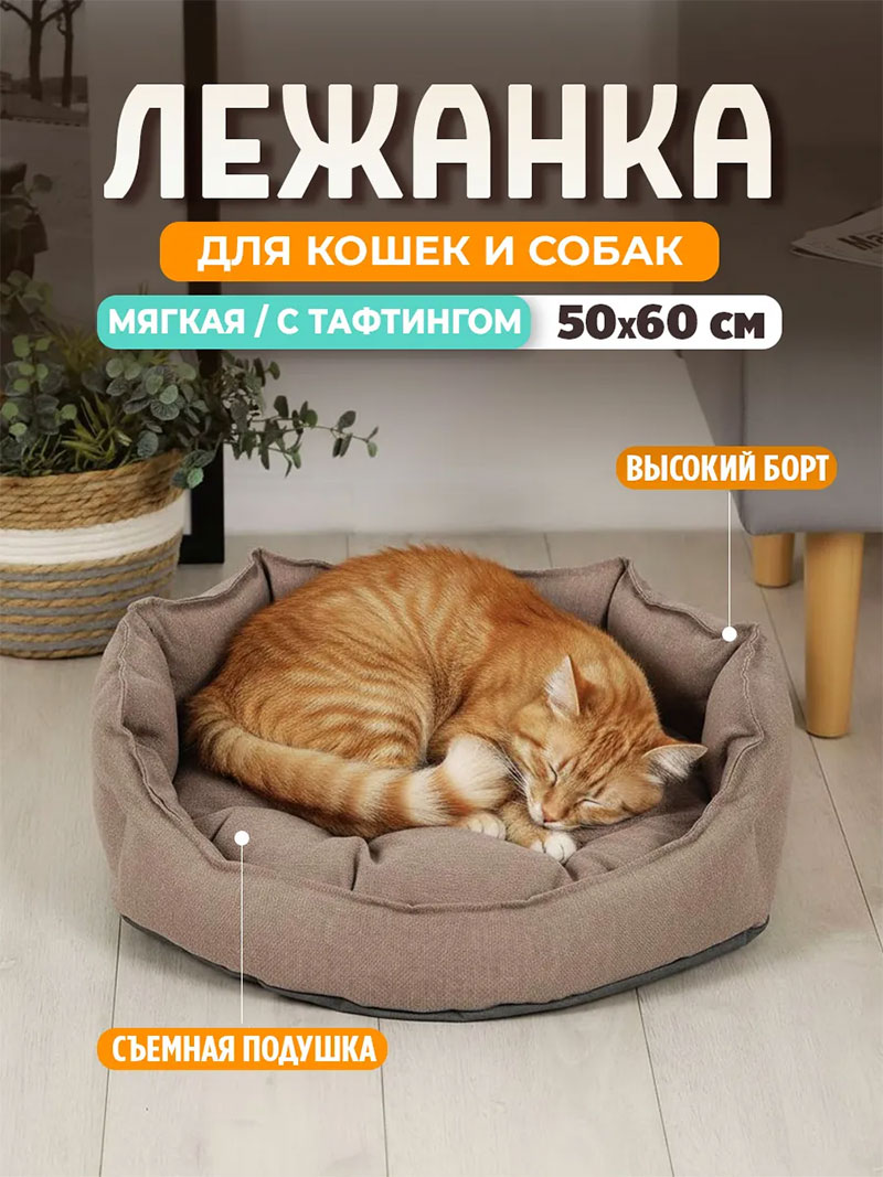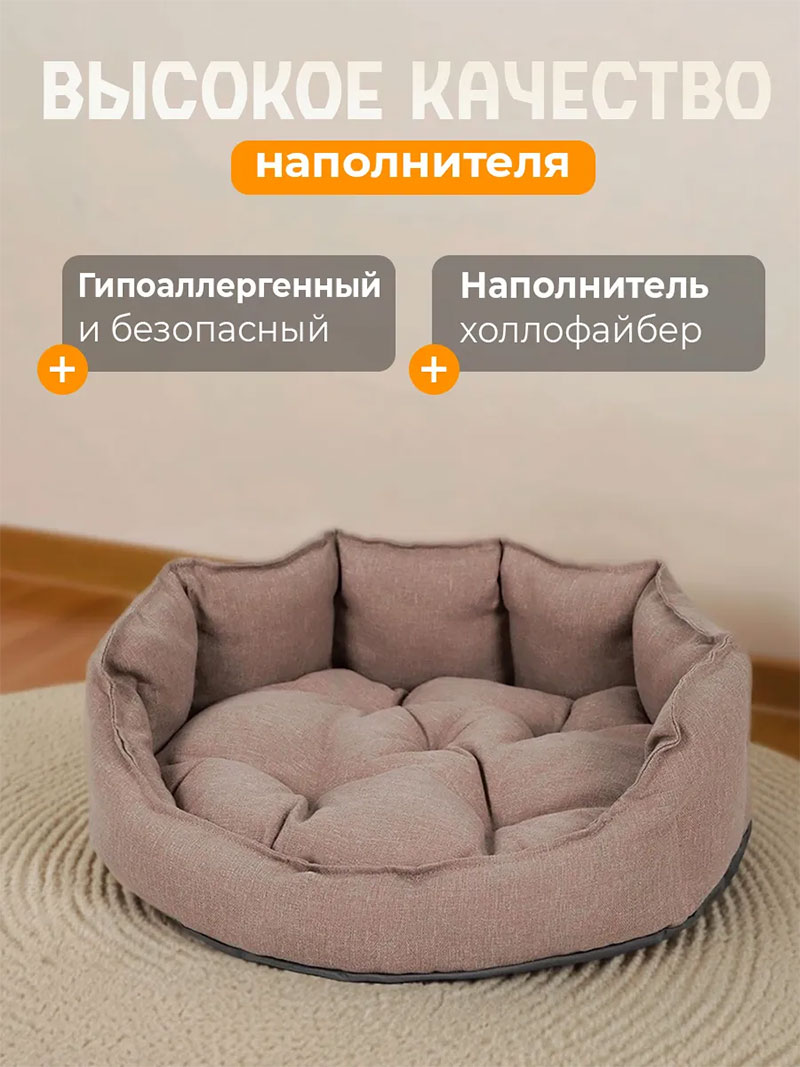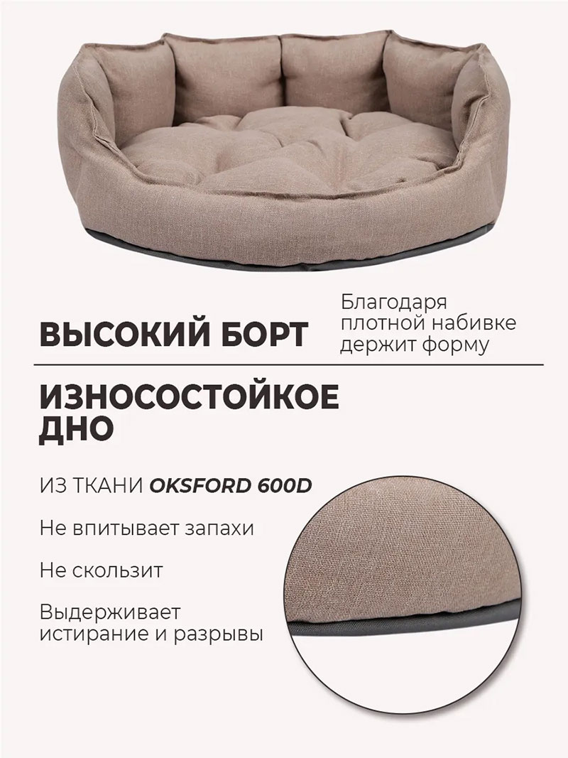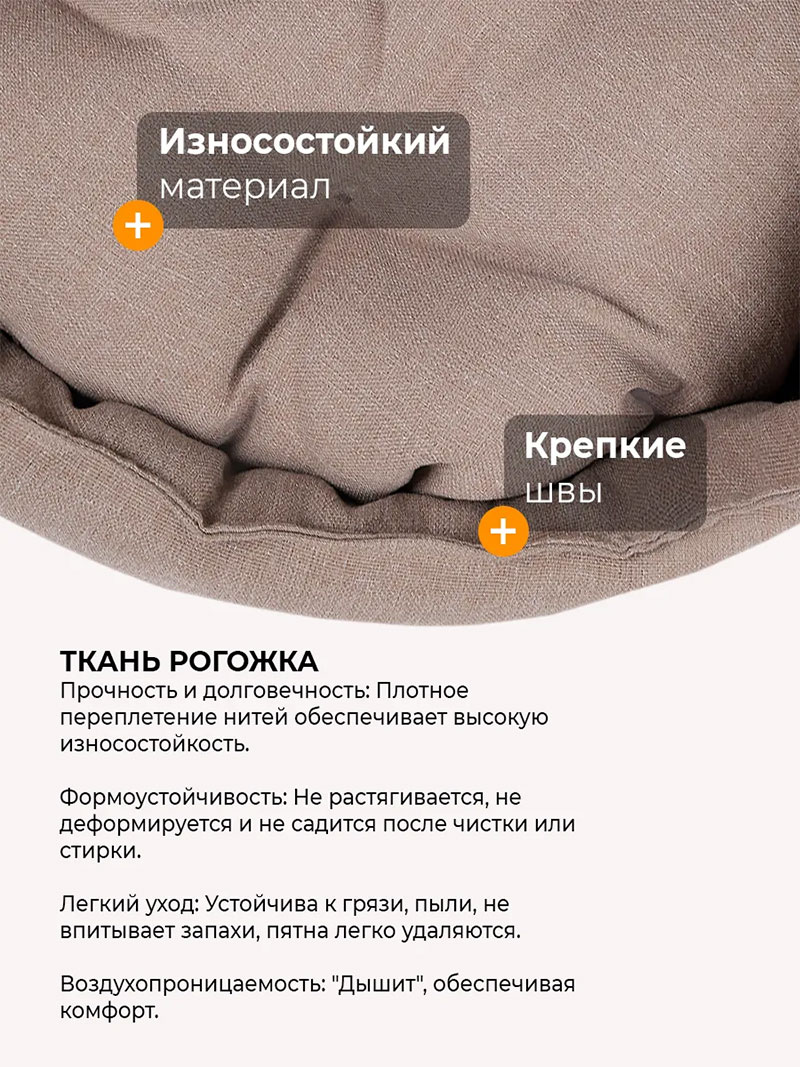 Мягкий лежак для кошек выполнен из прочной мебельной ткани рогожка с плотным плетением. Материал износостойкий и приятный на ощупь, подходит для ежедневного использования. Низ кровати покрыт тканью оксфорд с водоотталкивающей пропиткой, что помогает сохранить её внешний вид дольше.