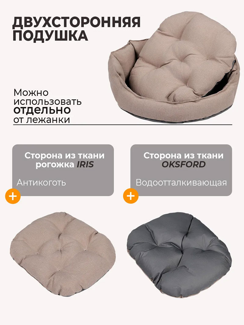 Внутри лежит мягкая съёмная подушка, которую легко достать и почистить. Лежанка хорошо держит форму и поддерживает суставы питомца, снижая нагрузку во время сна.