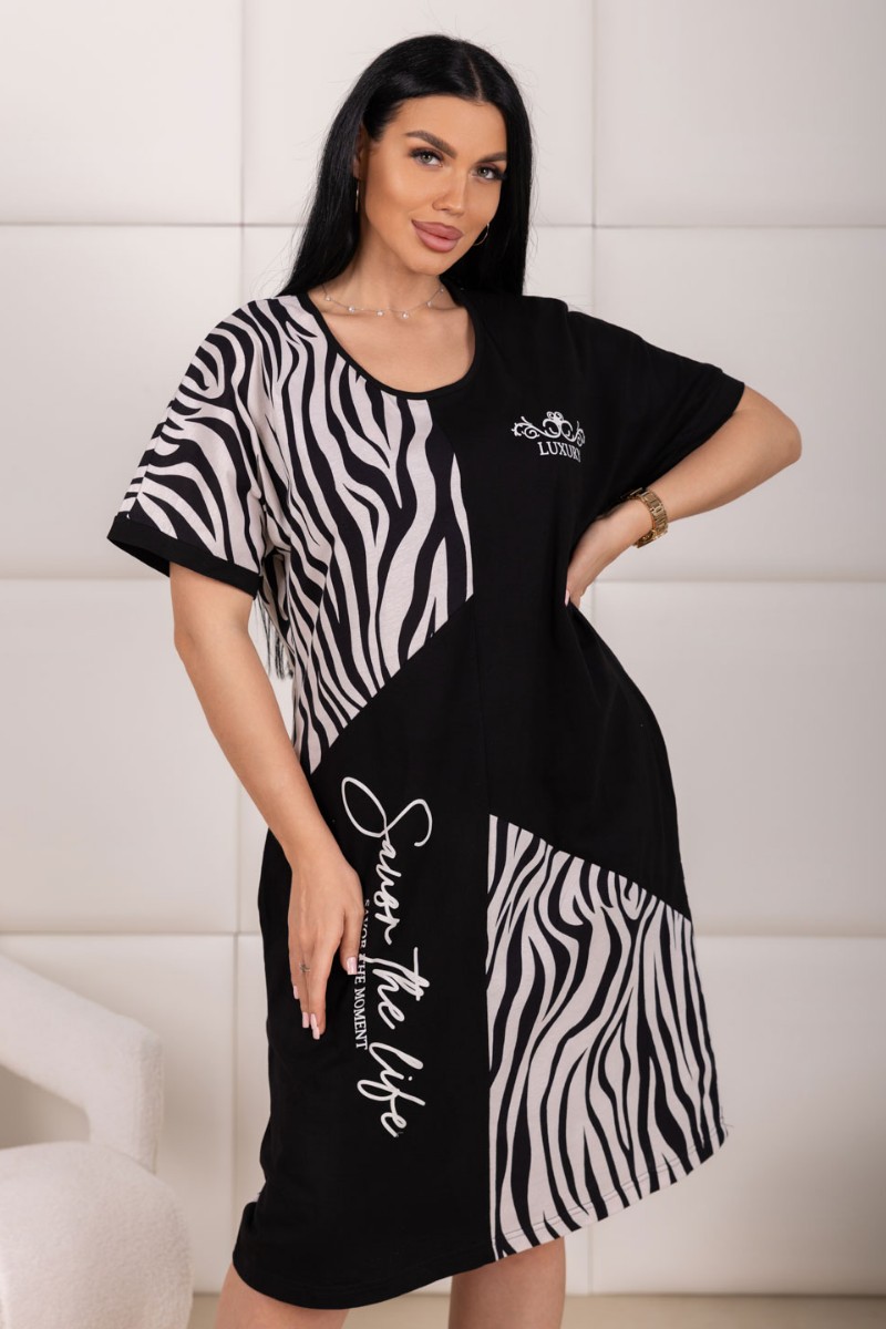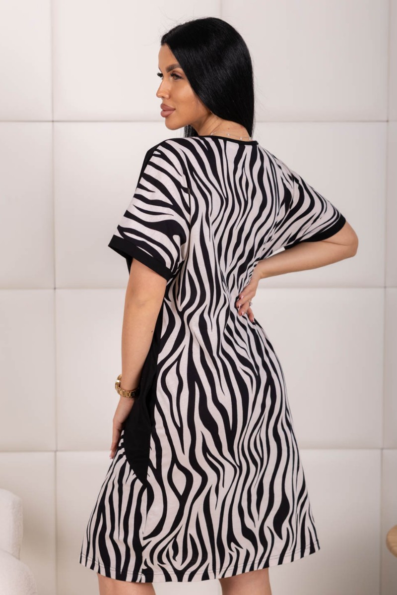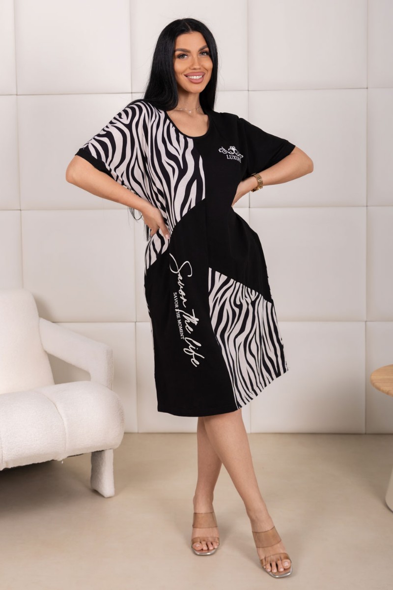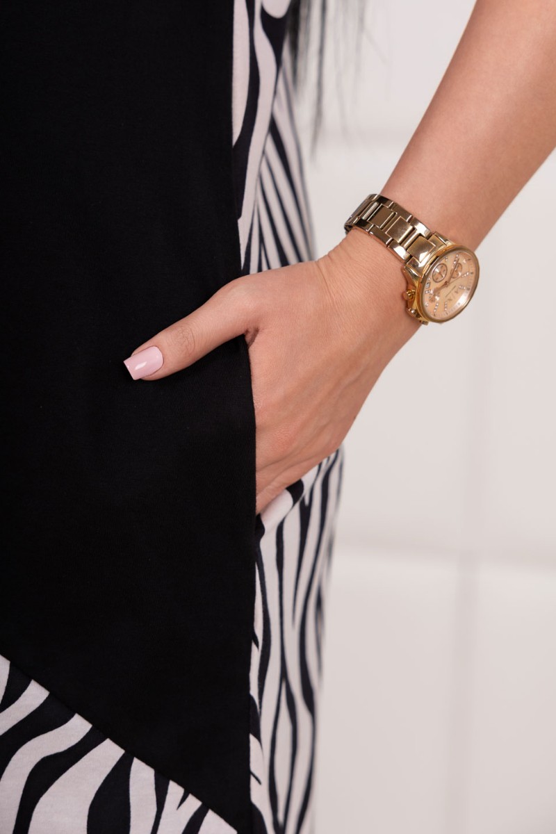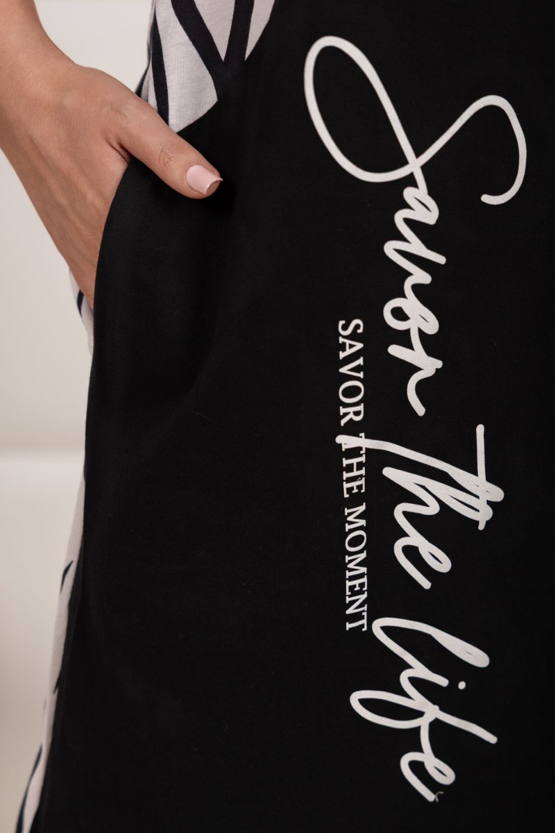Представляем Вашему вниманию ассиметричное женское платье с печатью, цельнокроеным рукавом, V-образной горловиной и карманами в боковых швах. Сшито из высококачественной кулирки - 100% хлопок, позволяющий коже дышать.