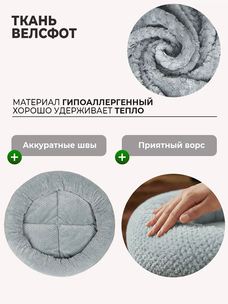 Представляем Вашему вниманию круглую лежанку для кошек и собак – это идеальный выбор, обеспечивающий вашим питомцам максимальное удобство. Если ваш котик любит спать в мягком домике, а собачка-терьер или корги ищет укромное местечко, наши спальные зоны — то, что нужно.