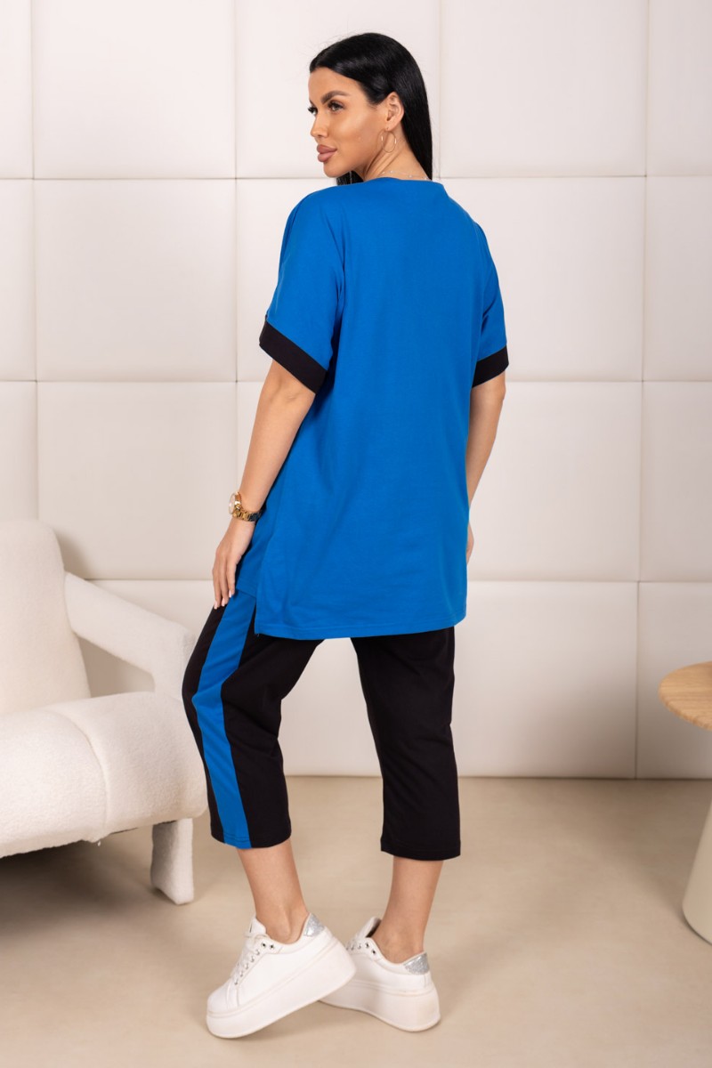 Представляем Вашему вниманию дачный костюм женский из хлопка. Футболка с цельнокроеным рукавом, О-образной горловиной, контрастной манжетой и печатью на полочке. Бриджи с лампасами в цвет верха c карманами в боковых швах.
