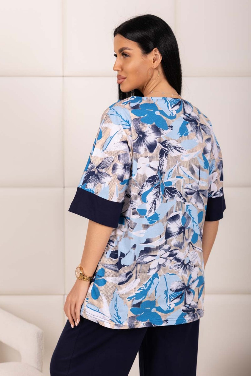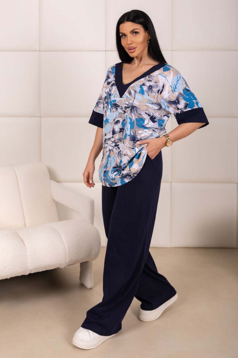 Представляем Вашему вниманию женский костюм из трикотажного полотна. Футболка с V-образным вырезом, выполненным из ткани компаньона и манжетами из этой же ткани. Брюки прямого кроя с высокой посадкой и карманами в боковых швах.