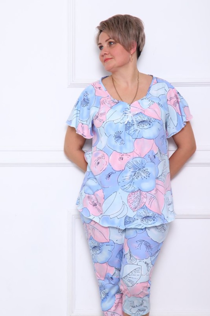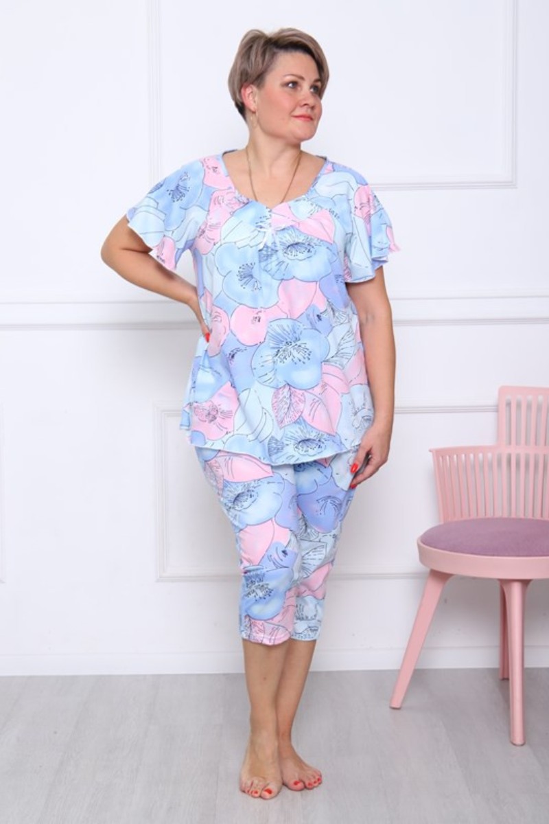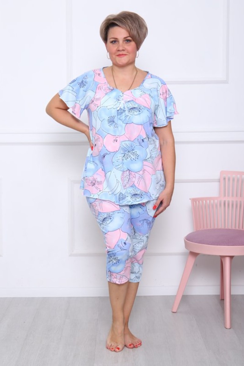 Представляем Вашему вниманию удобную и практичную женскую пижаму с бриджами, отдых в которой будет максимально приятным и расслабляющим. Изящный комплект, украшенный нежным принтом, выполнен из высококачественного, натурального материала, который хорошо пропускает воздух, позволяя коже дышать.