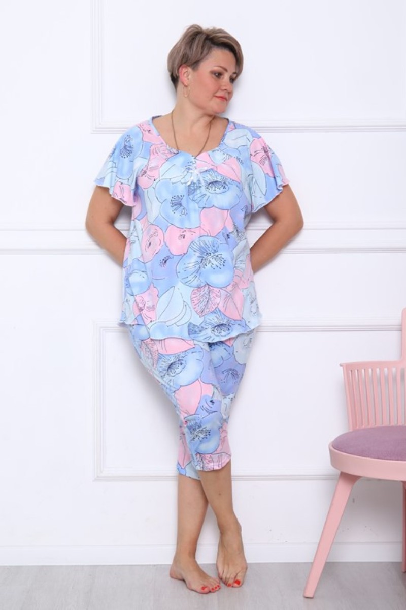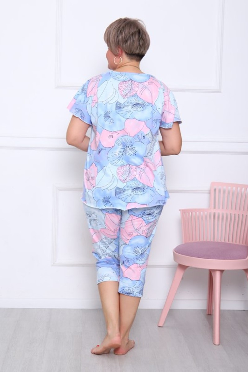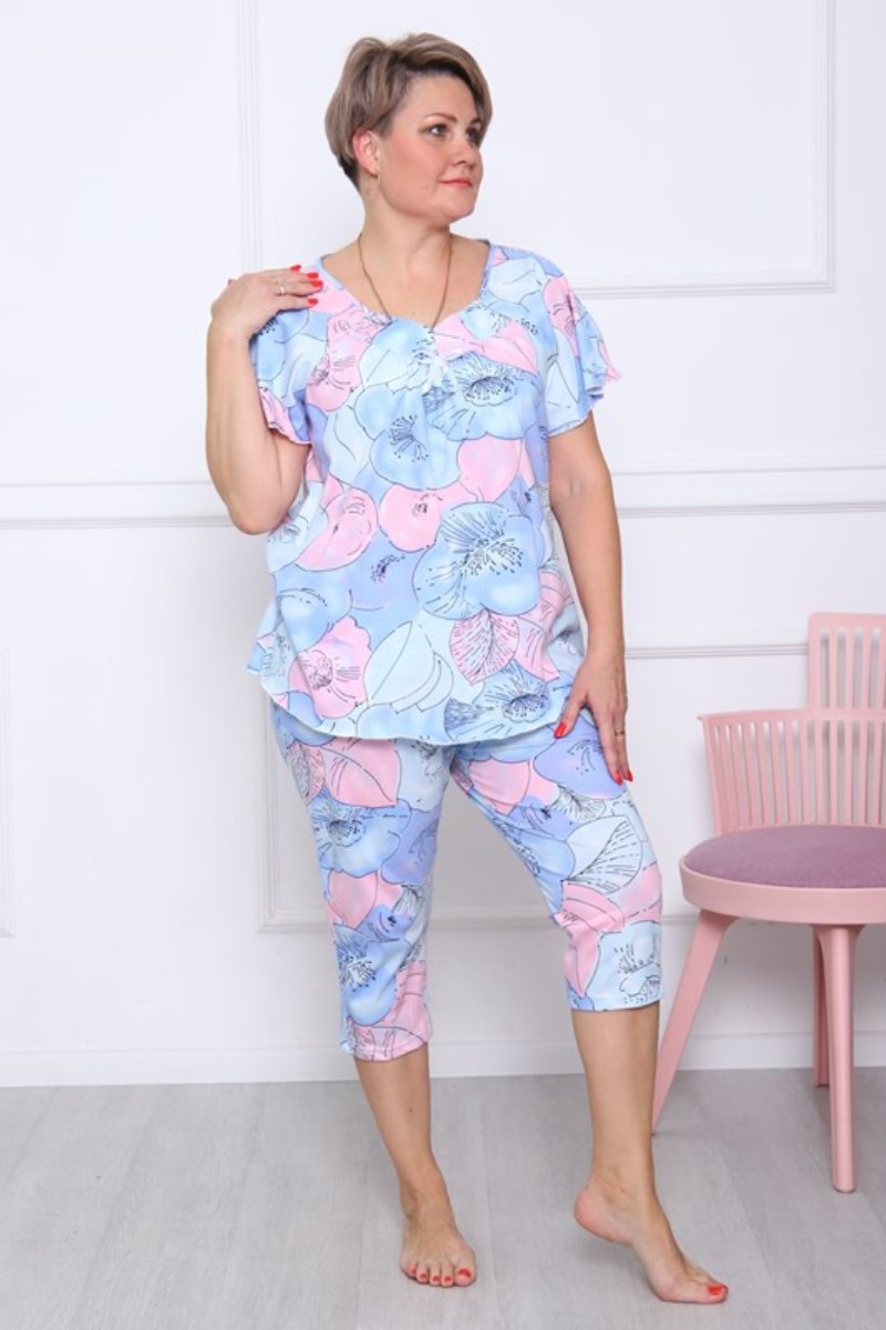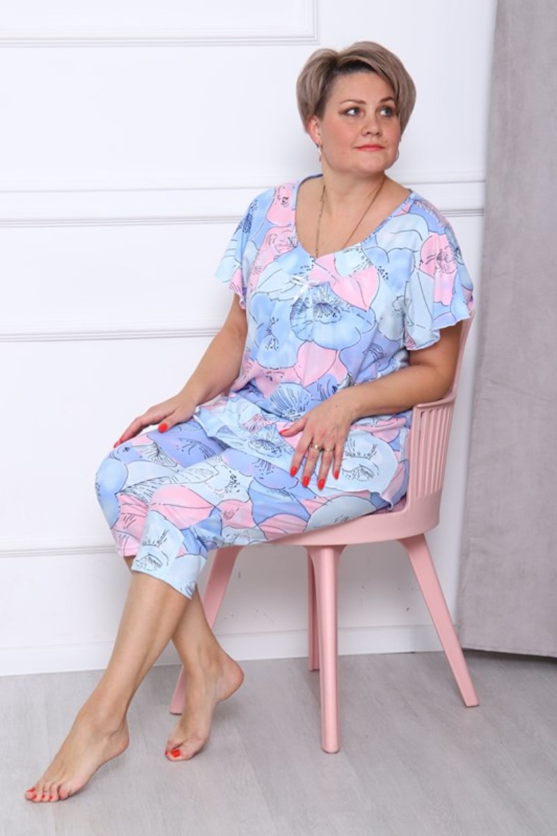 Представляем Вашему вниманию удобную и практичную женскую пижаму с бриджами, отдых в которой будет максимально приятным и расслабляющим. Изящный комплект, украшенный нежным принтом, выполнен из высококачественного, натурального материала, который хорошо пропускает воздух, позволяя коже дышать.
