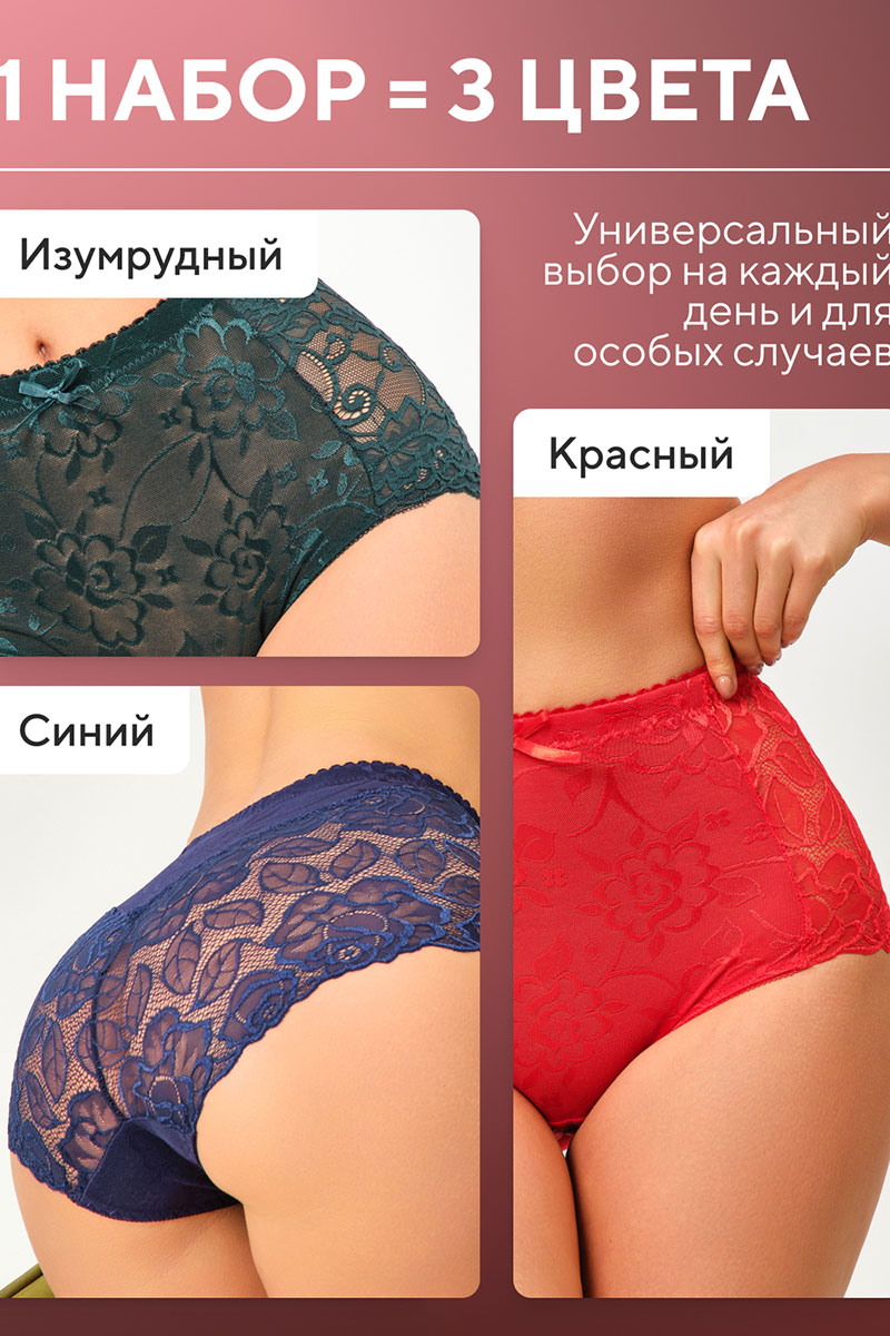 Трусы женские 98261 OIRO кружево (последний размер) синий, красный, изумрудный - упаковка 3 шт. 50-52,56-58