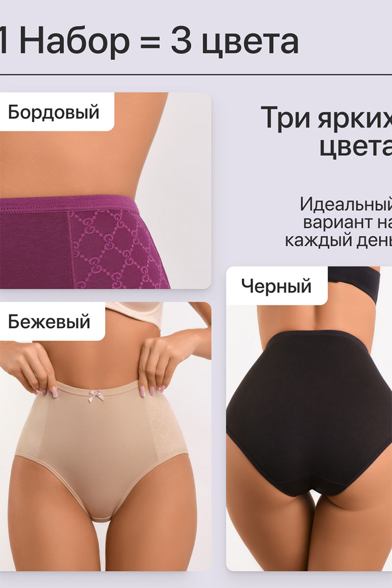 Представляем Вашему вниманию набор трусов 3 шт., высокие. Это превосходный выбор для девушек, которые ценят комфорт и элегантность в одежде. Изготовленные из мягкой и прочной ткани, они идеально подходят для женщин любых форм, обеспечивая идеальную посадку и поддержку. Благодаря удобному крою и эластичной резинке в поясе, эти трусы обеспечивают идеальную посадку и не натирают кожу.