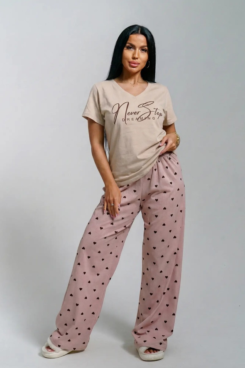 Представляем Вашему вниманию стильную и комфортную пижаму, состоящую из футболки и брюк — идеальный выбор для уютных вечеров и спокойного сна! Футболка выполнена из смеси 60% хлопка и 40% полиэстера, что обеспечивает мягкость и долговечность. Спущенные рукава придают ей расслабленный и модный вид, а качественная печать на полочке добавляет индивидуальности. Брюки из 100% хлопка обеспечивают максимальный комфорт и воздухопроницаемость, а удлиненный крой и наличие карманов делают их практичными для повседневного использования. Пижама выполнена в стиле оверсайз, что позволяет свободно двигаться и чувствовать себя комфортно в любое время суток.