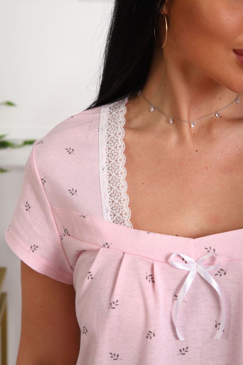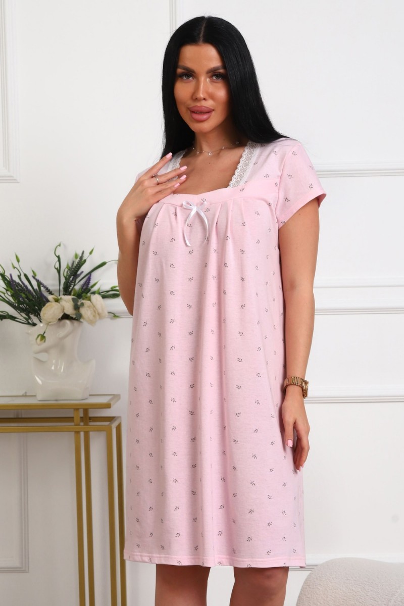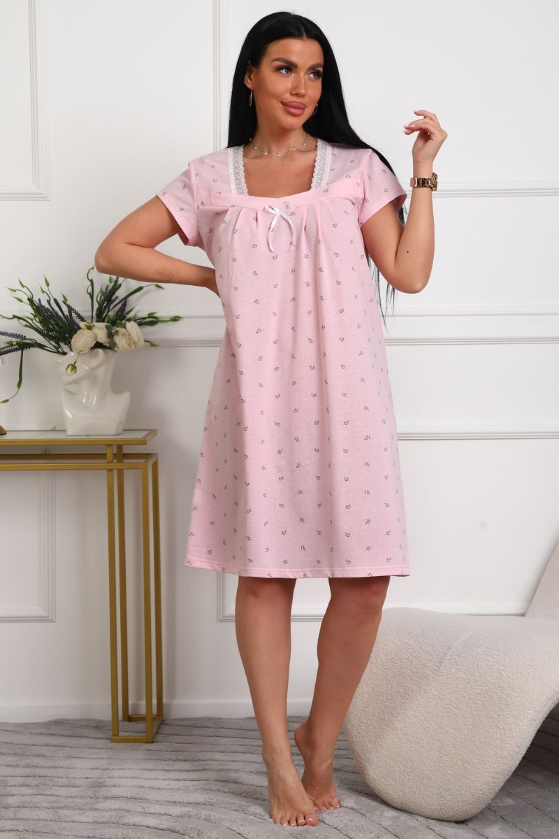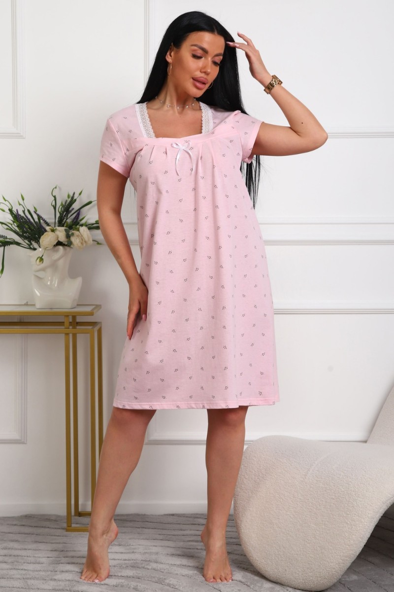 Представляем Вашему вниманию изящную женскую сорочку, сшитую из приятной телу, высококачественной кулирки - 100% хлопок, позволяющий коже дышать. Силуэт прямой, длина чуть ниже колен, вырез горловины фигурный, рукав короткий, отделка кружево по горловине.