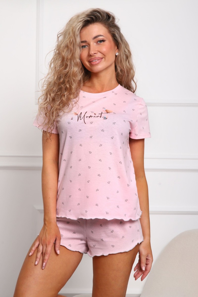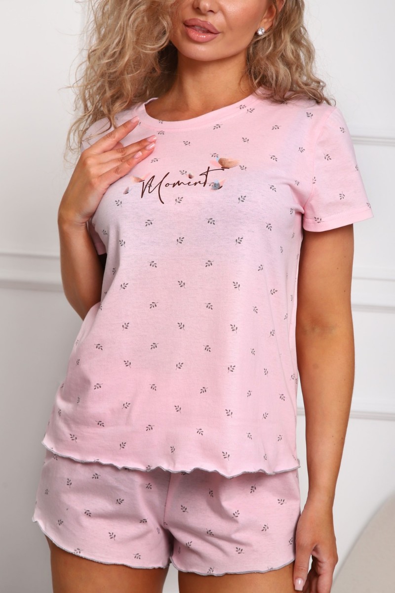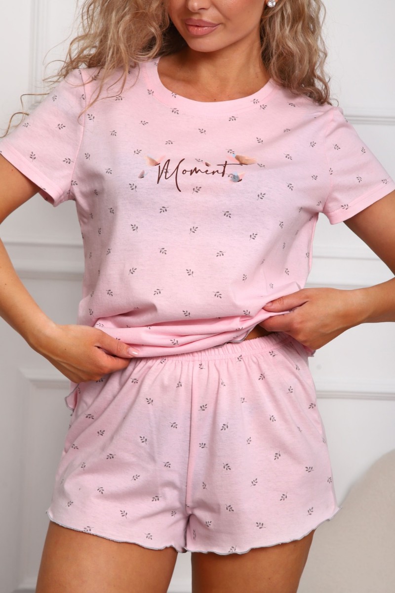 Представляем Вашему вниманию изящную женскую пижаму, сшитую из натурального набивного трикотажа. Верх - футболка с коротким рукавом. Горловина круглая. Прямого силуэта. По центру принт (шелкография). Шорты короткие, прямые, без карман. Пояс цельнокроеный на мягкой резинке. Низ футболки и шорт обработан на спецмашине нитками контрастного цвета.
