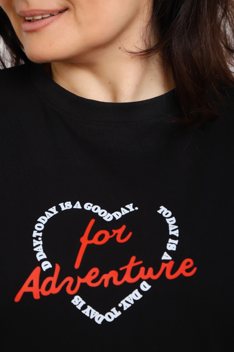 Представляем Вашему вниманию женскую тунику, сшитую из мягкого трикотажа кулирки, выполненная из смеси натуральных материалов: 95% хлопка и 5% лайкры, сочетает комфорт и стиль. Свобода посадки и прямой крой придают изделию легкий и непринужденный вид, подчеркивая природную красоту тела. Круглый вырез горловины и короткие рукава добавляют элегантности, делая эту вещь удобной для ежедневного ношения. Уникальной особенностью модели стал красочный принт на груди, представляющий собой надпись в форме сердца с позитивным посланием "Today Is A Good Day For Adventure", которое вдохновляет жить полной жизнью и каждый день встречать новые приключения. Туника доступна в сдвоенном размере, что позволяет удобно подбирать подходящий именно вам фасон, ощущая себя свободно и уверенно.