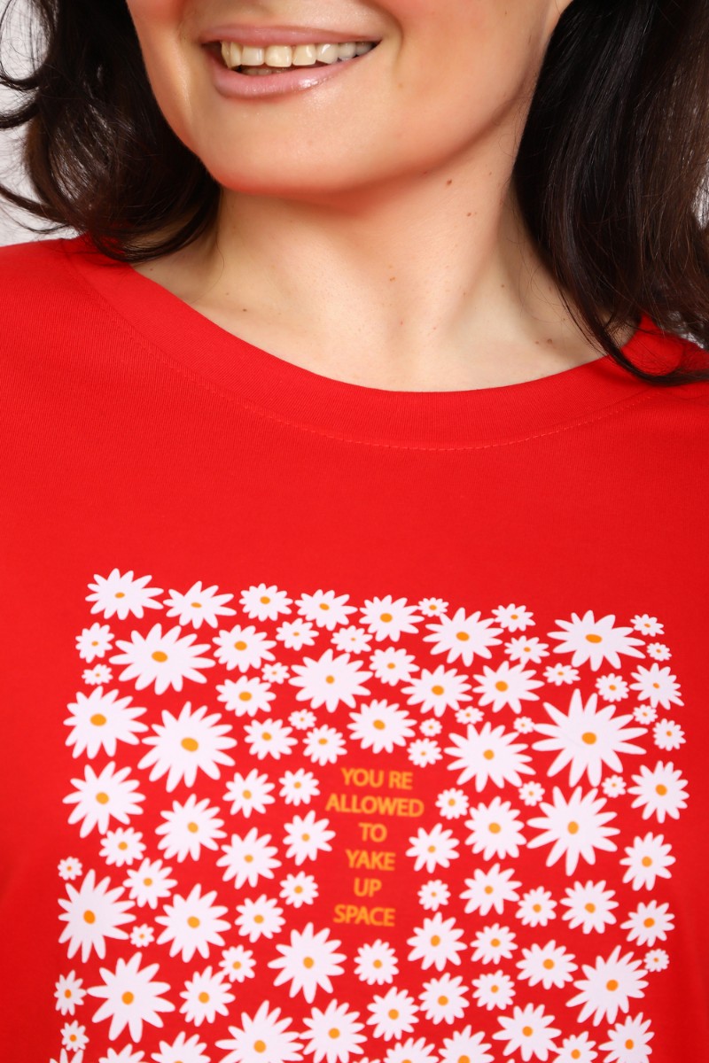 Представляем Вашему вниманию женскую тунику из мягкой и приятной к телу кулирки, выполненную из натурального хлопка (100%). Эта модель идеально подчеркнет вашу фигуру благодаря элегантному приталенному силуэту и слегка приспущенной линии плеча. Рукава длиной 3/4 делают образ комфортным и универсальным, а круглый вырез горловины добавляет легкости и нежности общему виду. Особенное внимание привлекает стильный принт на груди, украшенный изящной надписью и мелкими ромашками, создающими романтичное настроение. Свободная посадка обеспечивает комфорт и свободу движений, делая этот предмет гардероба идеальным выбором для повседневных образов и отдыха.