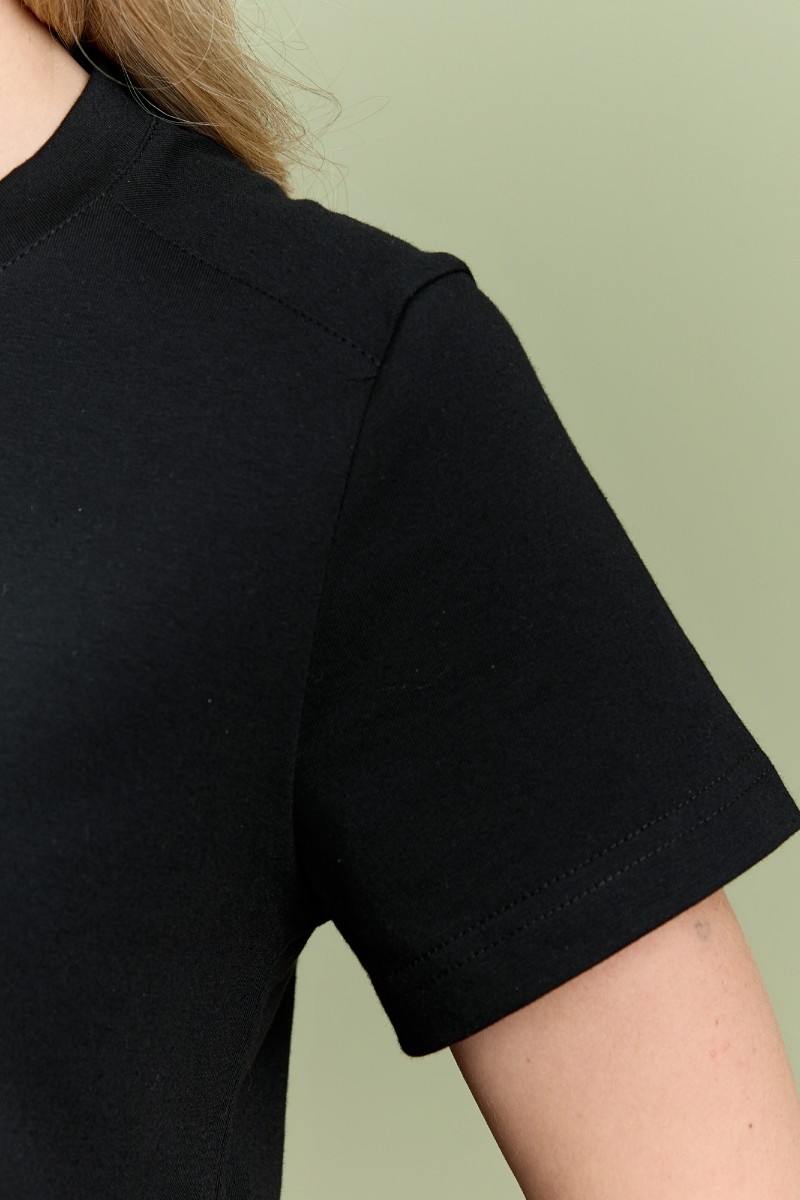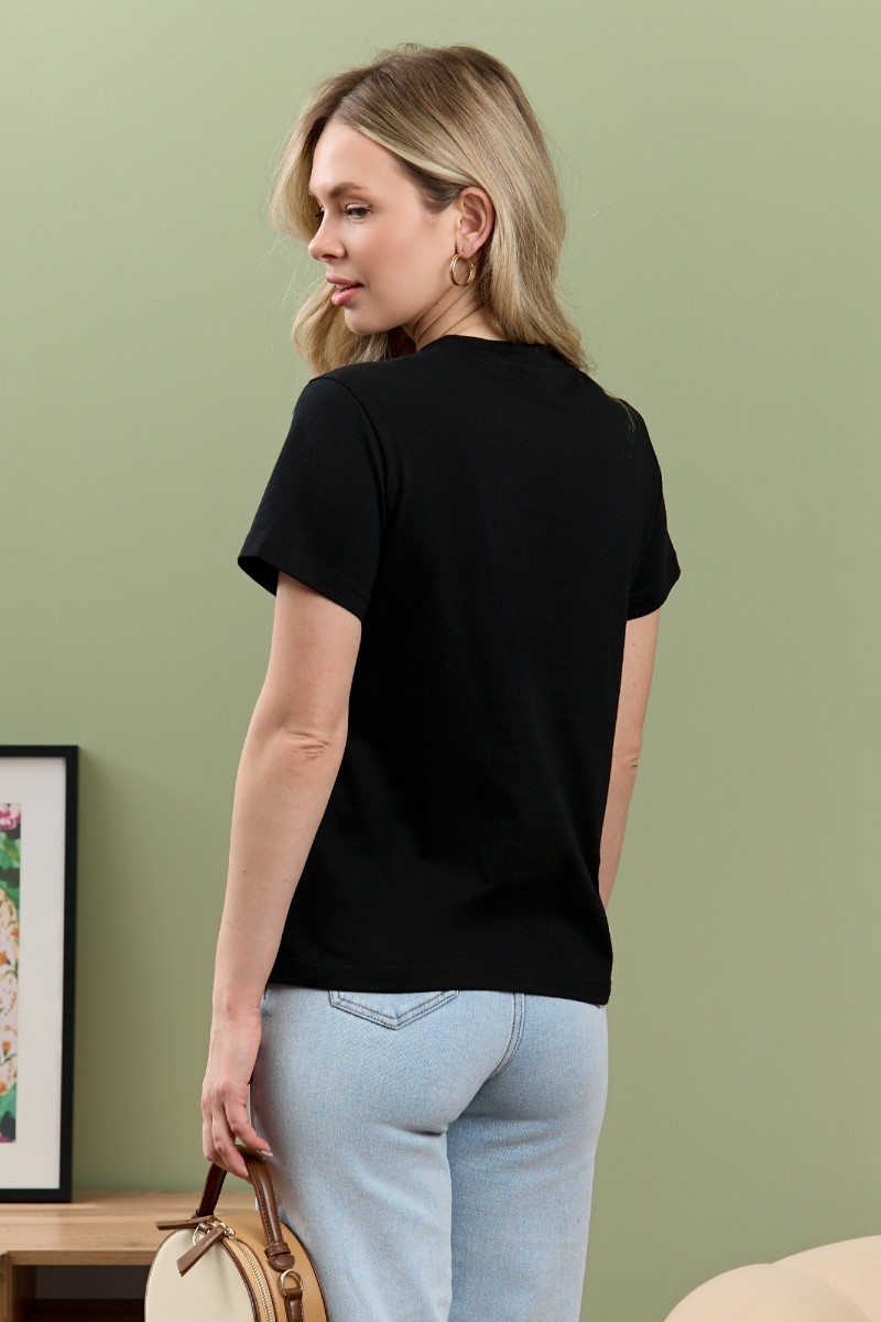 Представляем Вашему вниманию женскую футболку из гладкокрашеного полотна «кулирка», классического покроя, с короткими втачными рукавами, горловиной овальной формы, принтом на полочке, выполненным в технике «шелкографии». Плечевые швы изделия переходят на деталь переда, имитируя притачные кокетки, горловина обработана втачной планкой из основного материала.