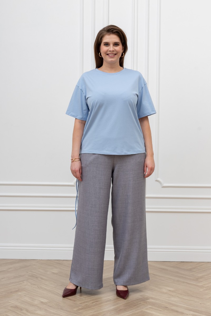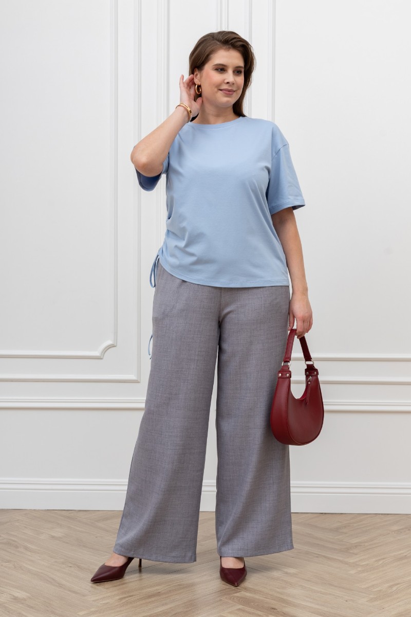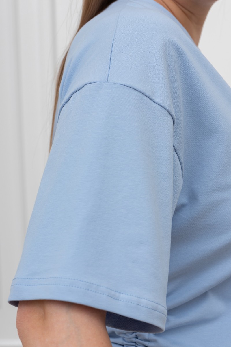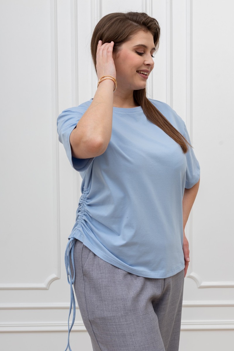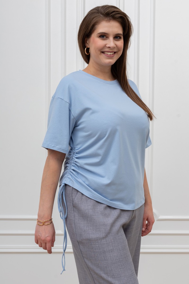 Представляем Вашему вниманию женскую футболку из гладкокрашеного трикотажного полотна «кулирка с лайкрой», полуприталенного силуэта, с короткими втачными рукавами, горловиной овальной формы, обработанной втачной планкой. Модным элементом является регулируемая сборка в боковом шве, выполненная с помощью «кулисы» и продетого в нее шнура.