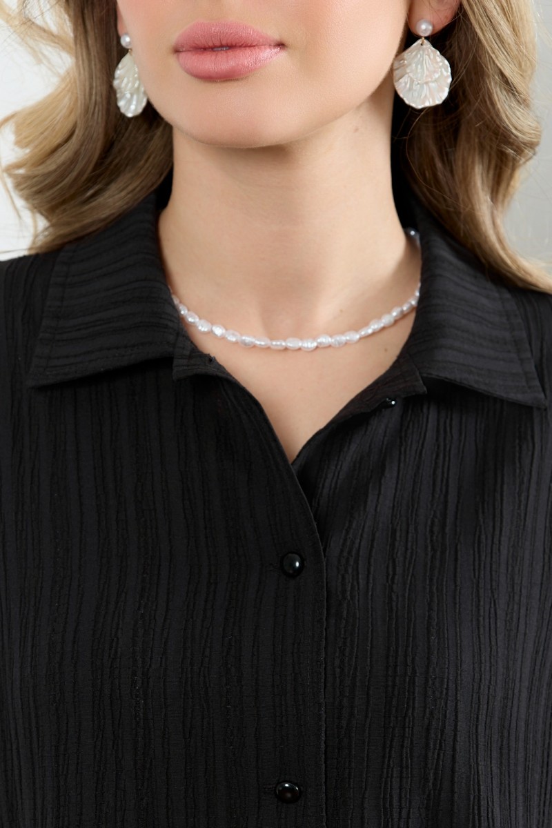 Представляем Вашему вниманию женскую рубашку из гладкокрашеного тканого полотна, свободного покроя, с длинными втачными рукавами, стояче-отложным воротником, фигурной линией низа и центральной бортовой застежкой на обметанные петли и пуговицы. Рукава – с притачными манжетами застегиваются на две обметанные петли и пуговицы.При выборе изделия в белом цвете идеальным решением будет выбор белья нейтральных (нюдовых) оттенков.