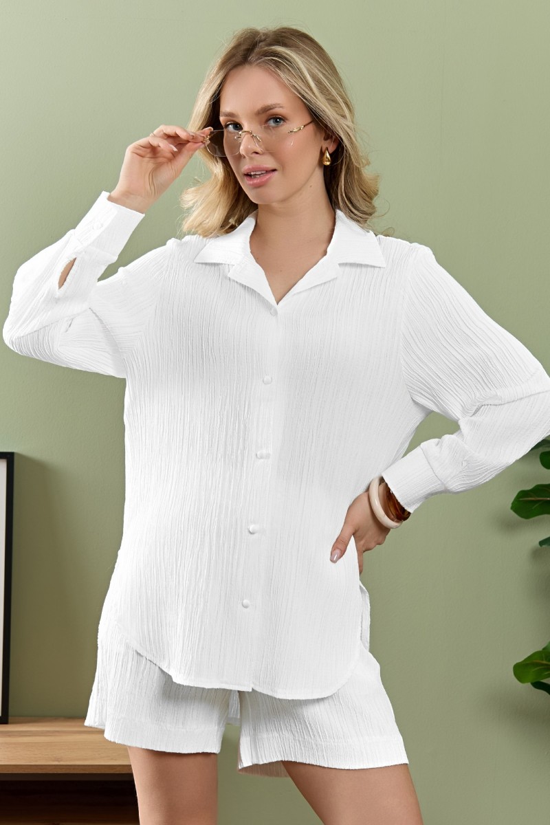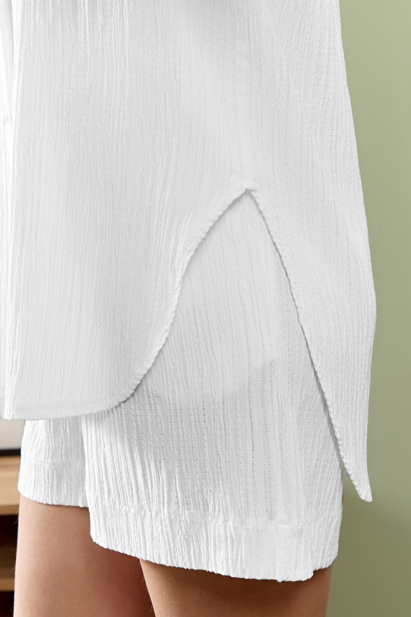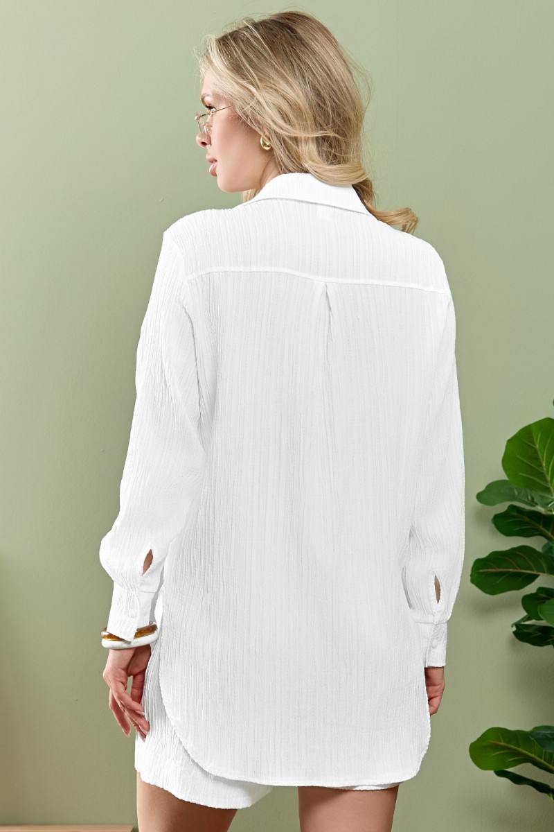 Представляем Вашему вниманию женскую рубашку из гладкокрашеного тканого полотна, свободного покроя, с длинными втачными рукавами, стояче-отложным воротником, фигурной линией низа и центральной бортовой застежкой на обметанные петли и пуговицы. Рукава – с притачными манжетами застегиваются на две обметанные петли и пуговицы.При выборе изделия в белом цвете идеальным решением будет выбор белья нейтральных (нюдовых) оттенков.