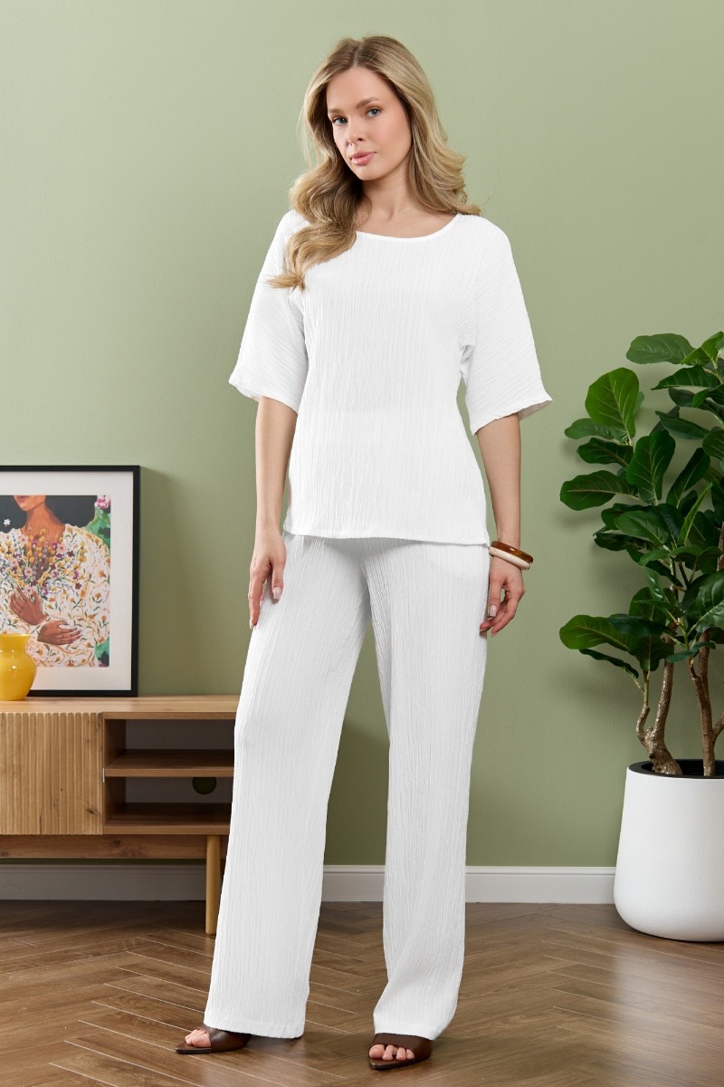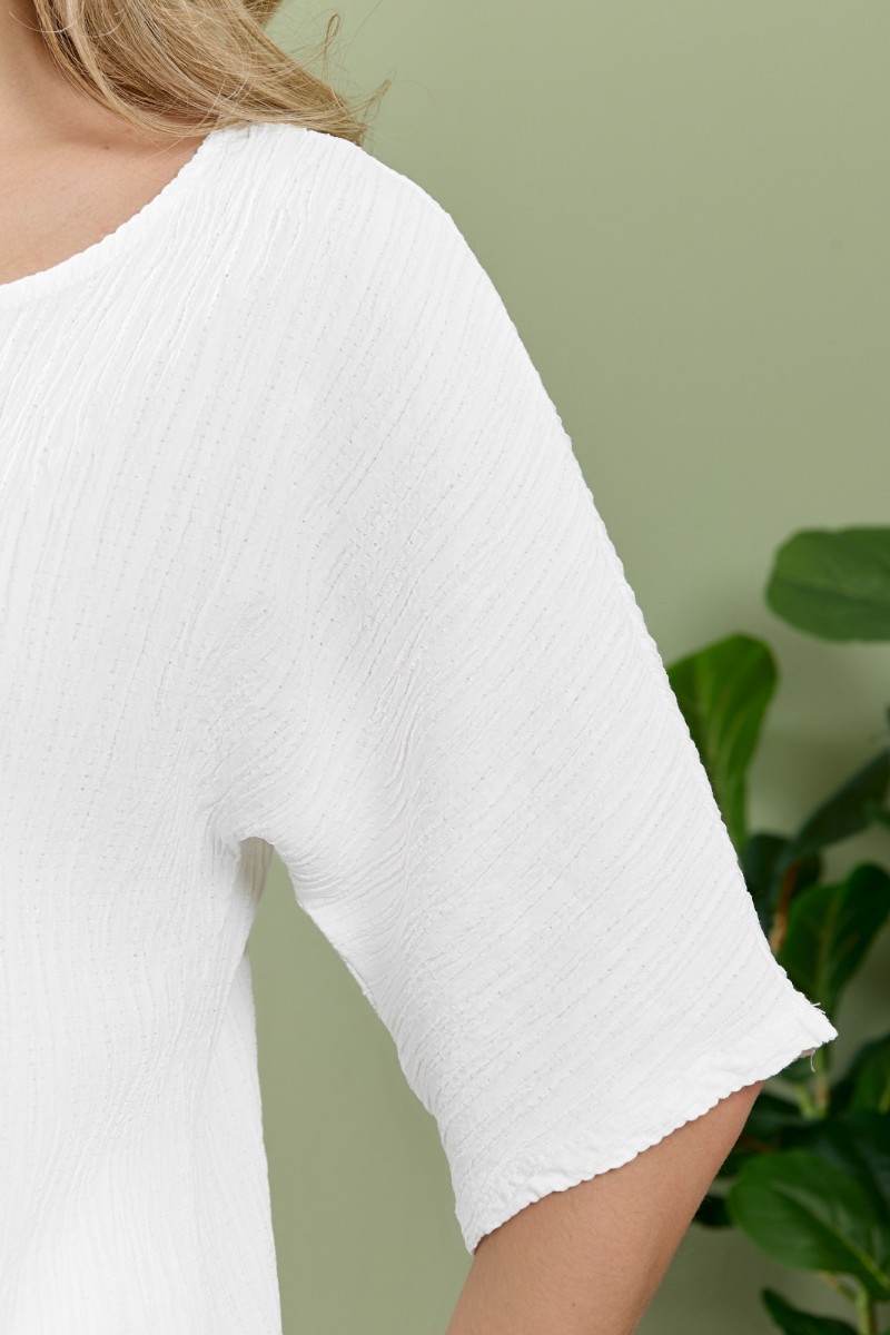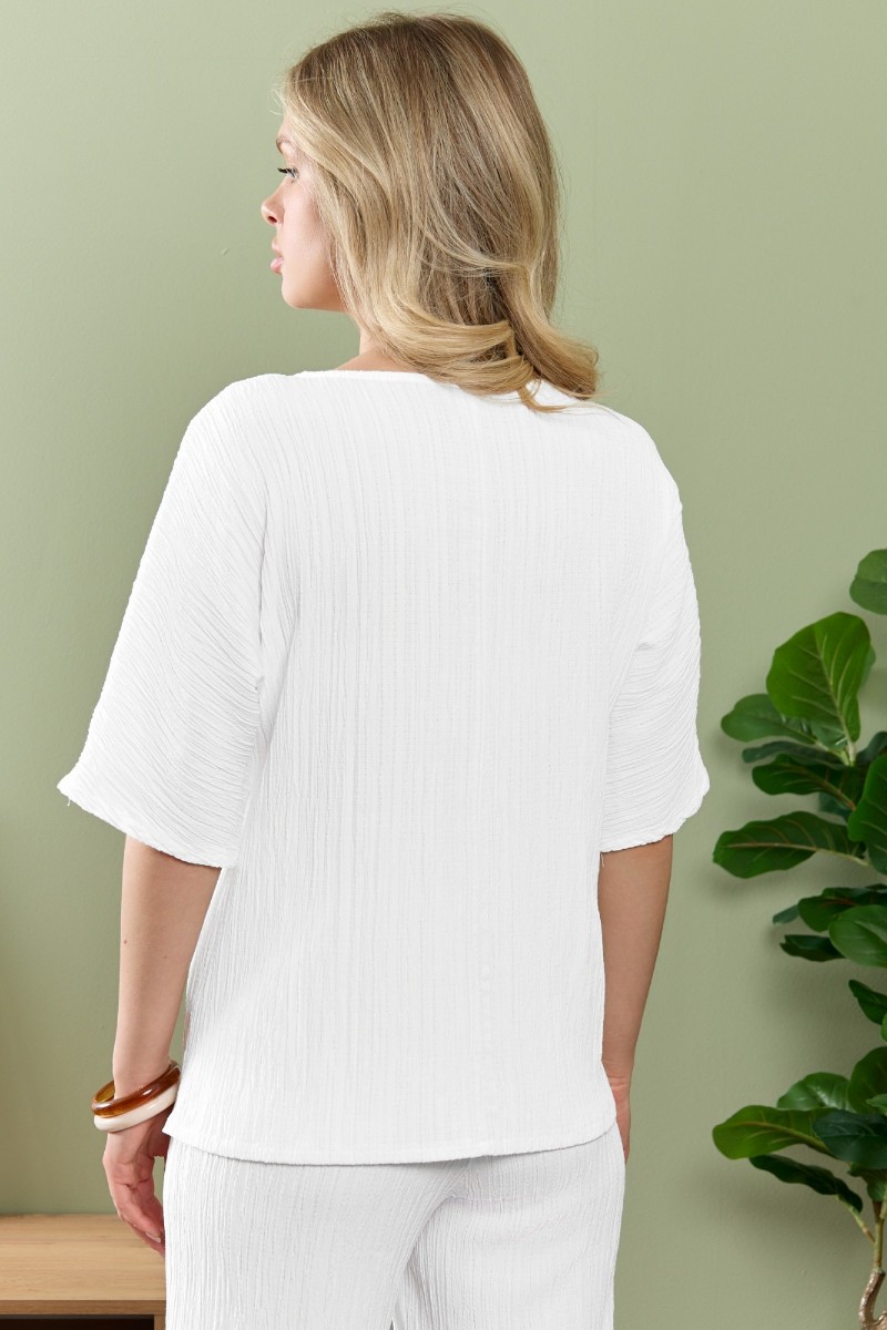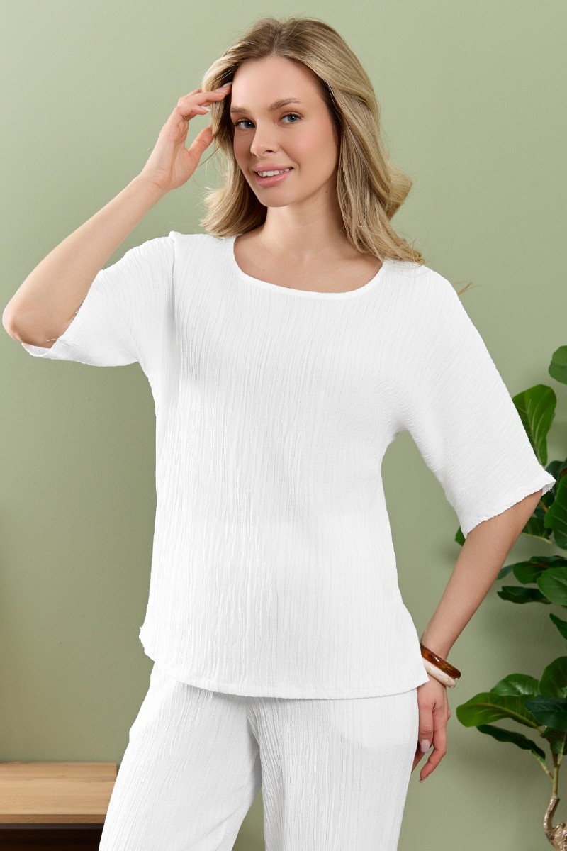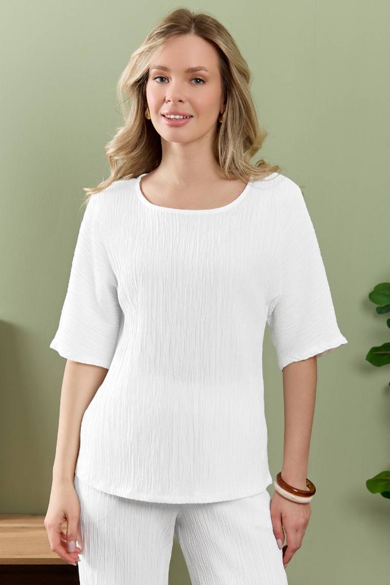 Представляем Вашему вниманию женскую блузку из гладкокрашеного тканого полотна, прямого силуэта, с горловиной овальной формы и цельнокроеными рукавами длиной до локтя. Горловина окантована основным материалом.При выборе изделия в белом цвете идеальным решением будет выбор белья нейтральных (нюдовых) оттенков.