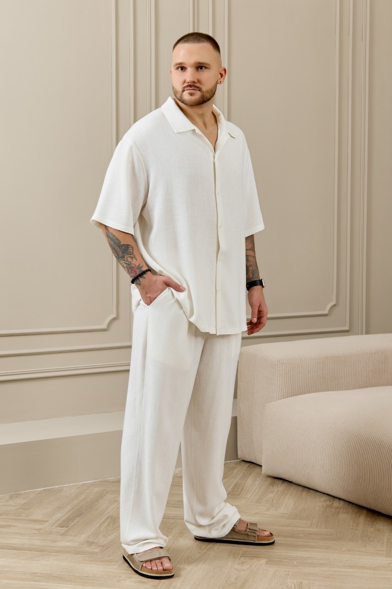 Представляем Вашему вниманию мужскую рубашку из фактурного полотна с втачными рукавами длиной до локтя, стояче-отложным воротником и центральной бортовой застежкой на петли и пуговицы. По воротнику и проймам настрочены отделочные строчки. Нижние срезы рукавов и изделия обработаны подгибкой.