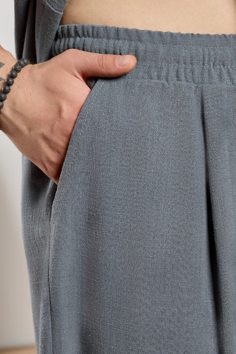 Представляем Вашему вниманию брюки мужские из фактурного полотна на притачном поясе с эластичной тесьмой внутри, с карманами в боковых швах. Средний шов передней половины выполнен с имитацией застежки "гульфик". Для регулирования степени прилегания изделия в области талии предусмотрен шнурок из основной ткани, вставленный в пояс через две обметанные петли. Нижние срезы брюк обработаны подгибкой.