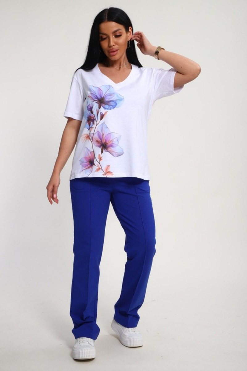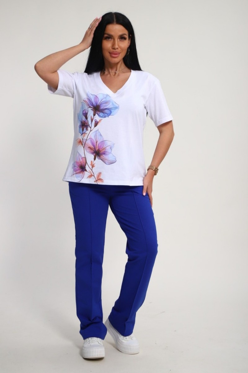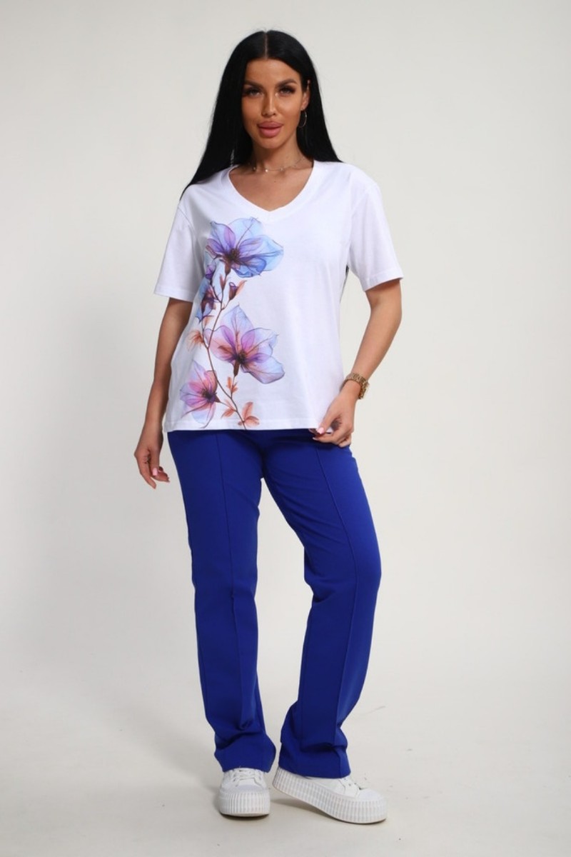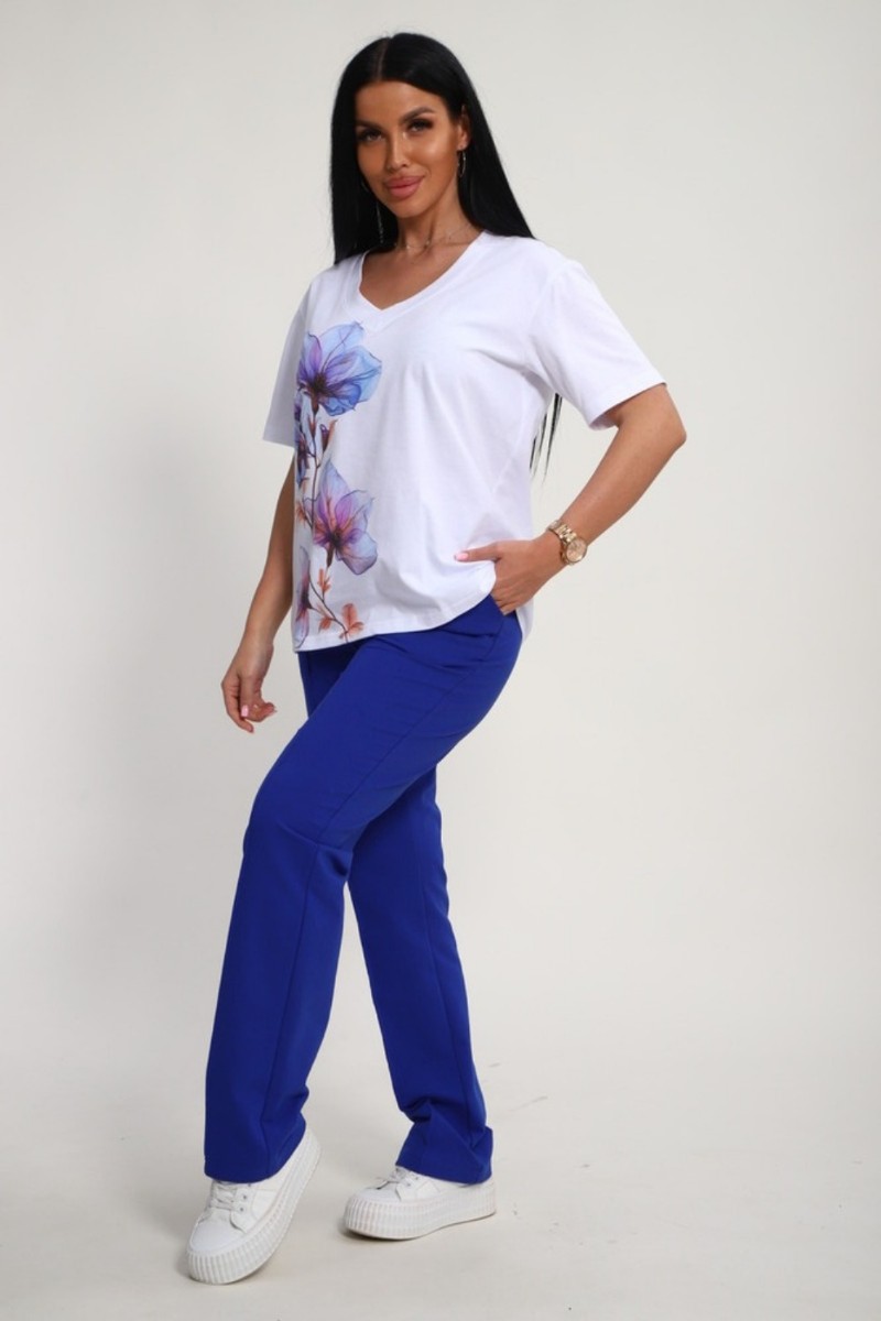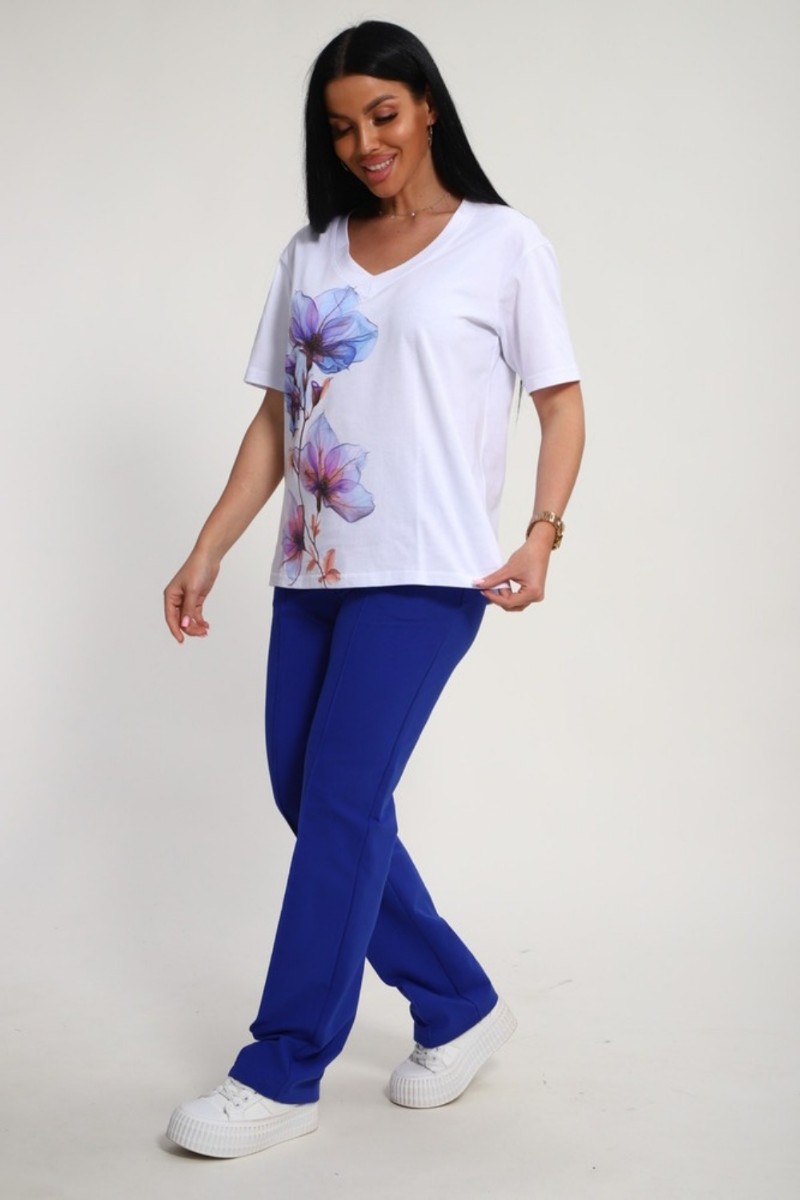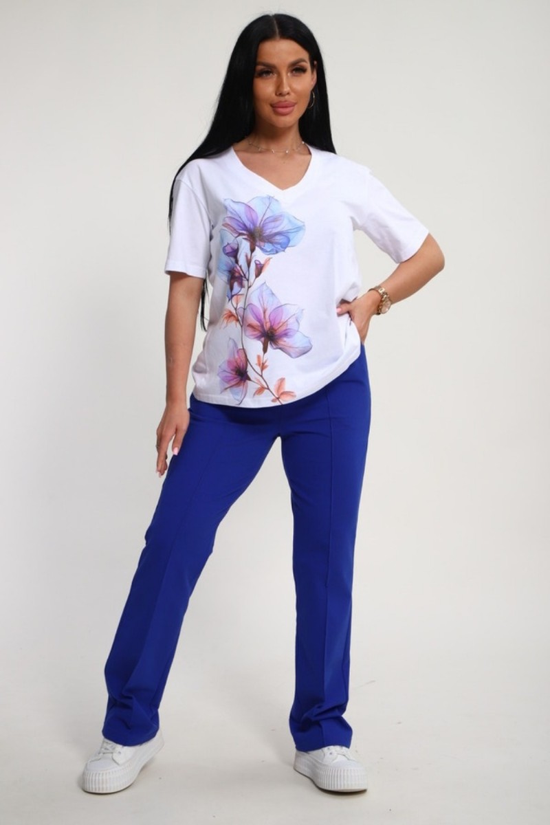 Представляем Вашему вниманию костюм женский – стильный и идеальный предмет гардероба, идеально подходящий для дома и отдыха на любой период: весенний, осенний, летний и зимний. Комплект состоит из футболки с красочным принтом и брюки со стрелками, в контрастном цвете. В составе ткани 100% хлопок. Хлопковый материал очень комфортный и лёгкий в носке.