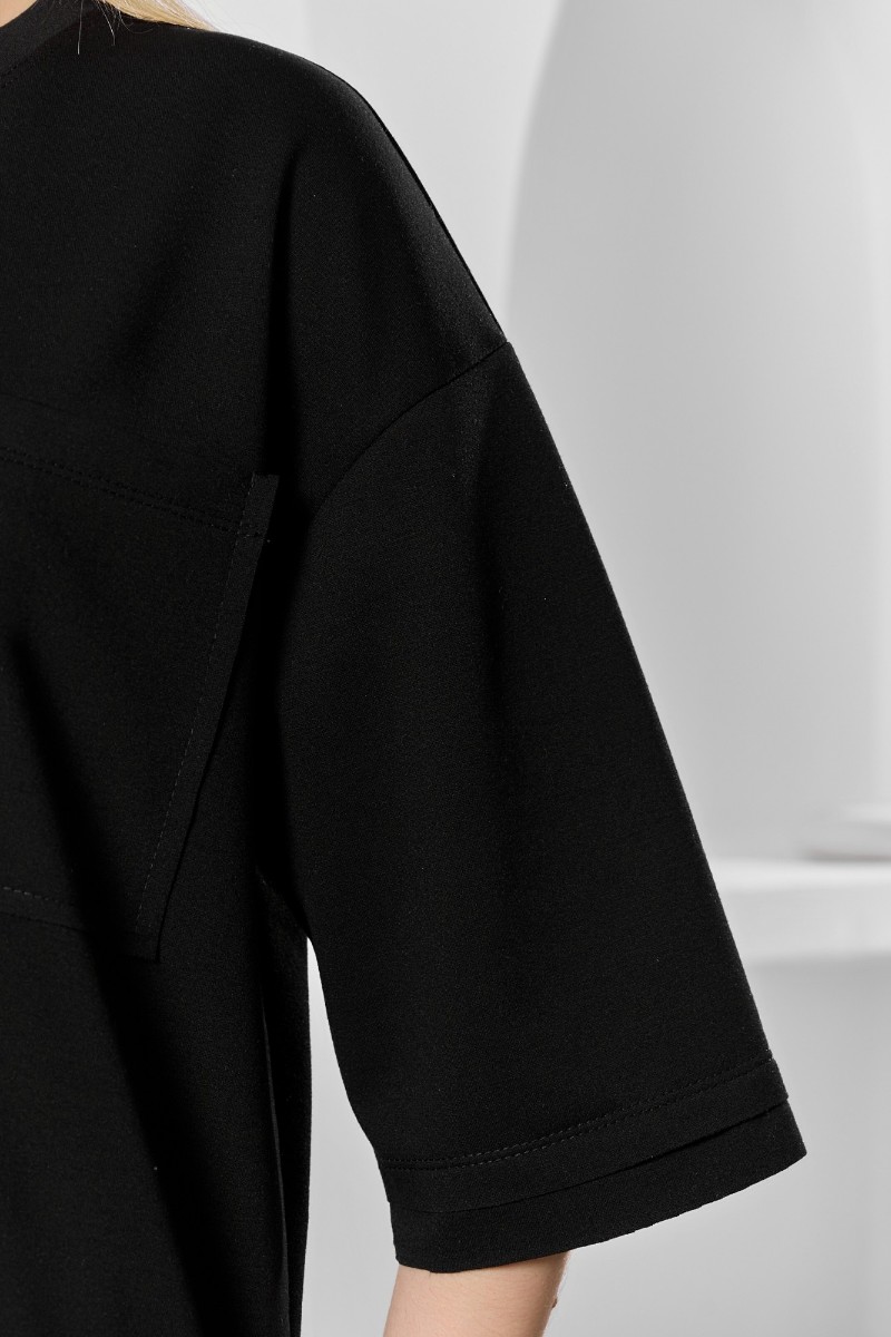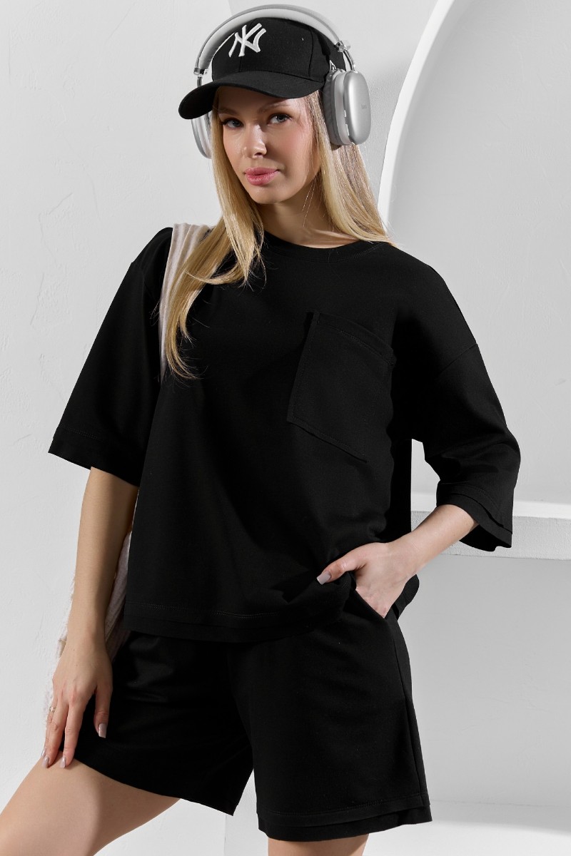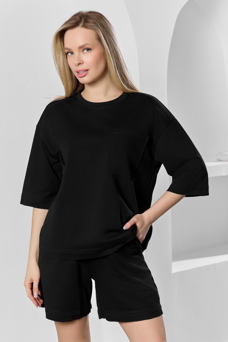 Представляем Вашему вниманию костюм женский из гладкокрашеного трикотажного полотна "футер с вискозой", состоящий из футболки и шорт.Футболка - свободного покроя, с горловиной овальной формы, обработанной втачной планкой из основного материала, спущенной линией плеча, короткими втачными рукавами, с нагрудным карманом, настроченным на полочку. Нижние срезы рукавов и изделия выполнены без подгибки с имитацией второго слоя.Шорты – средней длины, свободные, на притачном поясе с эластичной тесьмой внутри, карманами в боковых швах. Нижние срезы шорт без подгибки с имитацией второго слоя.