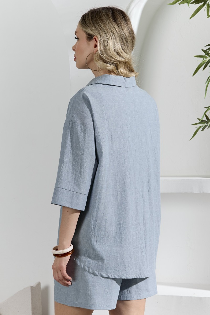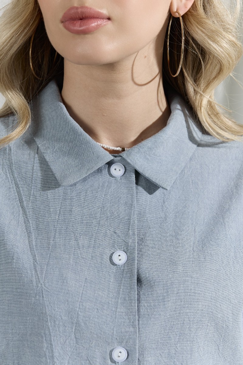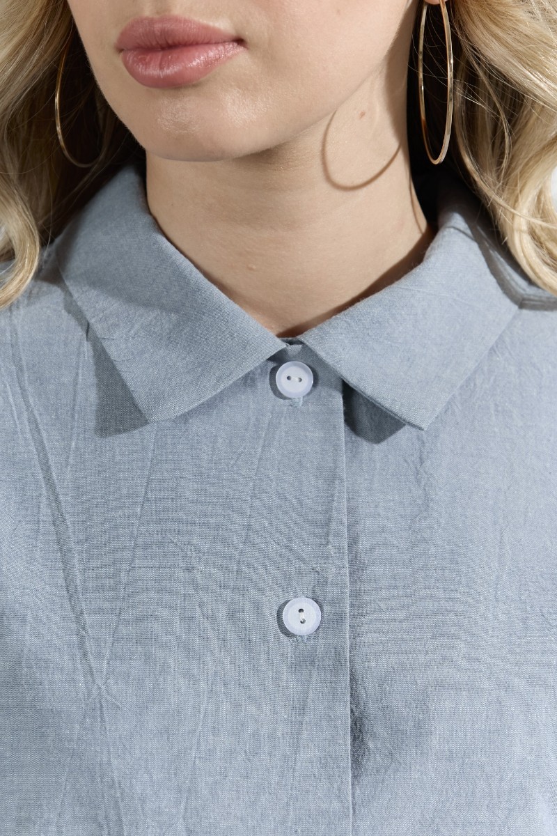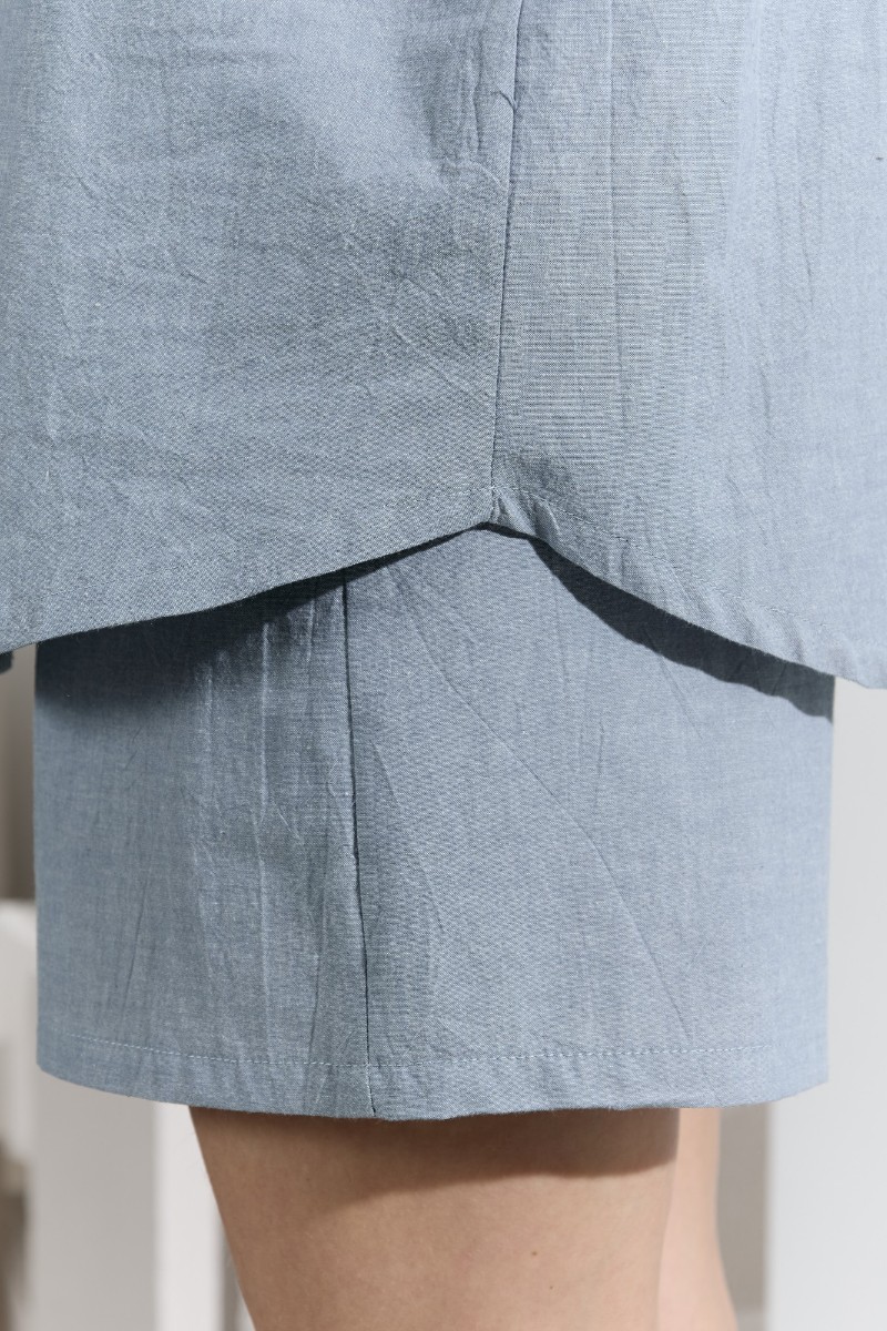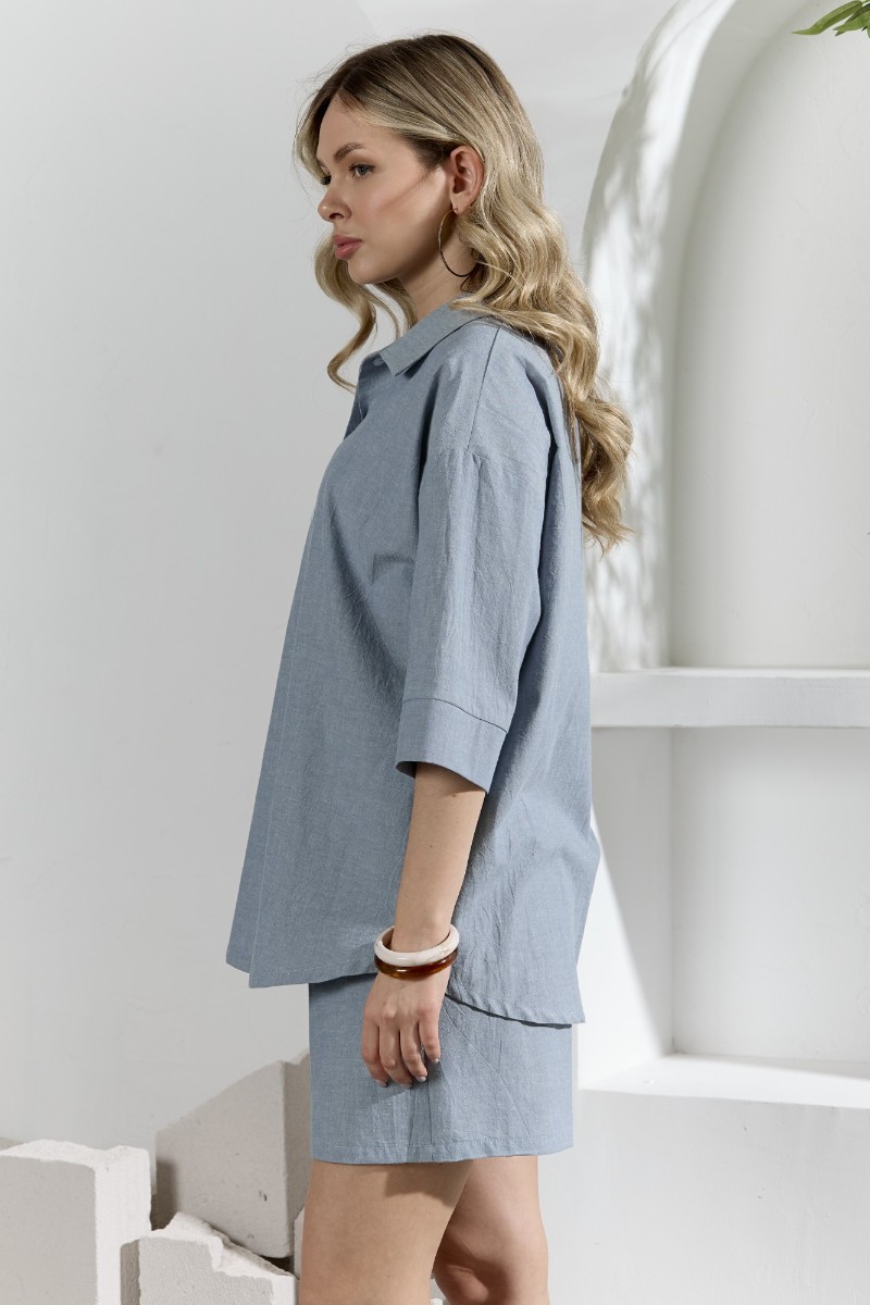 Представляем Вашему вниманию костюм женский из гладкокрашеного фактурного полотна, состоящий их рубашки и шорт. Рубашка - с втачными рукавами длиной чуть ниже локтя, с приспущенным плечом, стояче-отложным воротником, фигурной линией низа и центральной бортовой застежкой на обметанные петли и пуговицы. Рукава - с притачными манжетами. Шорты - средней длины, на притачном поясе с эластичной тесьмой внутри, с карманами в боковых швах. Нижние срезы обработаны подгибкой.