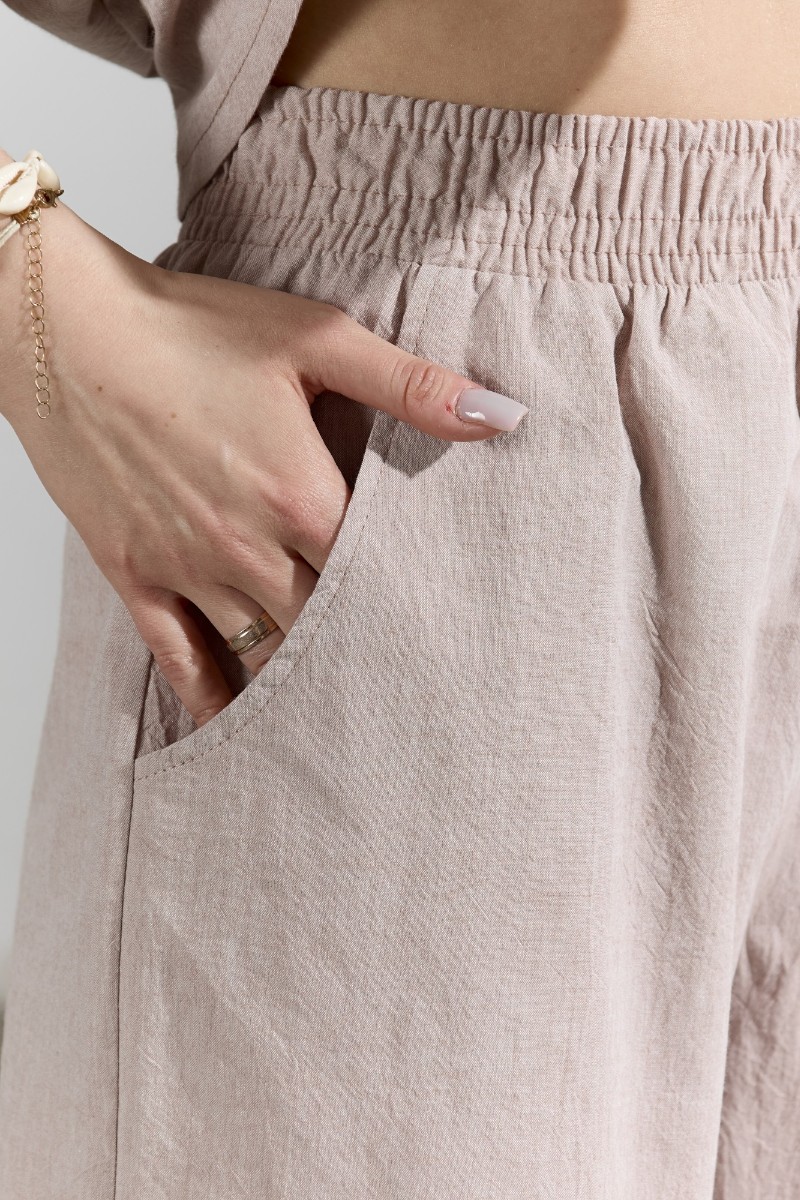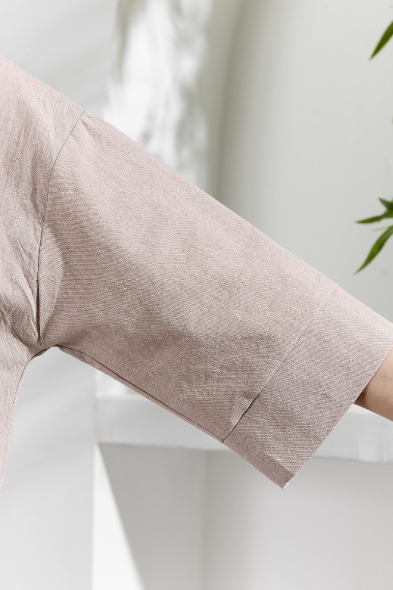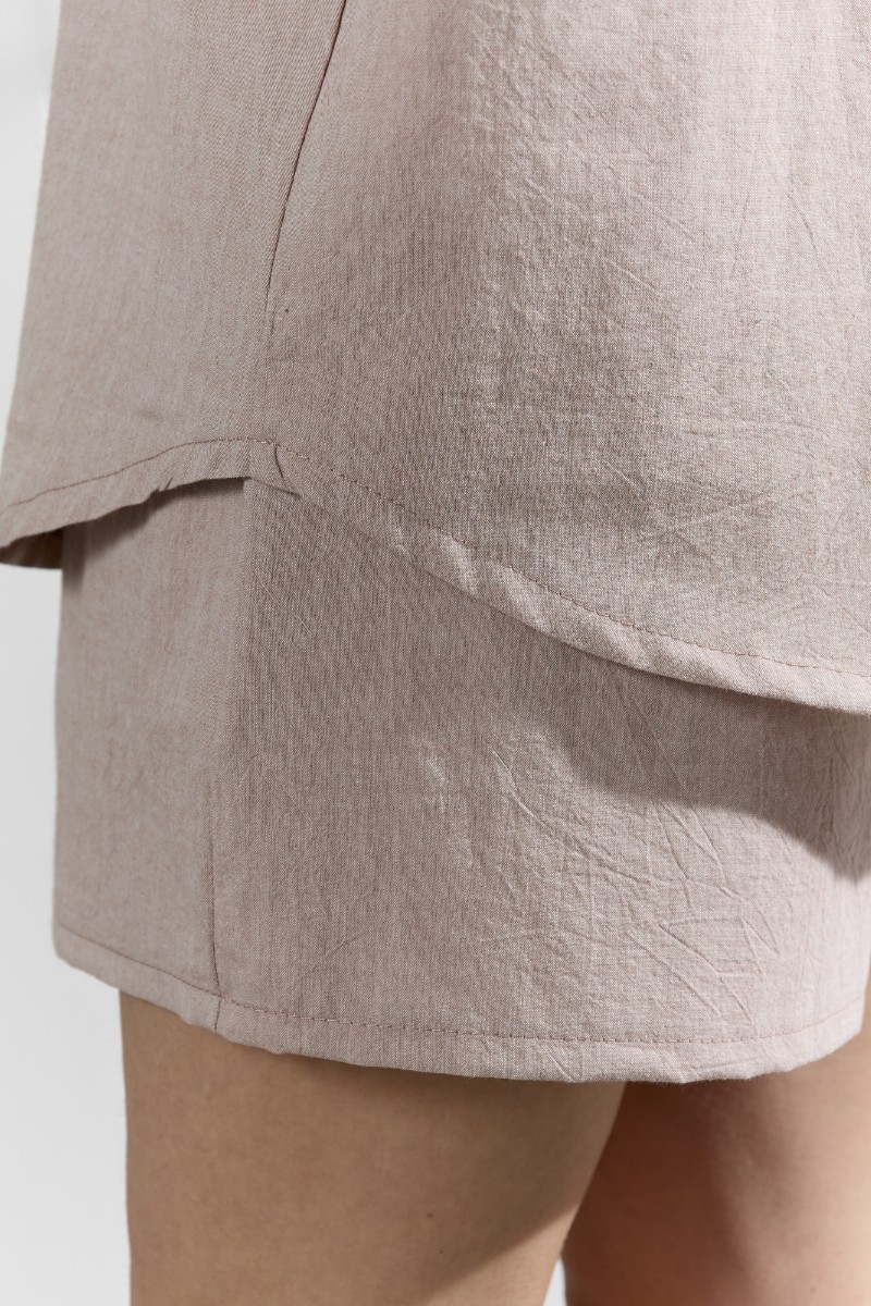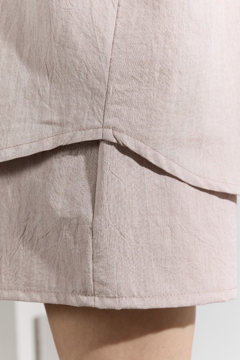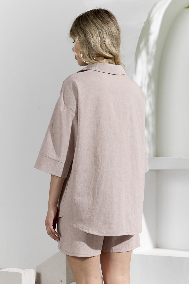 Представляем Вашему вниманию костюм женский из гладкокрашеного фактурного полотна, состоящий их рубашки и шорт. Рубашка - с втачными рукавами длиной чуть ниже локтя, с приспущенным плечом, стояче-отложным воротником, фигурной линией низа и центральной бортовой застежкой на обметанные петли и пуговицы. Рукава - с притачными манжетами. Шорты - средней длины, на притачном поясе с эластичной тесьмой внутри, с карманами в боковых швах. Нижние срезы обработаны подгибкой.