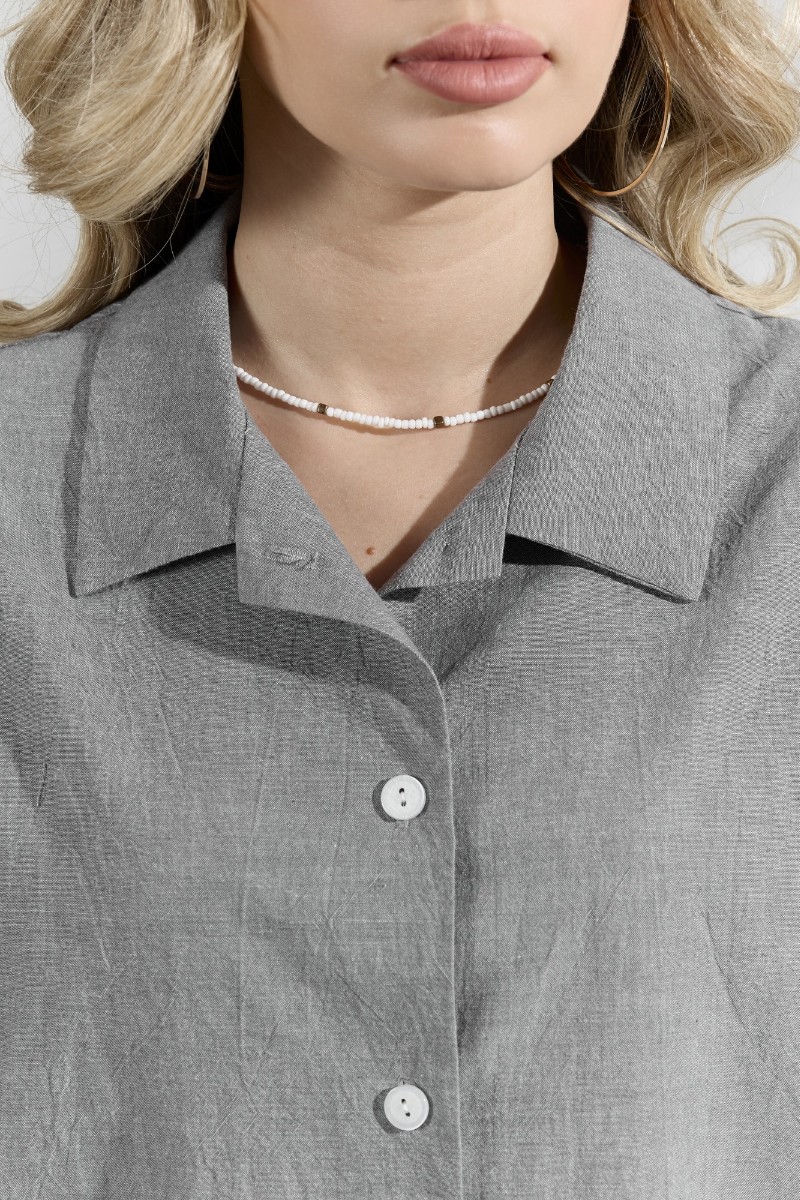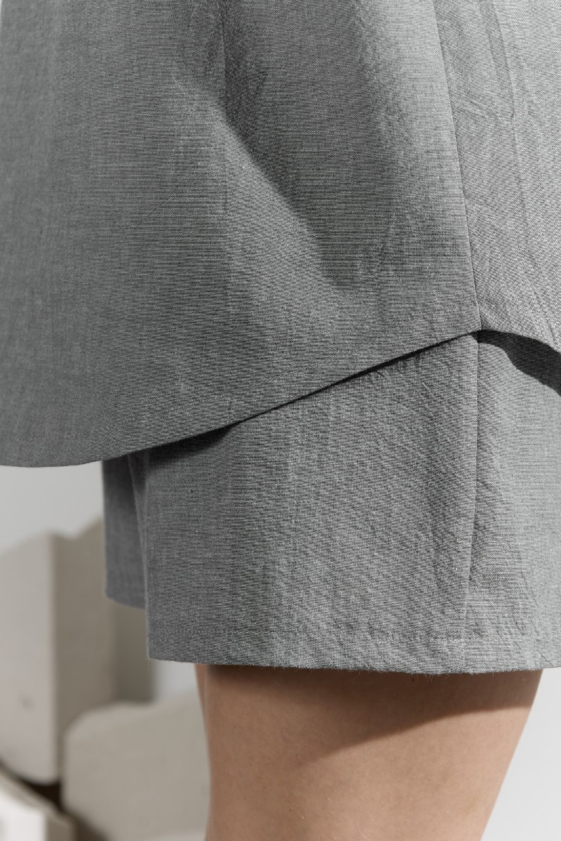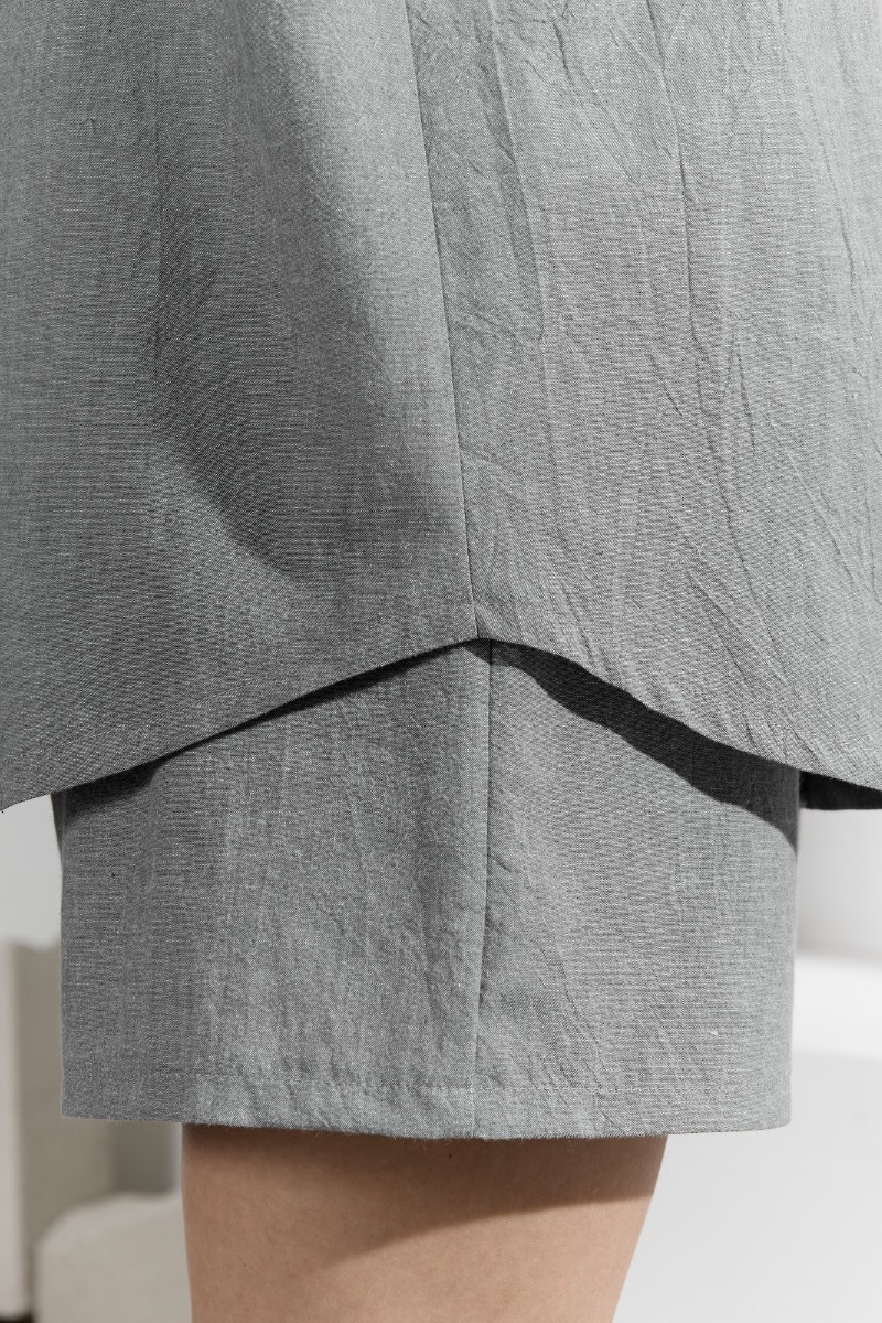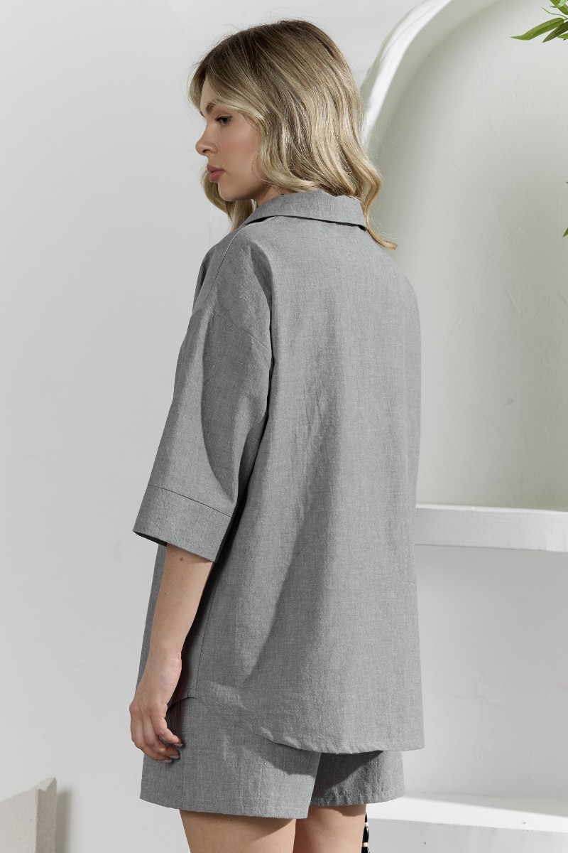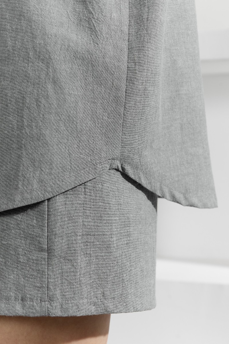 Представляем Вашему вниманию костюм женский из гладкокрашеного фактурного полотна, состоящий их рубашки и шорт. Рубашка - с втачными рукавами длиной чуть ниже локтя, с приспущенным плечом, стояче-отложным воротником, фигурной линией низа и центральной бортовой застежкой на обметанные петли и пуговицы. Рукава - с притачными манжетами. Шорты - средней длины, на притачном поясе с эластичной тесьмой внутри, с карманами в боковых швах. Нижние срезы обработаны подгибкой.