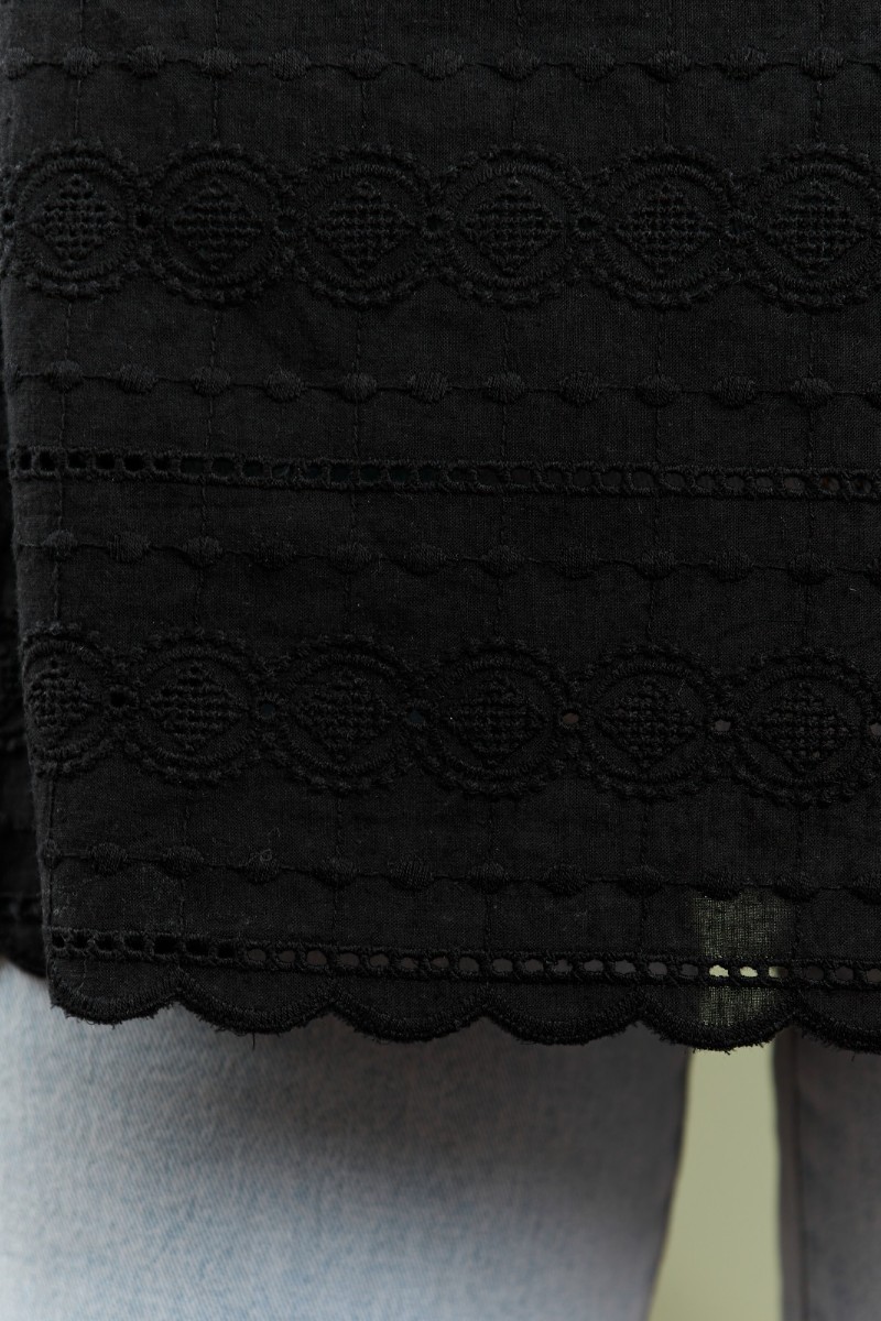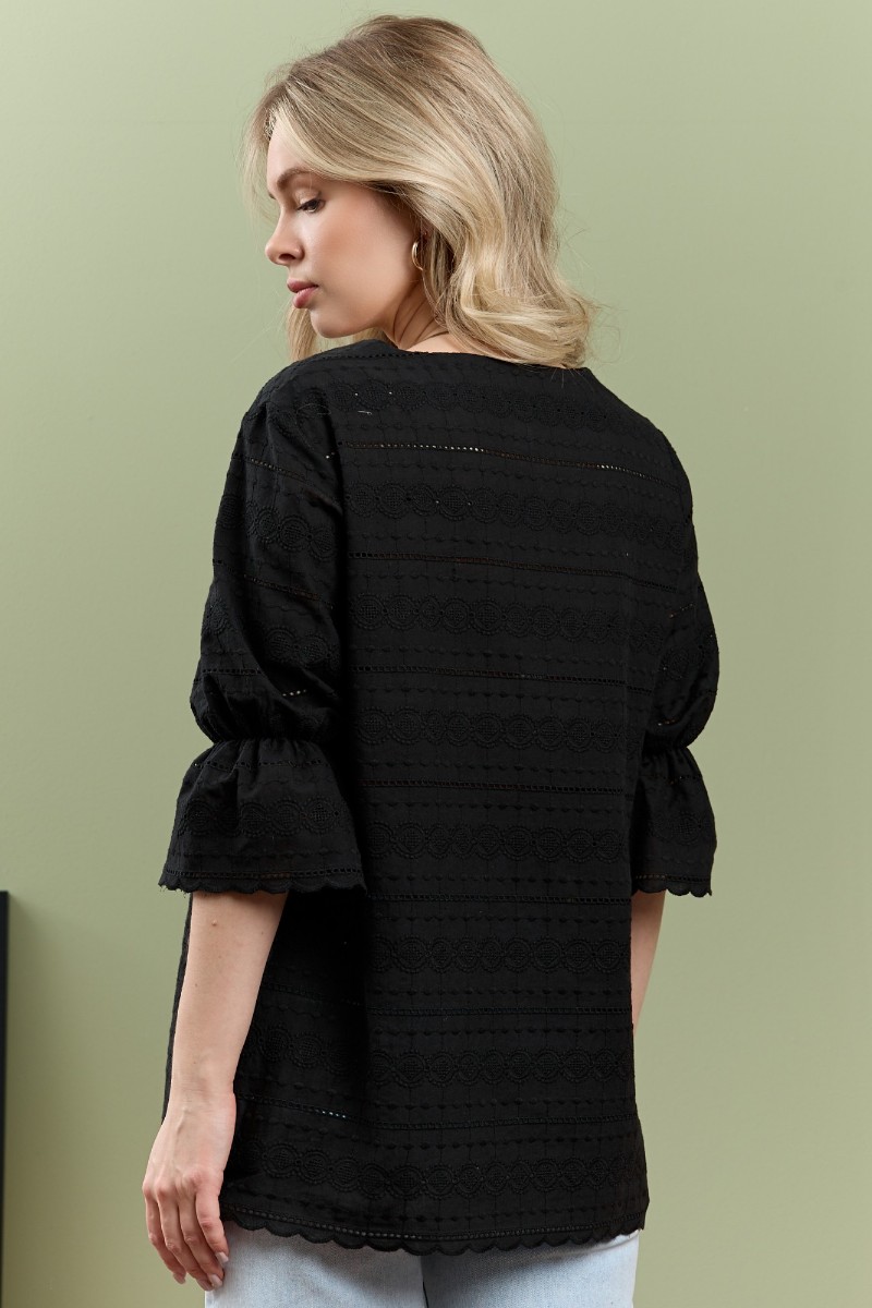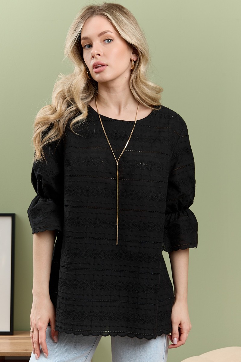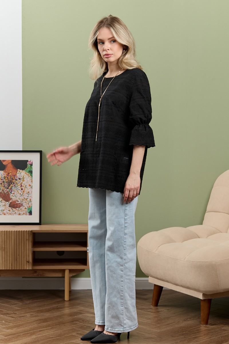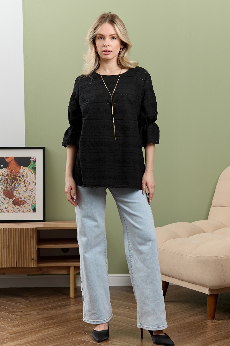Представляем Вашему вниманию женскую блузку из тканого гладкокрашеного полотна «шитье» прямого силуэта, с горловиной овальной формы, обработанной окантовкой и подогнутой внутрь, втачными рукавами 3/4 длины, присборенными на уровне локтевого сгиба с помощью эластичной тесьмы. Нижние срезы рукавов и изделия с «фестонным» краем.