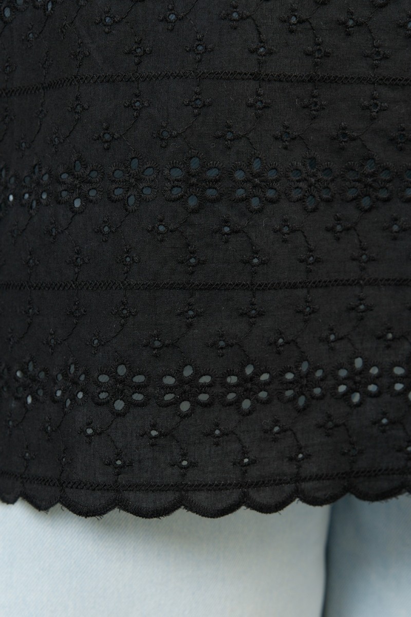 Представляем Вашему вниманию женскую блузку из тканого гладкокрашеного полотна «шитье» прямого силуэта, с V- образной горловиной, внутренней обтачкой, длинными втачными рукавами, слегка расширенными книзу, присборенными на уровне локтевого сгиба. Нижние срезы рукавов и изделия с «фестонным» краем.