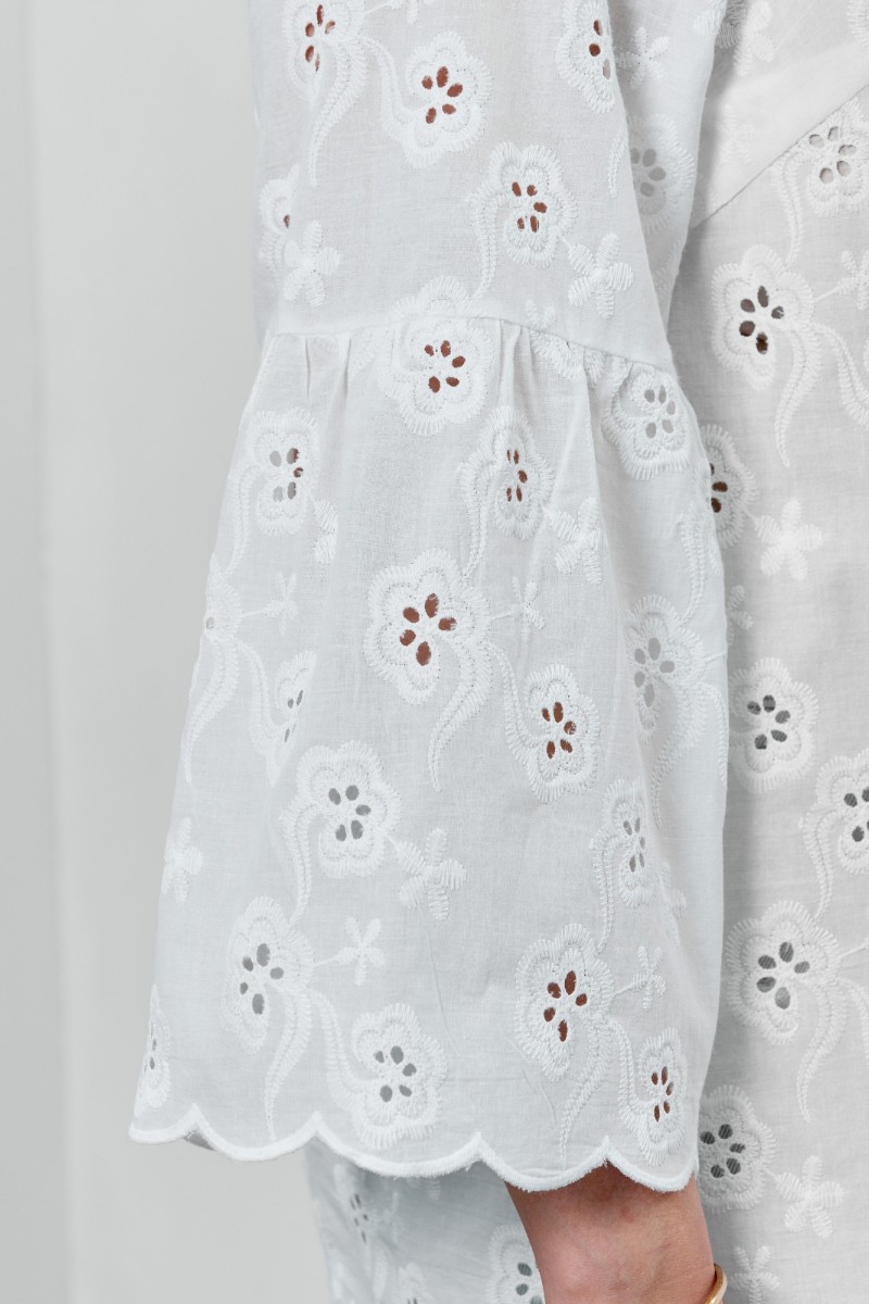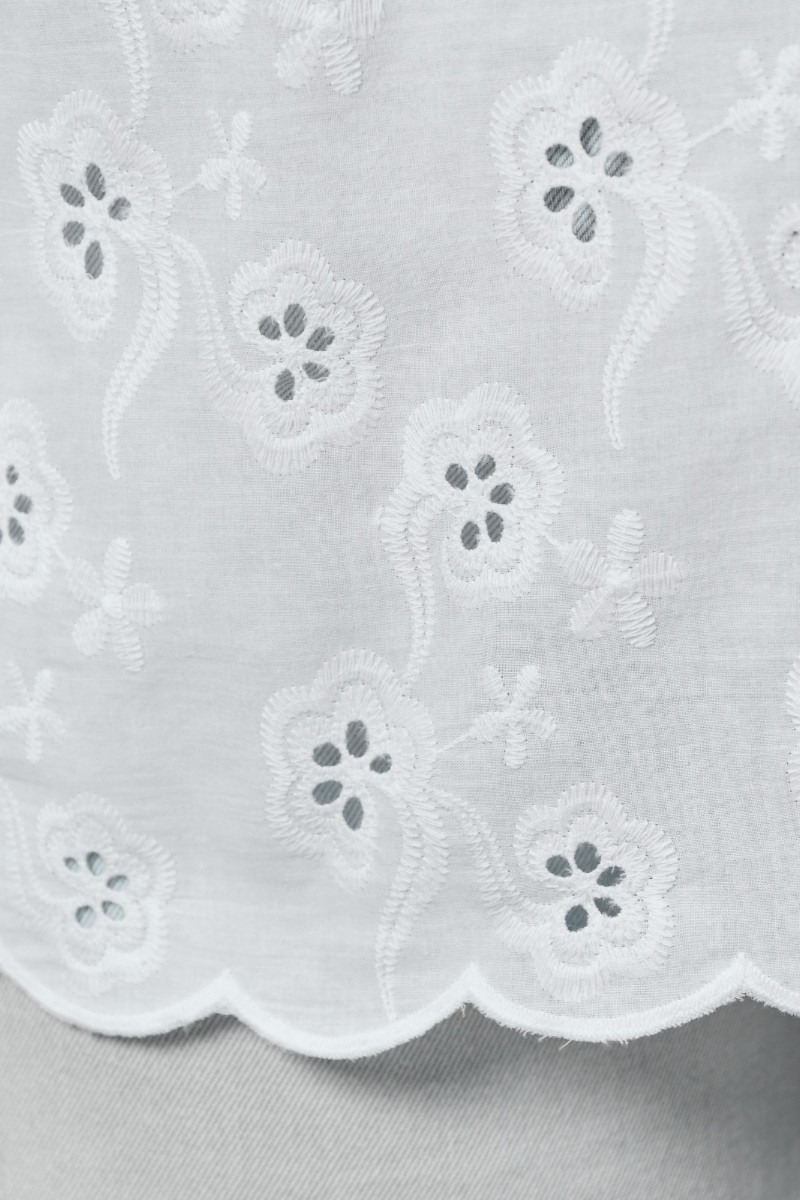 Представляем Вашему вниманию женскую блузку из тканого гладкокрашеного полотна «шитье» прямого силуэта, с V- образной горловиной, внутренней обтачкой, длинными втачными рукавами, слегка расширенными книзу, присборенными на уровне локтевого сгиба. Нижние срезы рукавов и изделия с «фестонным» краем.