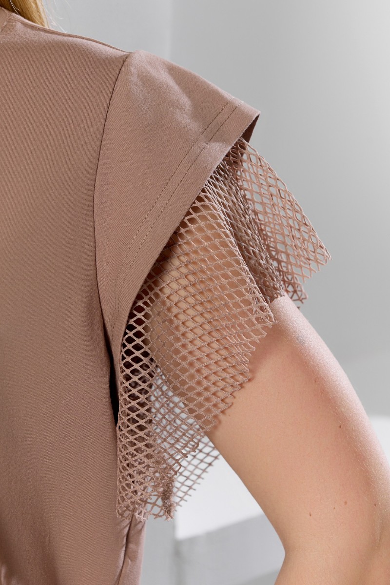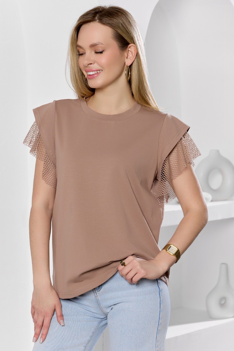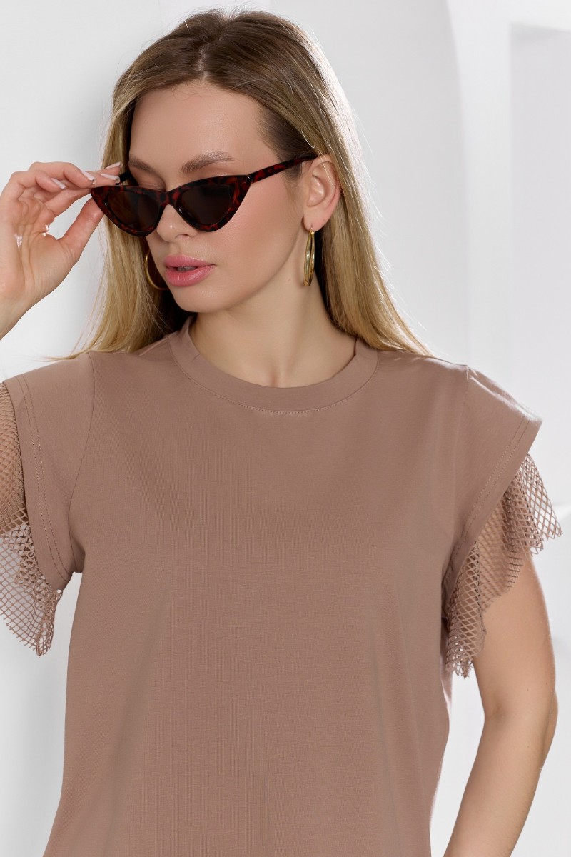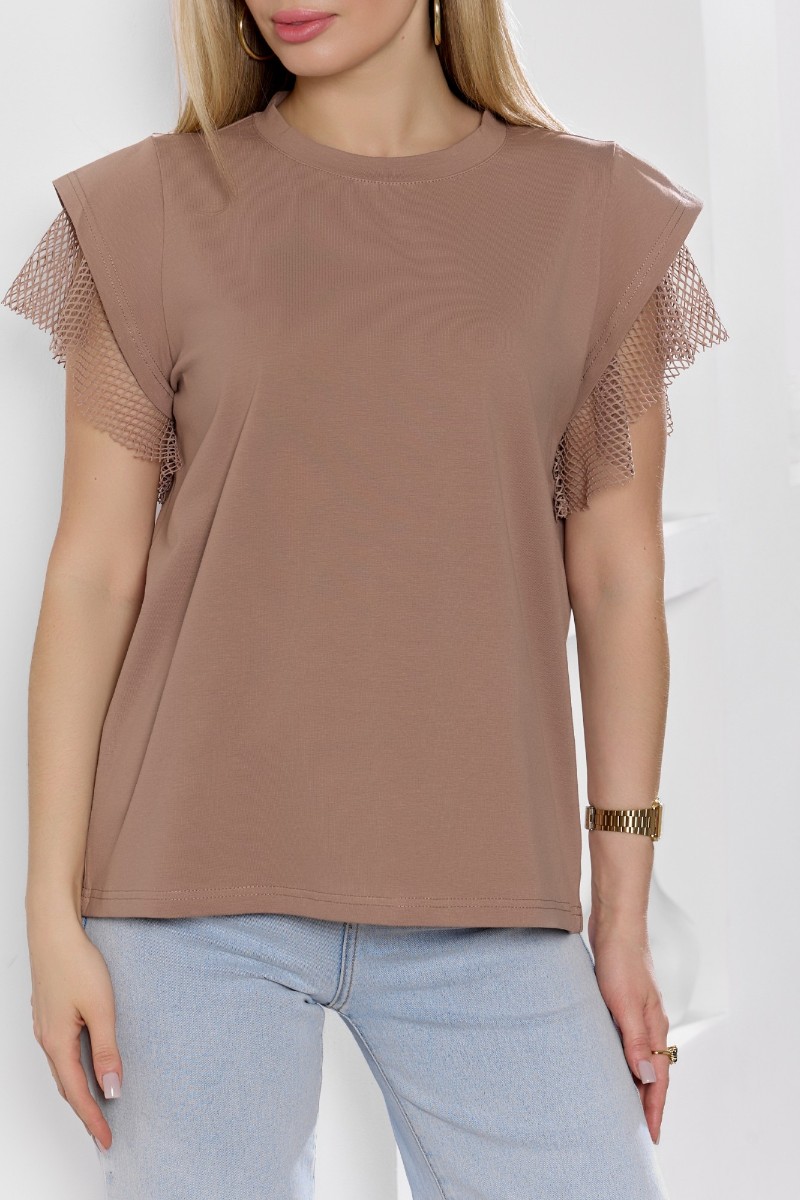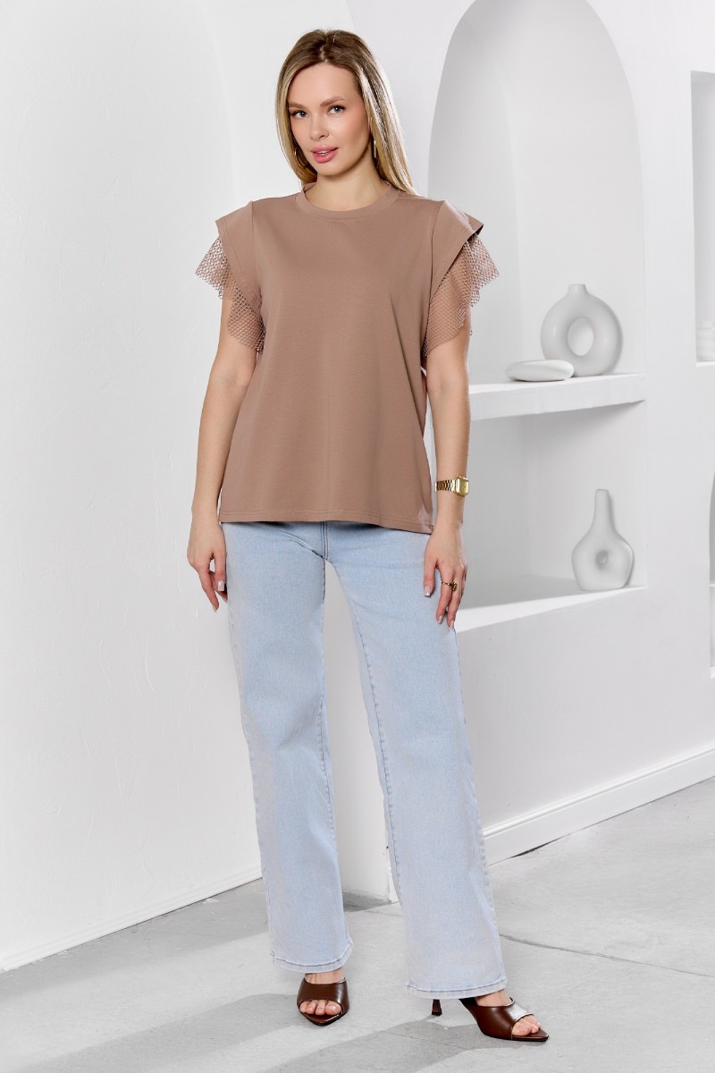 Представляем Вашему вниманию женскую футболку из гладкокрашеного полотна «кулирка» с лайкрой свободного кроя, с горловиной овальной формы, обработанной втачной планкой из основного материала. Особенностью модели являются двойные втачные рукава - «крылышки», выполненные из основного материала и «сетки стрейч» с крупными ячейками. За счет полупрозрачного свойства «сетки», рукава выглядят «воздушными» и легкими.