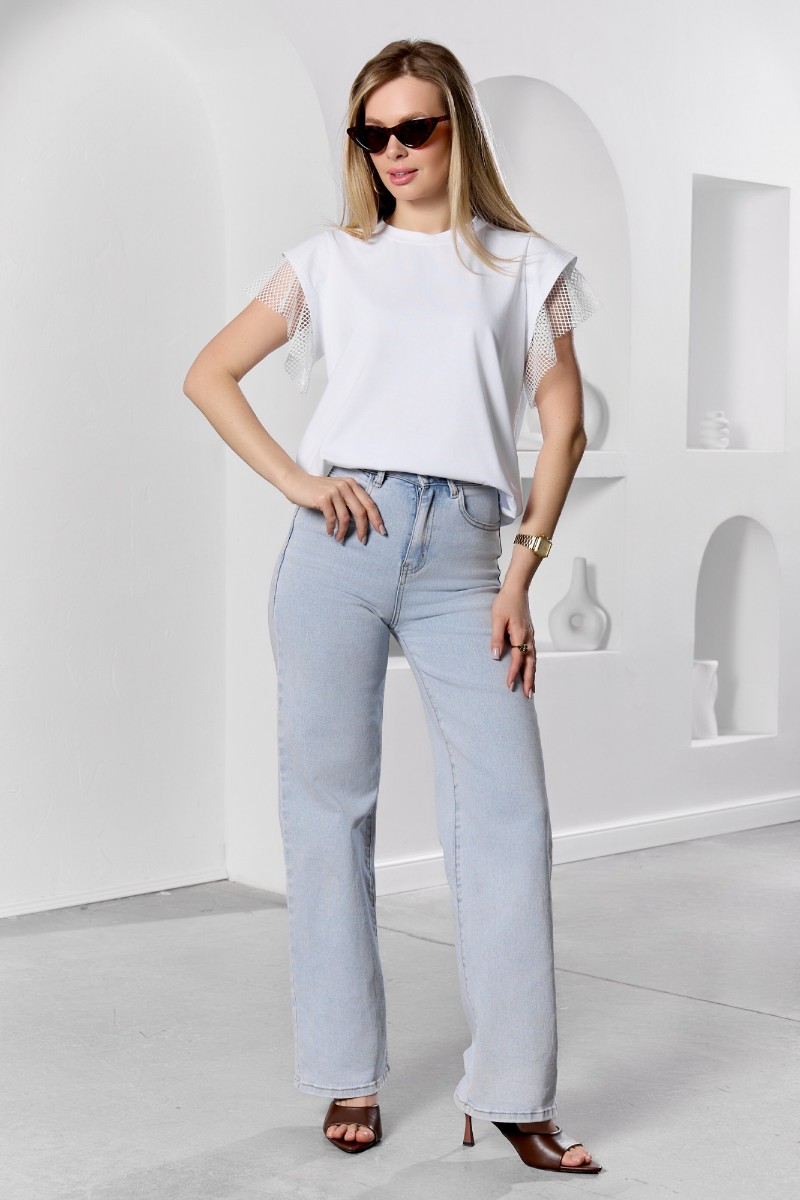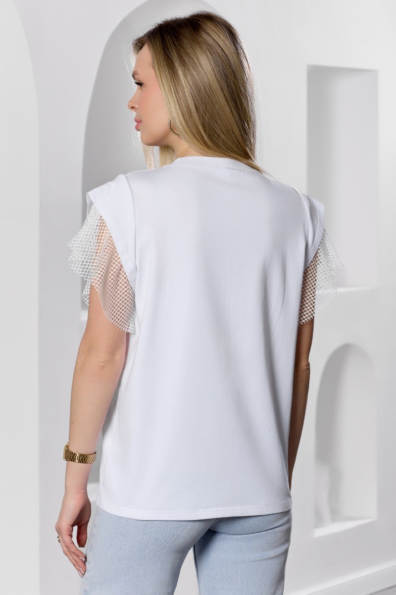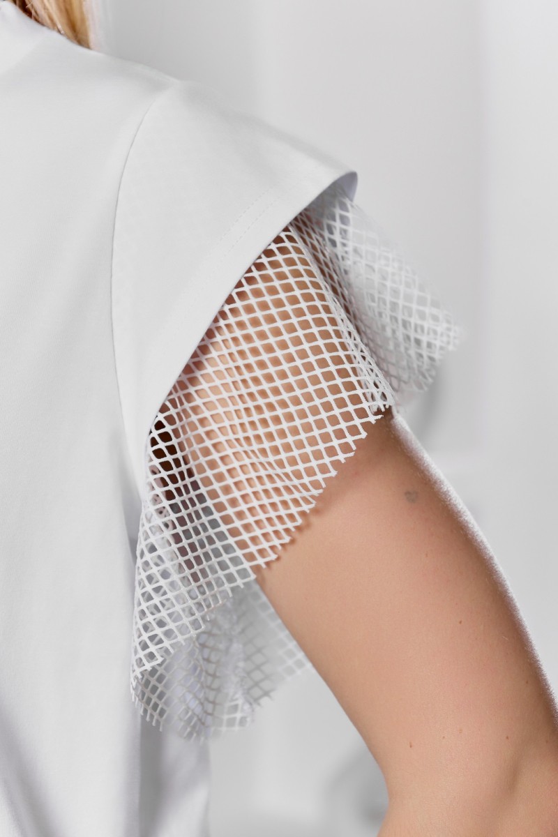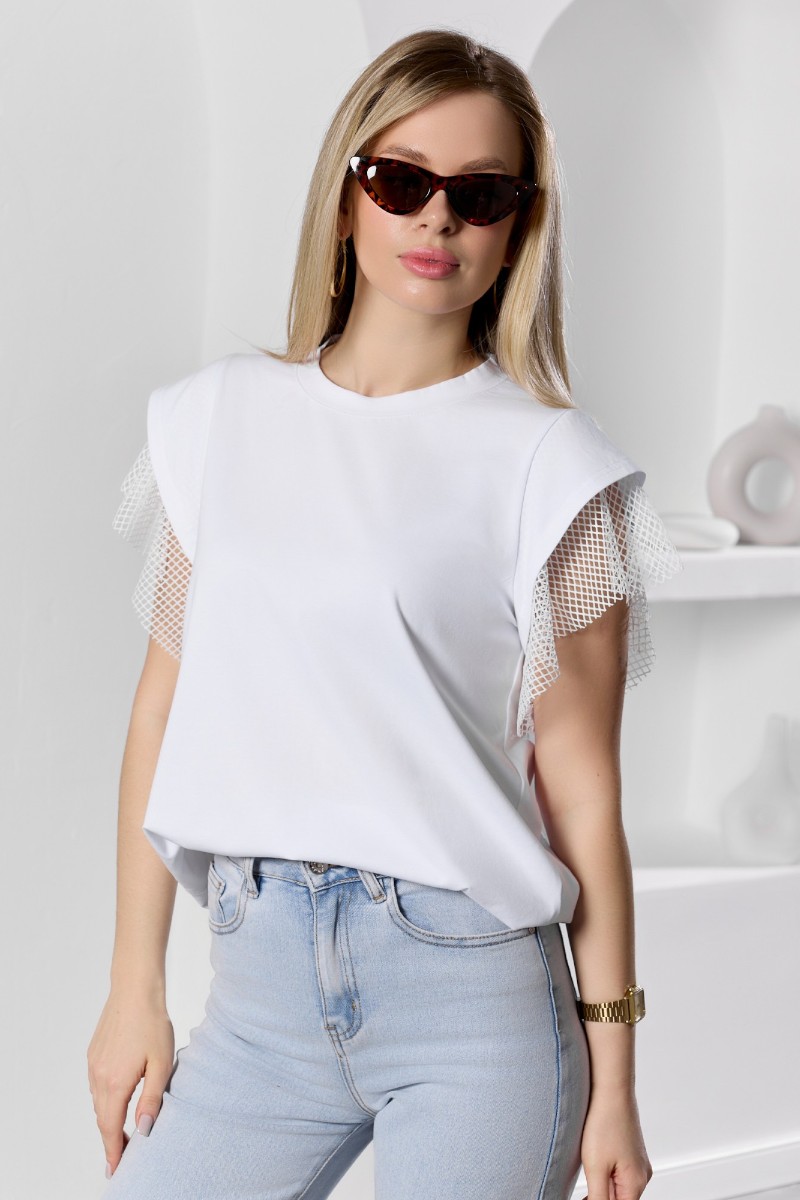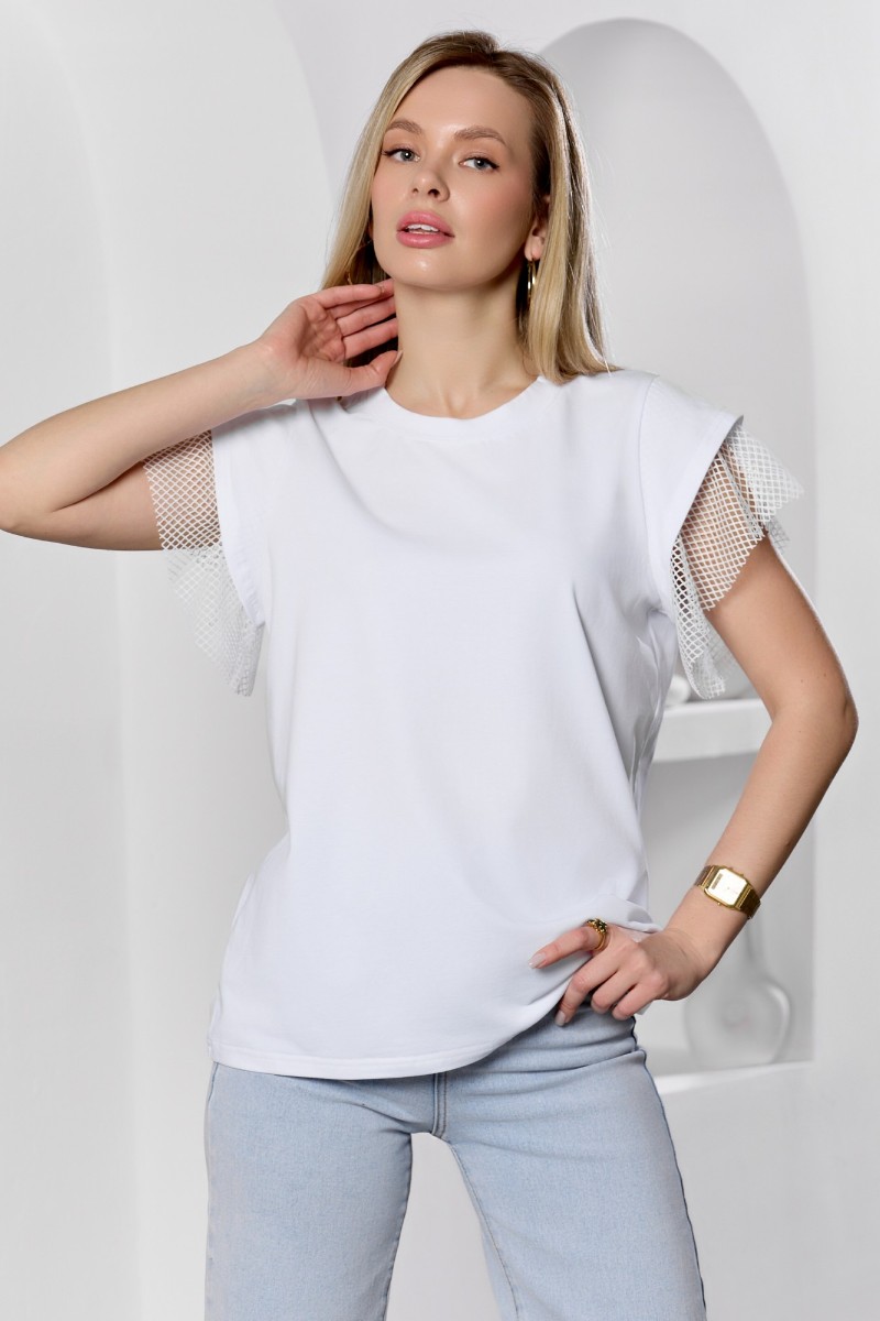 Представляем Вашему вниманию женскую футболку из гладкокрашеного полотна «кулирка» с лайкрой свободного кроя, с горловиной овальной формы, обработанной втачной планкой из основного материала. Особенностью модели являются двойные втачные рукава - «крылышки», выполненные из основного материала и «сетки стрейч» с крупными ячейками. За счет полупрозрачного свойства «сетки», рукава выглядят «воздушными» и легкими.