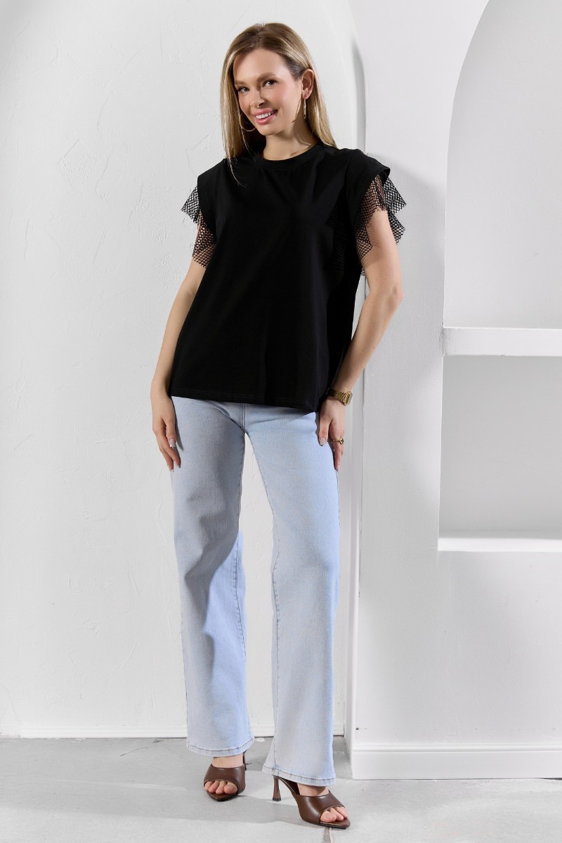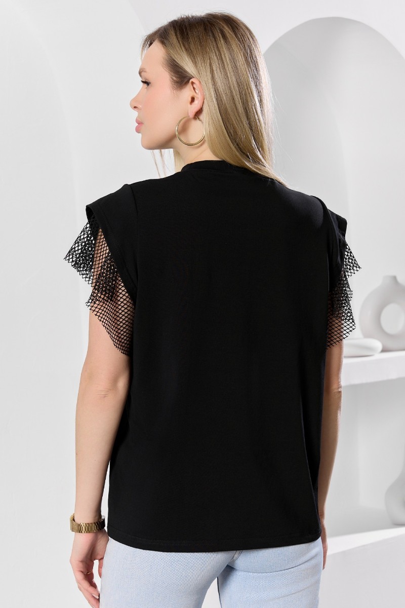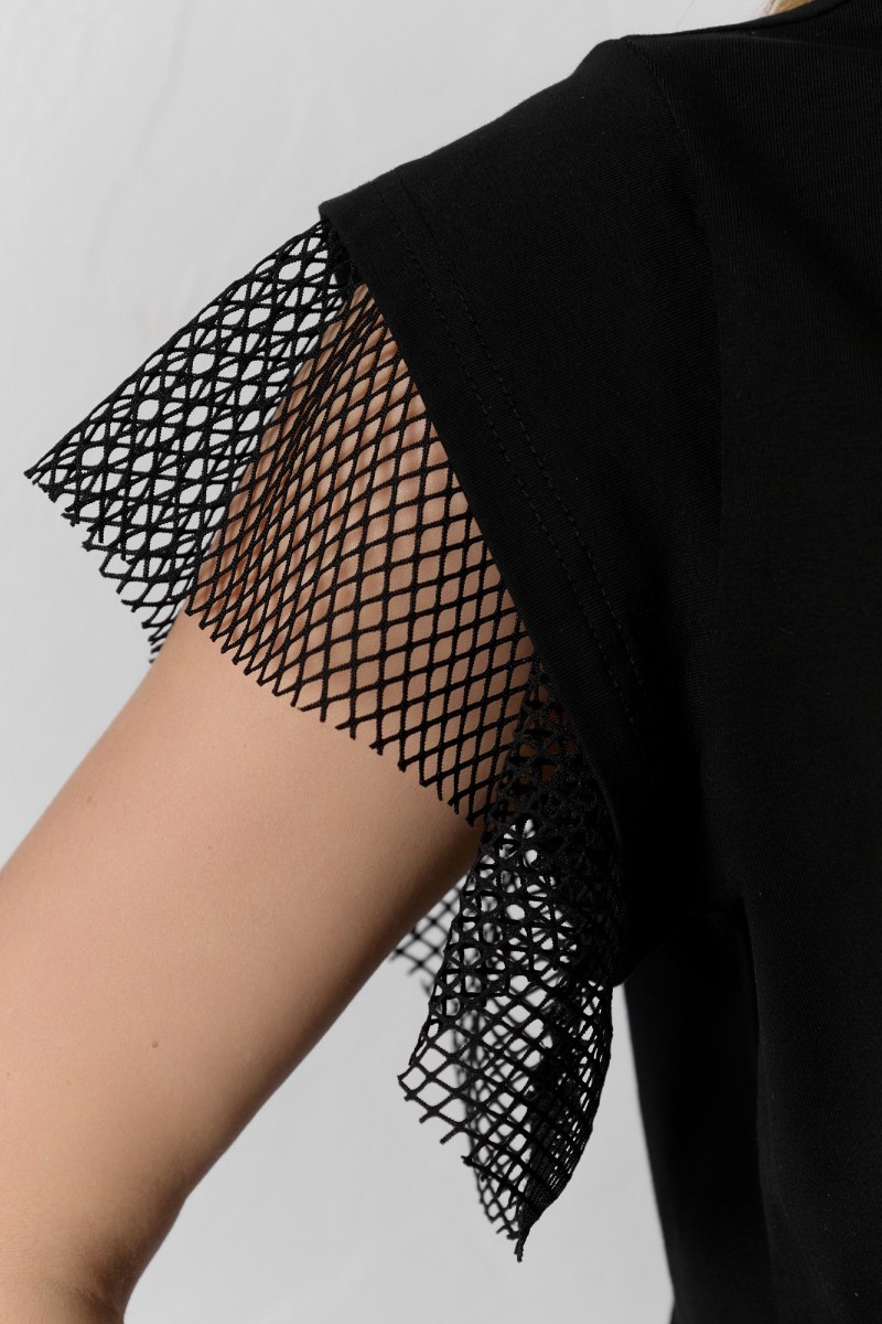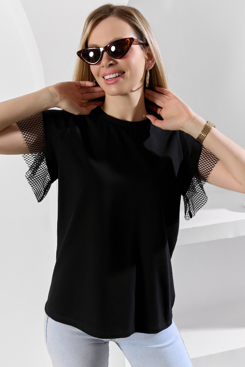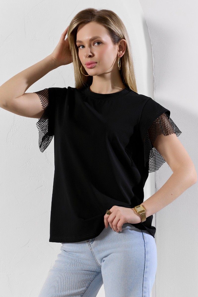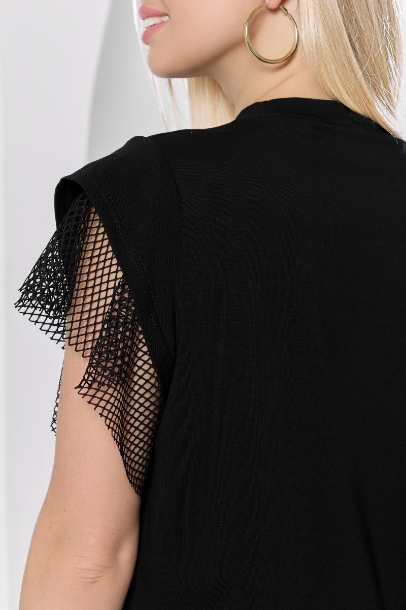 Представляем Вашему вниманию женскую футболку из гладкокрашеного полотна «кулирка» с лайкрой свободного кроя, с горловиной овальной формы, обработанной втачной планкой из основного материала. Особенностью модели являются двойные втачные рукава - «крылышки», выполненные из основного материала и «сетки стрейч» с крупными ячейками. За счет полупрозрачного свойства «сетки», рукава выглядят «воздушными» и легкими.