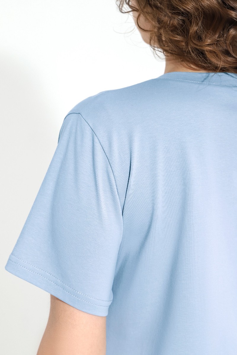 Представляем Вашему вниманию футболку из гладкокрашеного трикотажного полотна «кулирка с лайкрой» классического покроя, с короткими втачными рукавами, горловиной V-образной формы, обработанной втачной планкой и принтом на полочке.