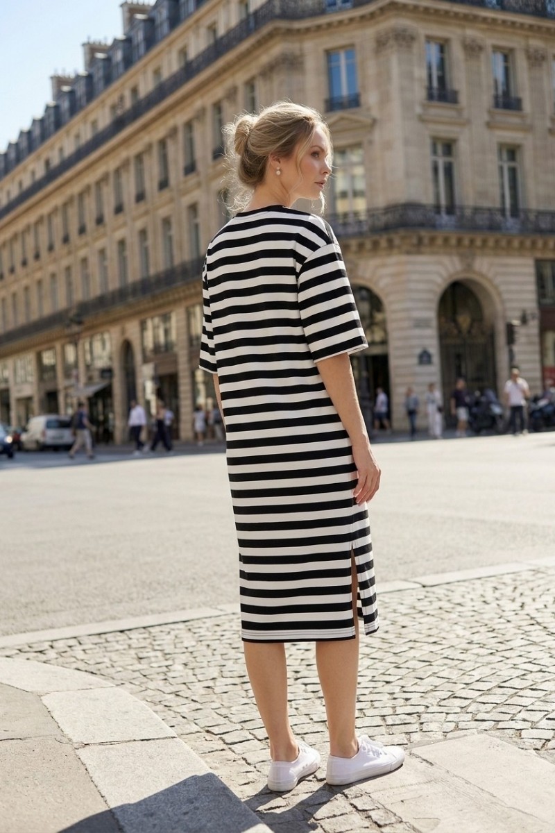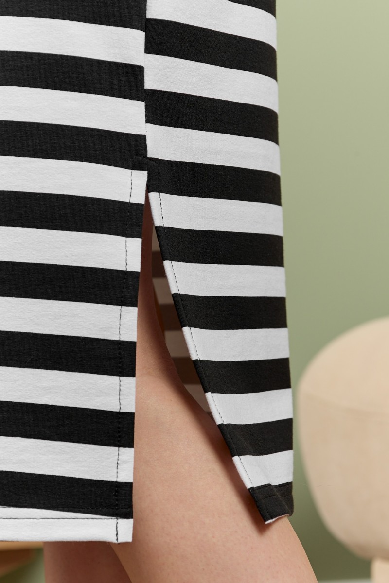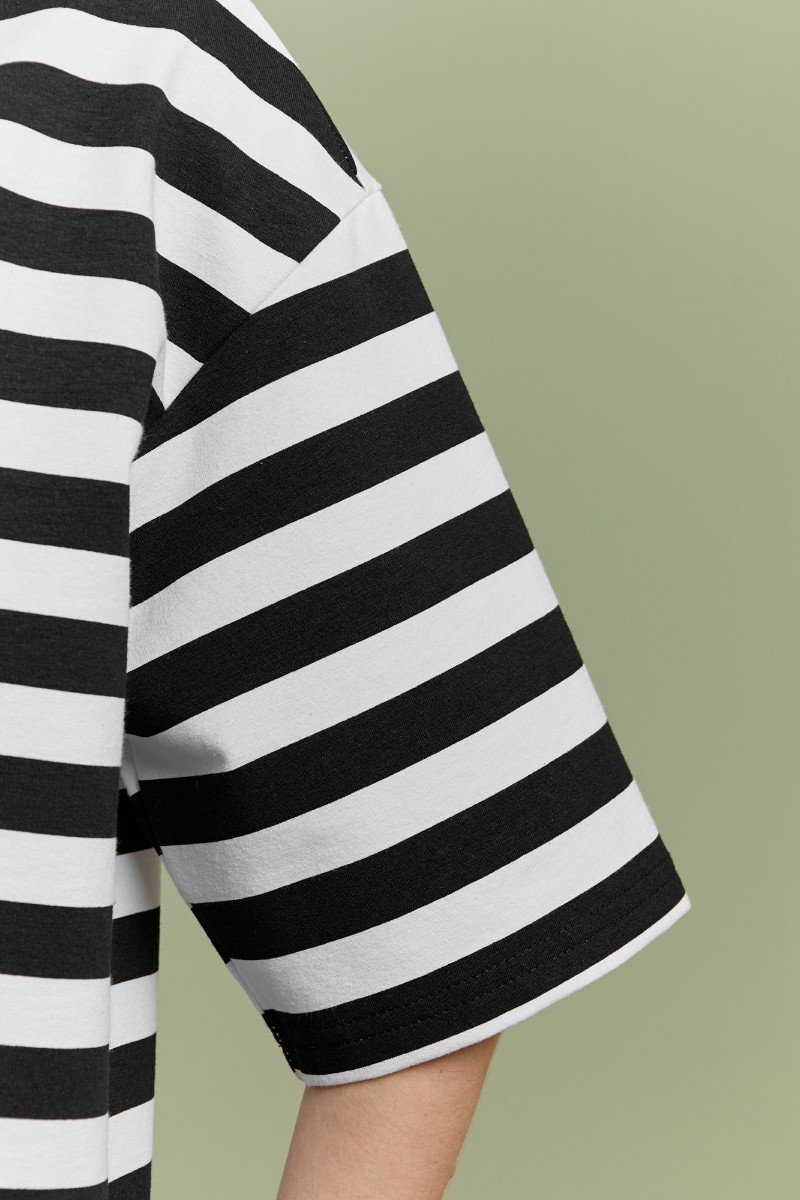 Представляем Вашему вниманию женскую тунику из трикотажного полотна «футер двунитка» с набивным рисунком «полоса», свободного покроя, с короткими втачными рукавами, горловиной овальной формы, обработанной втачной планкой и разрезами в боковых швах. На полочке выполнен принт в технике «шелкографии».