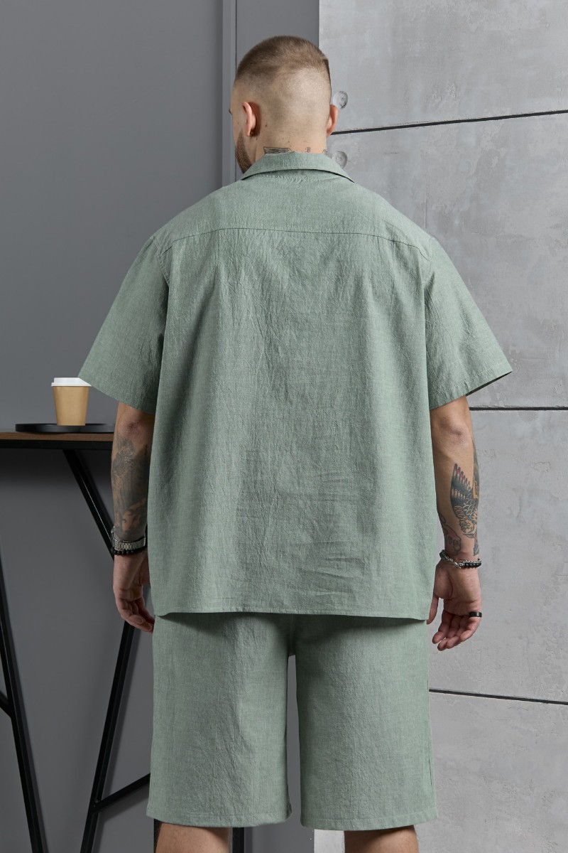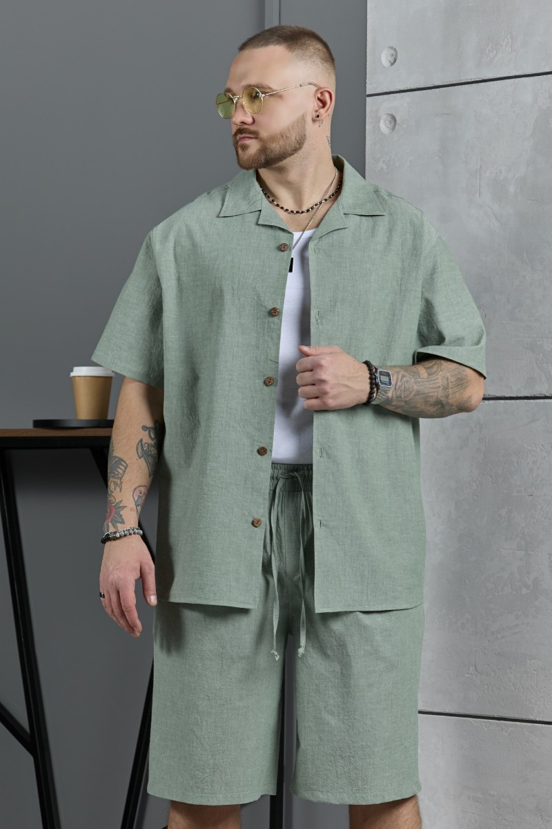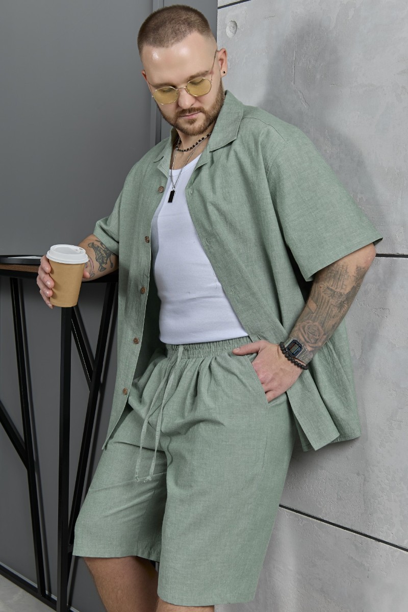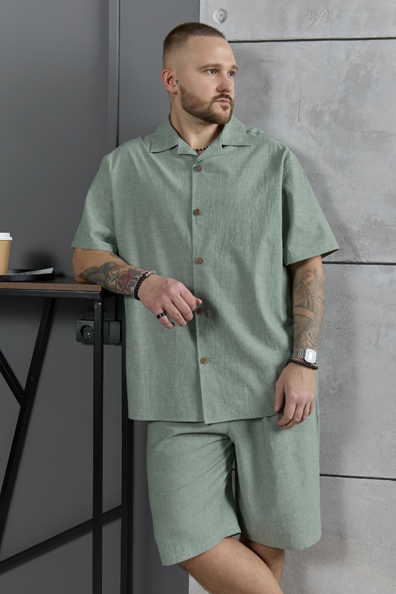 Представляем Вашему вниманию костюм мужской, состоящий их рубашки и шорт из гладкокрашеного фактурного полотна. Рубашка - с короткими втачными рукавами, стояче-отложным воротником и центральной бортовой застежкой на обметанные петли и пуговицы. Спинка - с притачной кокеткой. По плечевым швам, воротнику, кокетке и швам втачивания рукавов настрочены отделочные строчки. Нижние срезы изделия и рукавов обработаны подгибкой. Шорты - удлиненные, на притачном поясе с эластичной тесьмой внутри и карманами в боковых шва. Средний шов переда обработан с имитацией застежки "гульфик". Для регулирования степени прилегания изделия по талии предусмотрен шнурок вставленный в пояс через две обметанные петли. Нижние срезы обработаны подгибкой.